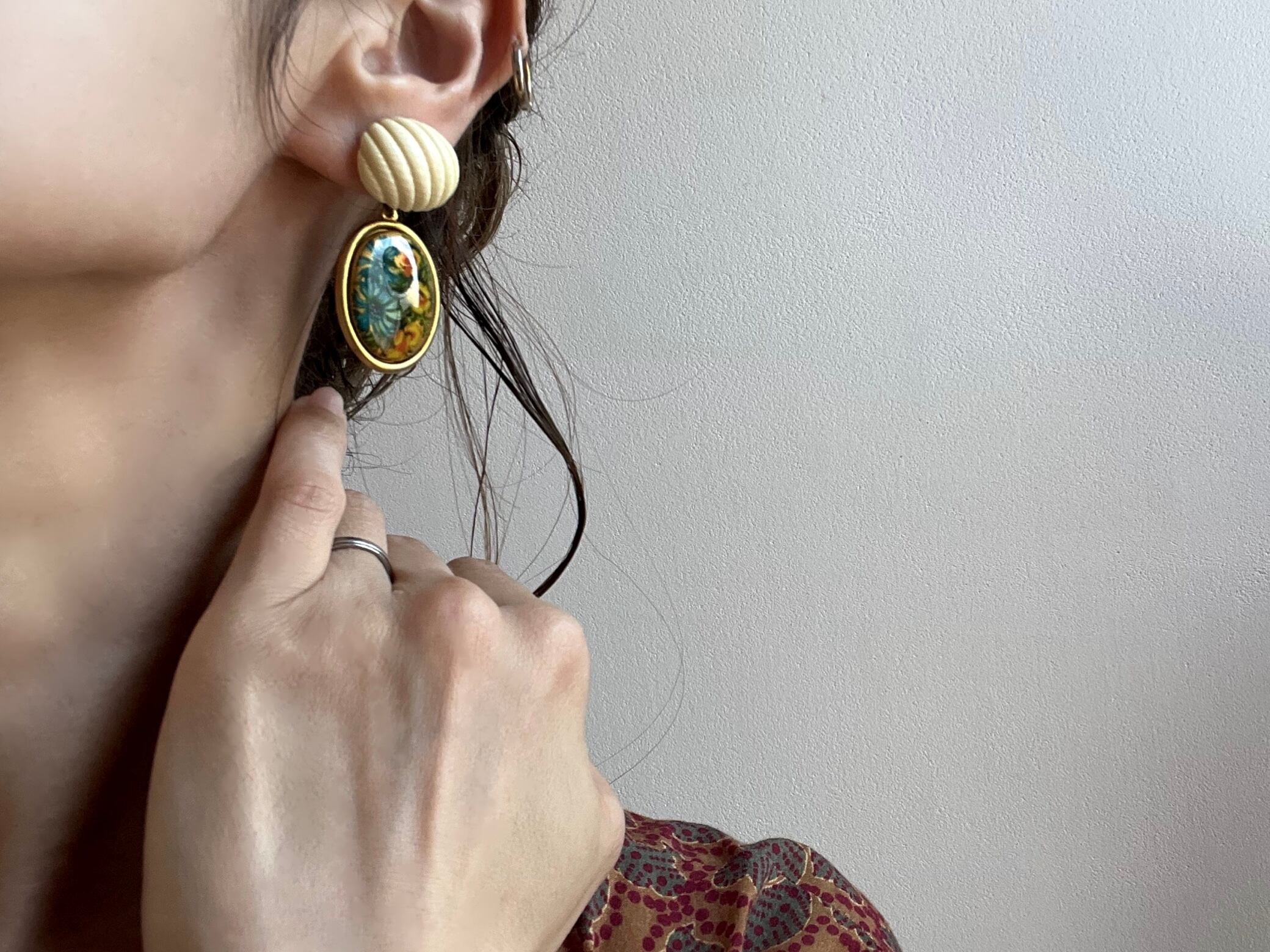 鮮やかなボタニカルプリントカボションに、象牙のような雰囲気のガゼインカボションを合わせました。