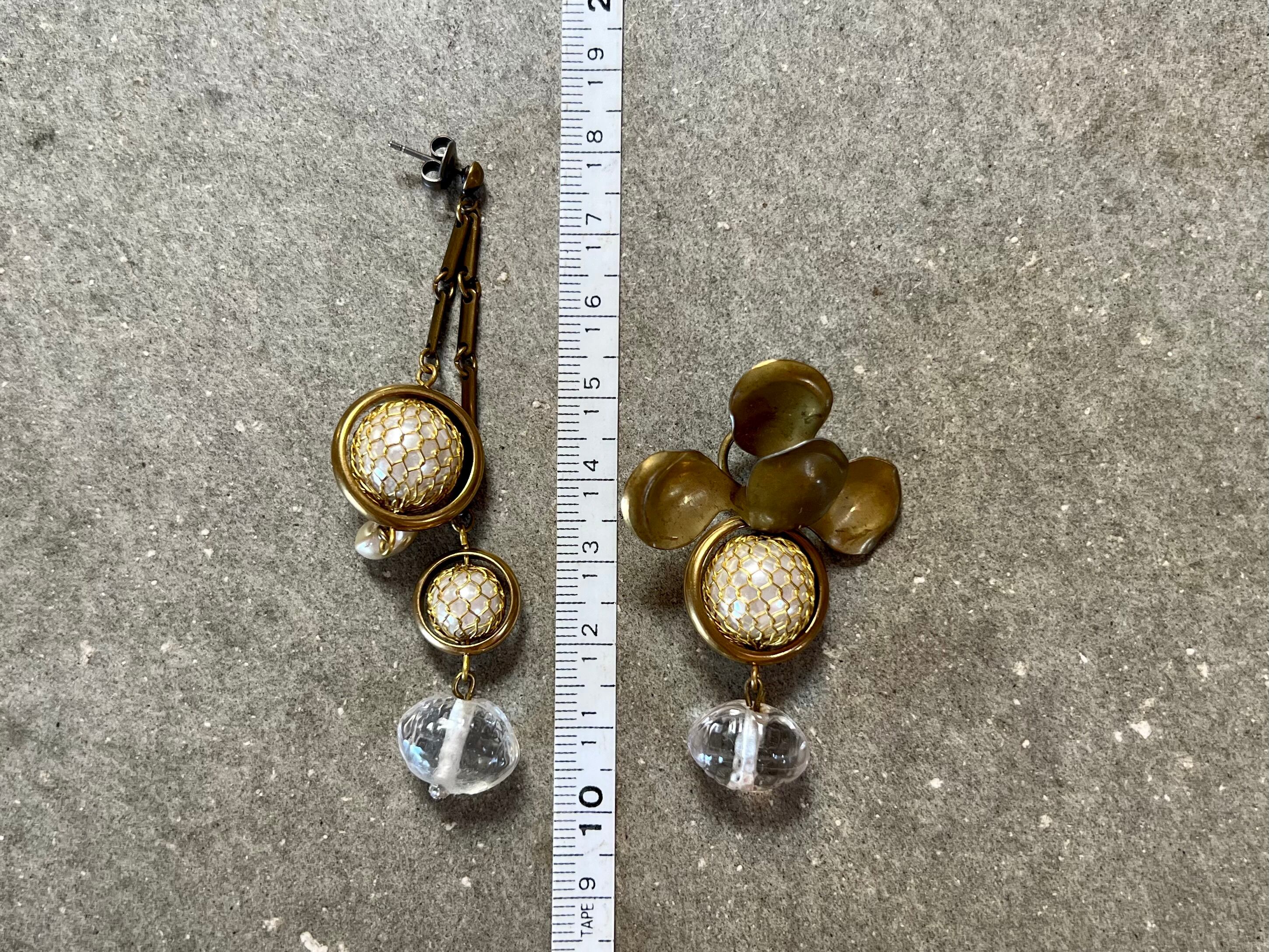 ヴィンテージパーツを使用してアシンメトリーなピアスを作りました。