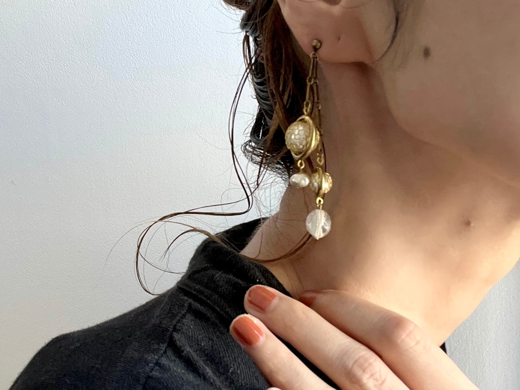 花弁パーツやメッシュパール、ガラス、淡水パールなど、様々なエレメントがギュッと凝縮されています。