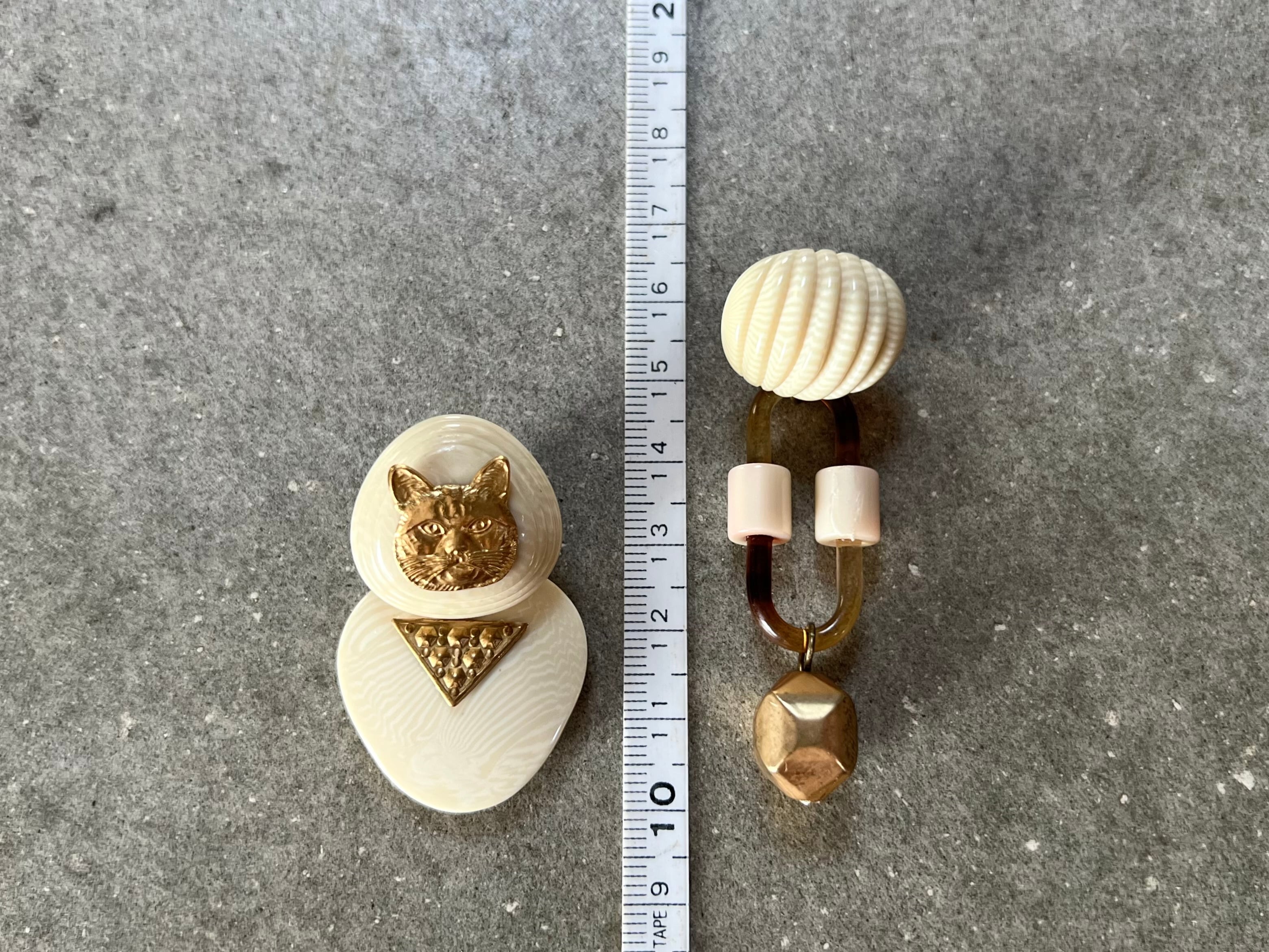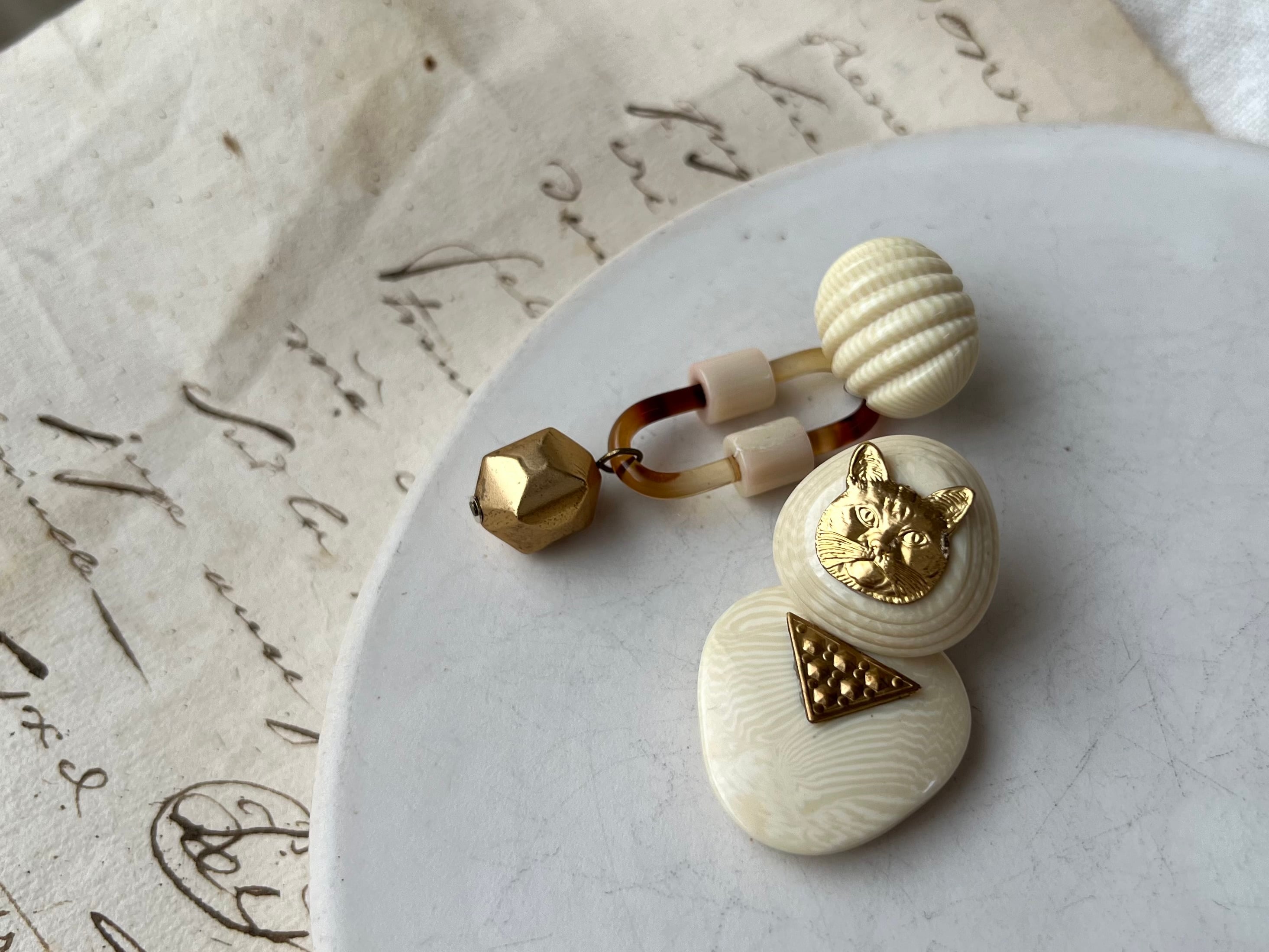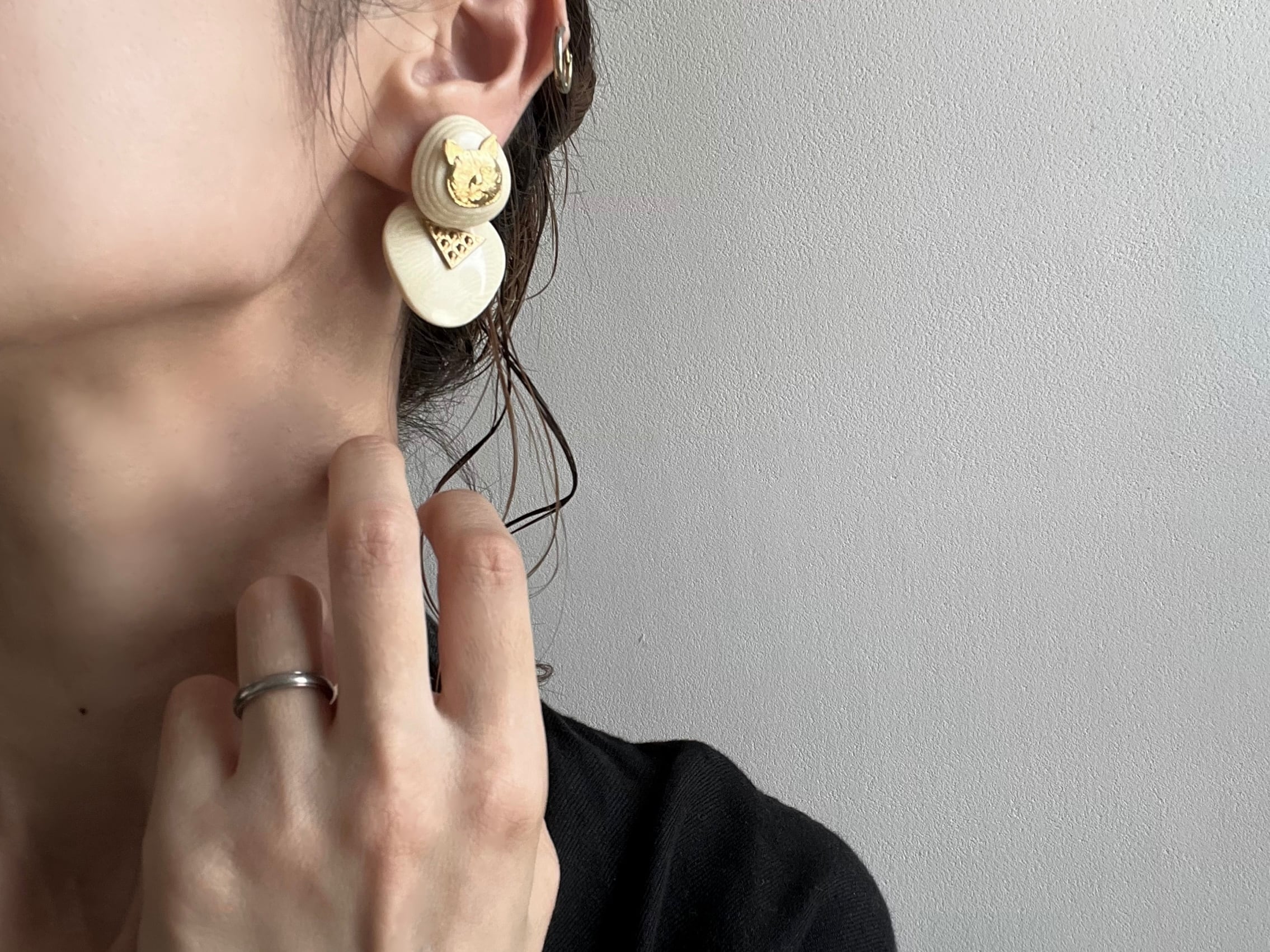 左右デザインの違うラクトカボションに、それぞれ個性の強いパーツやチャームを添えています。