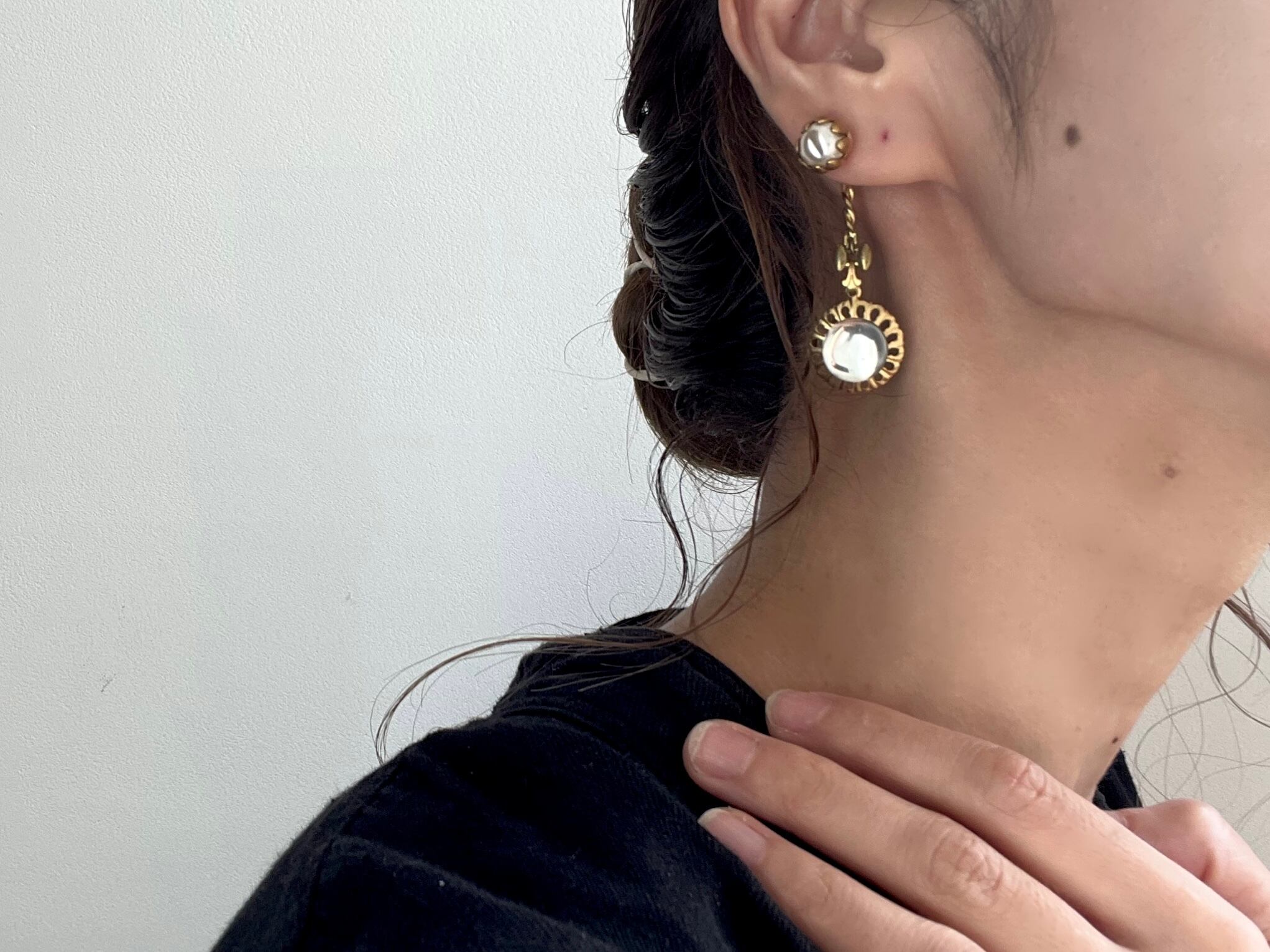 ヴィンテージパーツを使用してアシンメトリーなピアスを作りました。
