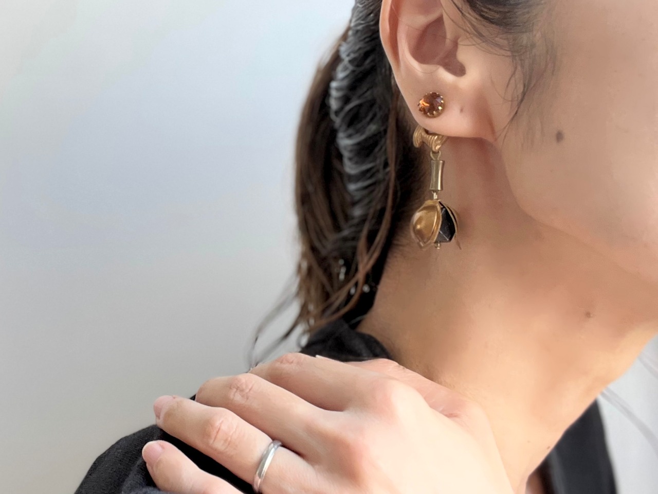 華やかなボタニカルパーツを使用しつつ、ブラックと銅褐色をバランスよく配置した、シックで大人っぽい印象の一品です。