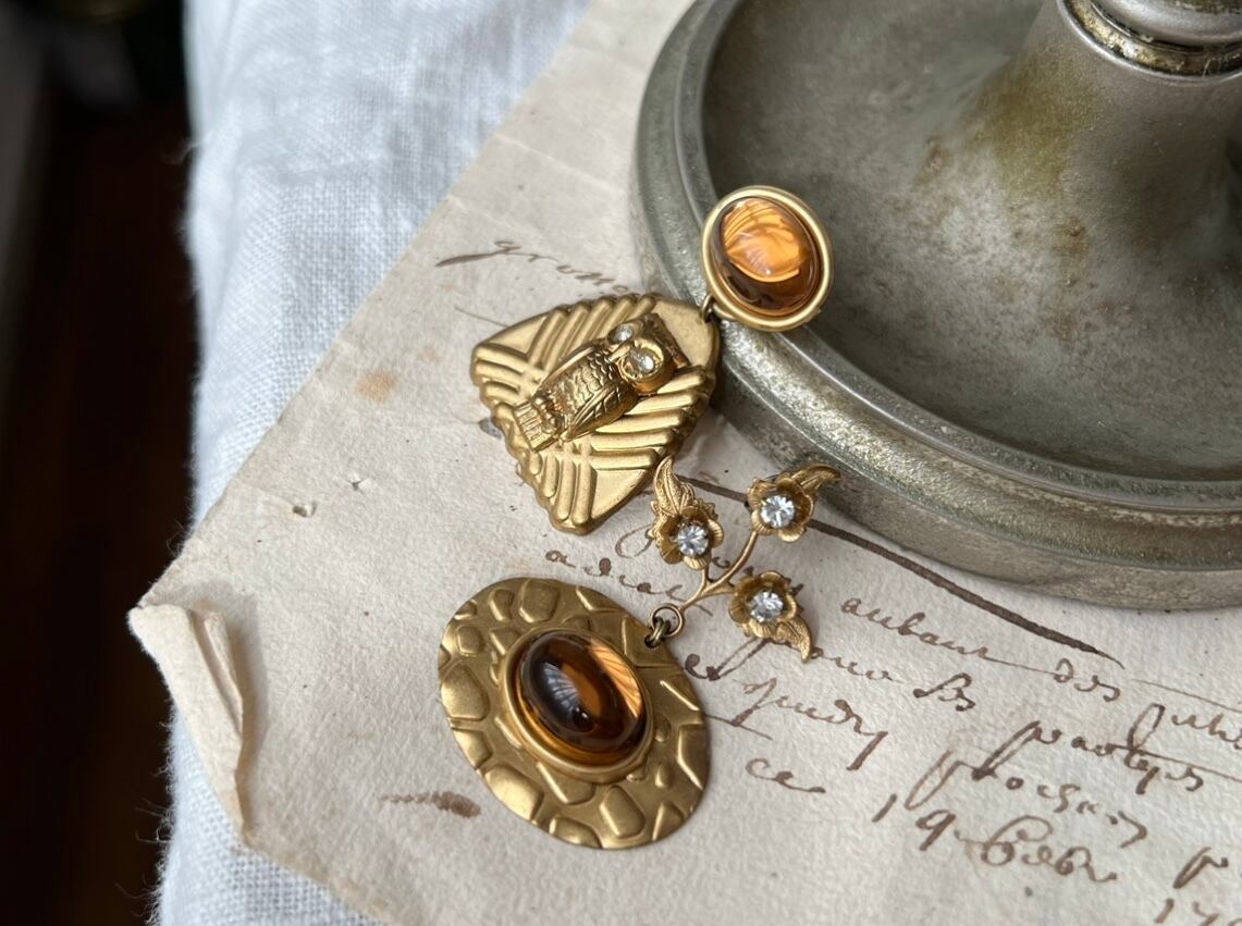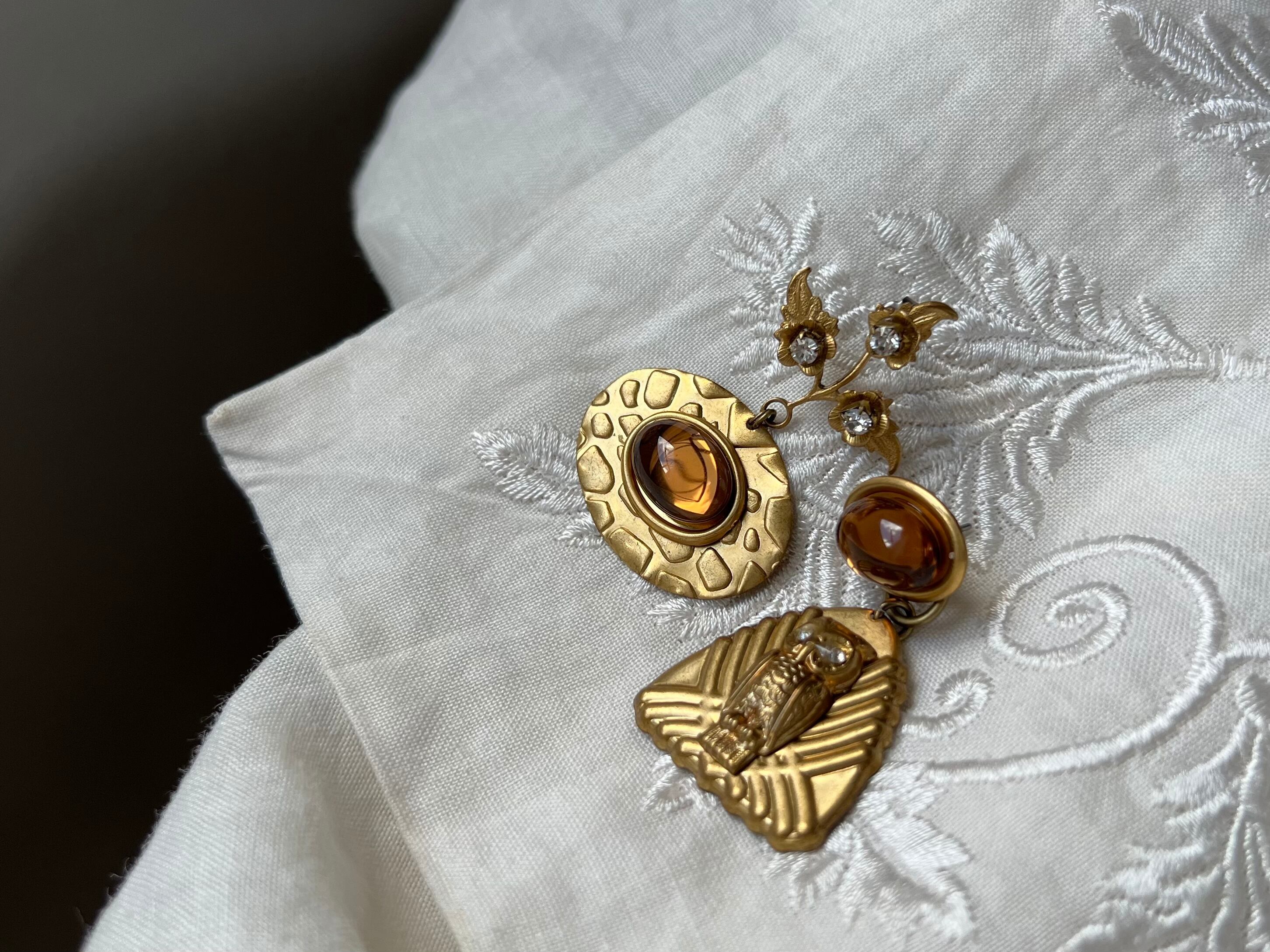 ヴィンテージパーツを使用してアシンメトリーなピアスを作りました。