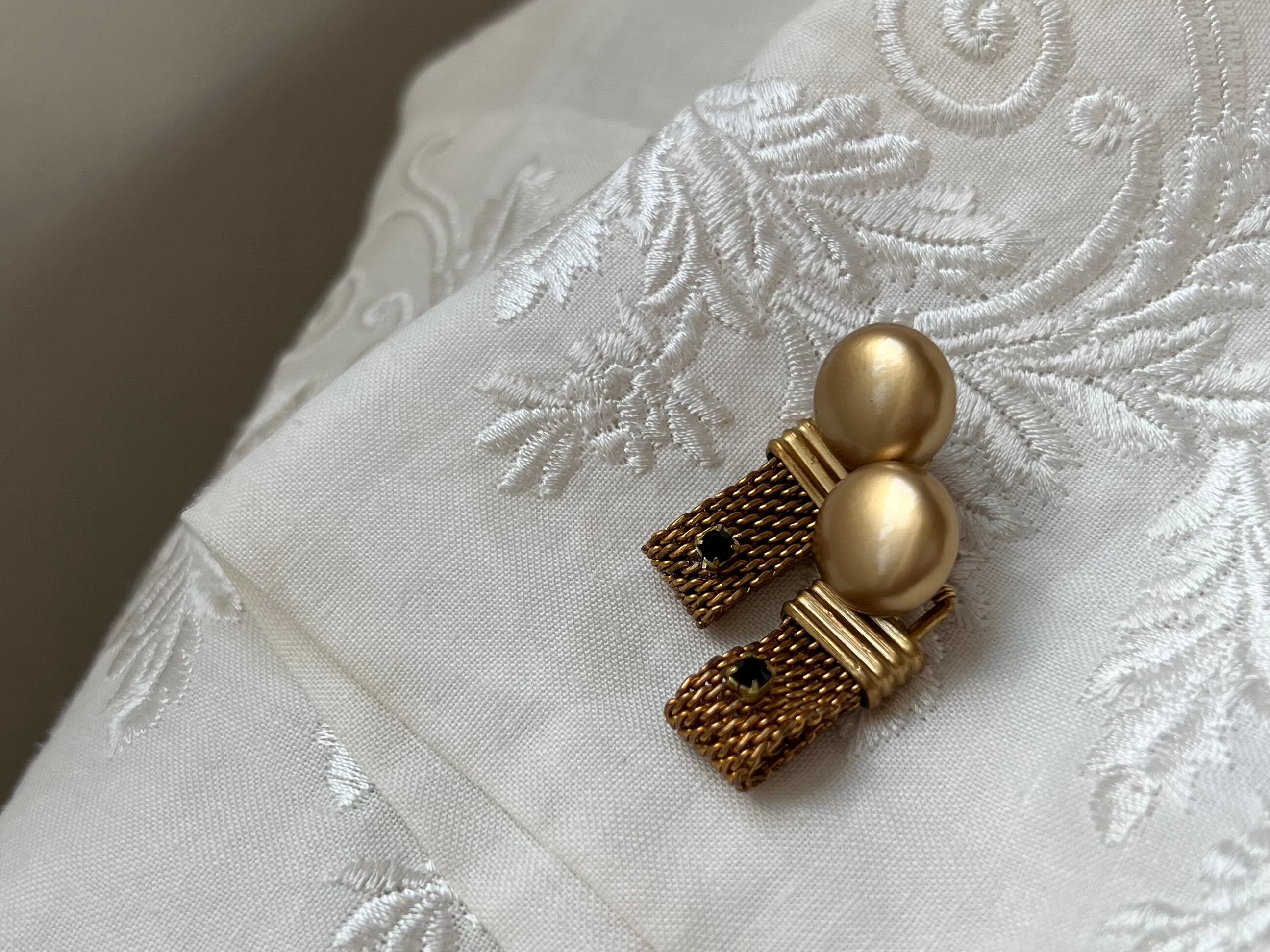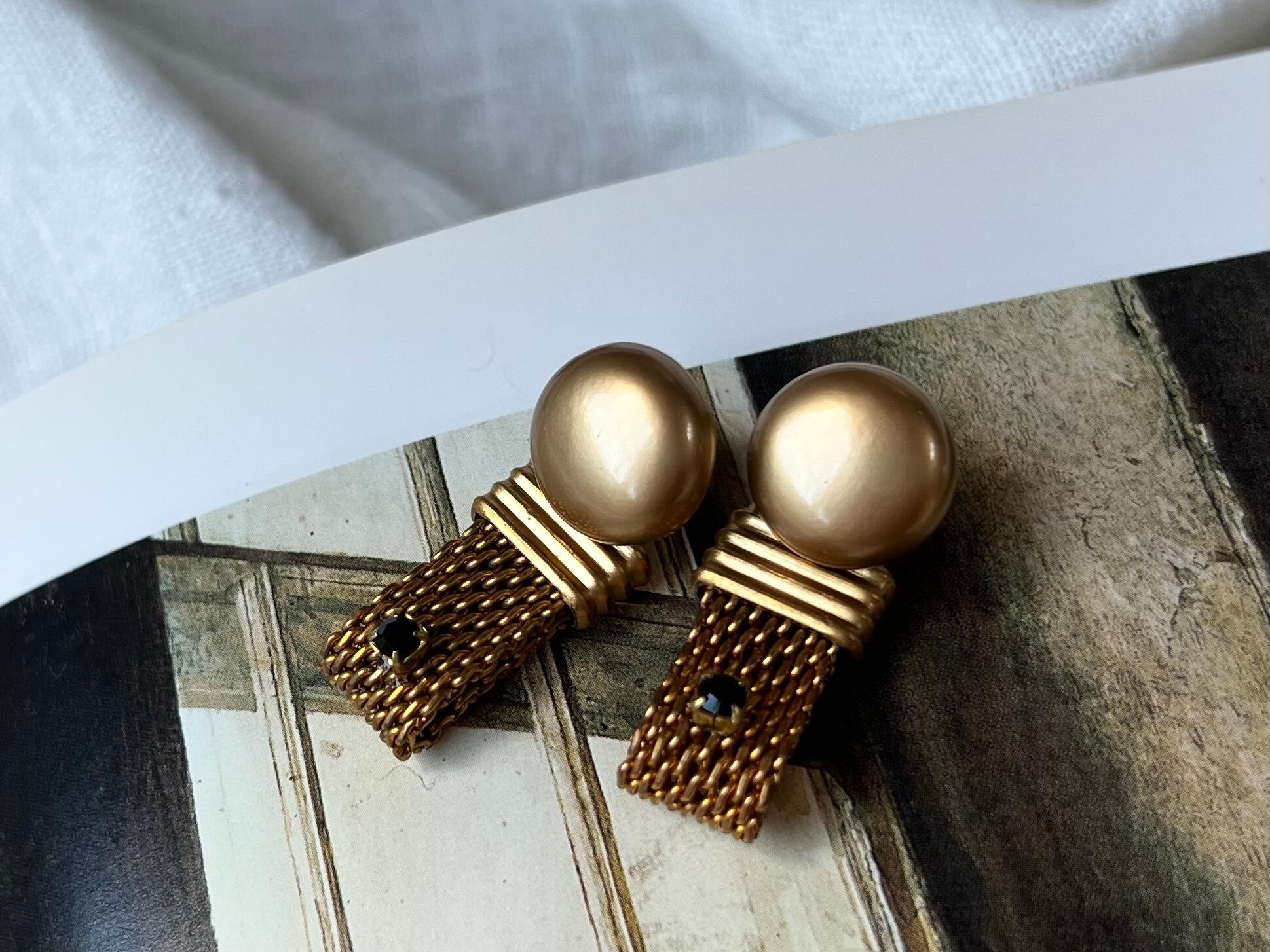 コロンとしたマットゴールドのカボションにリボンチェーンとブラックスワロフスキーを添えたシンプルなデザインで、どんな装いにもマッチします。