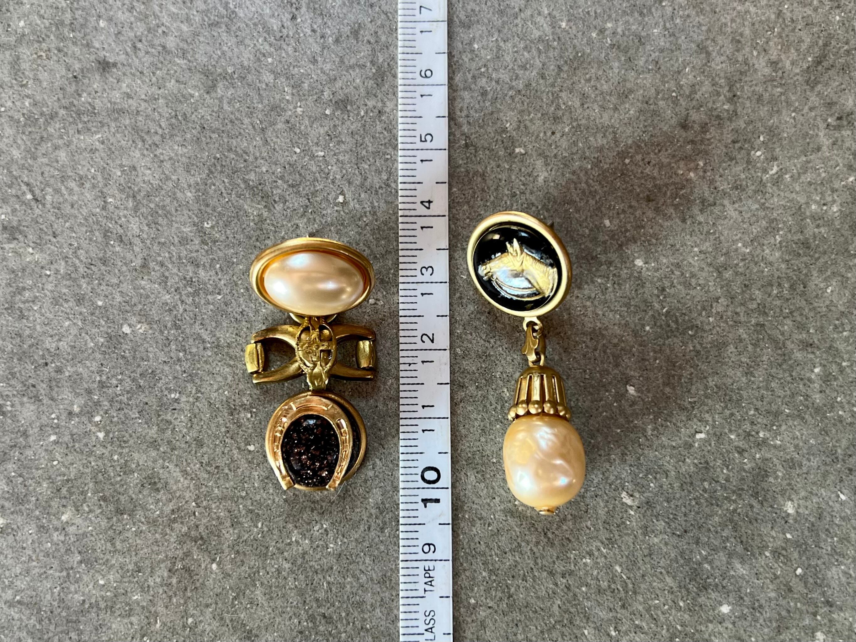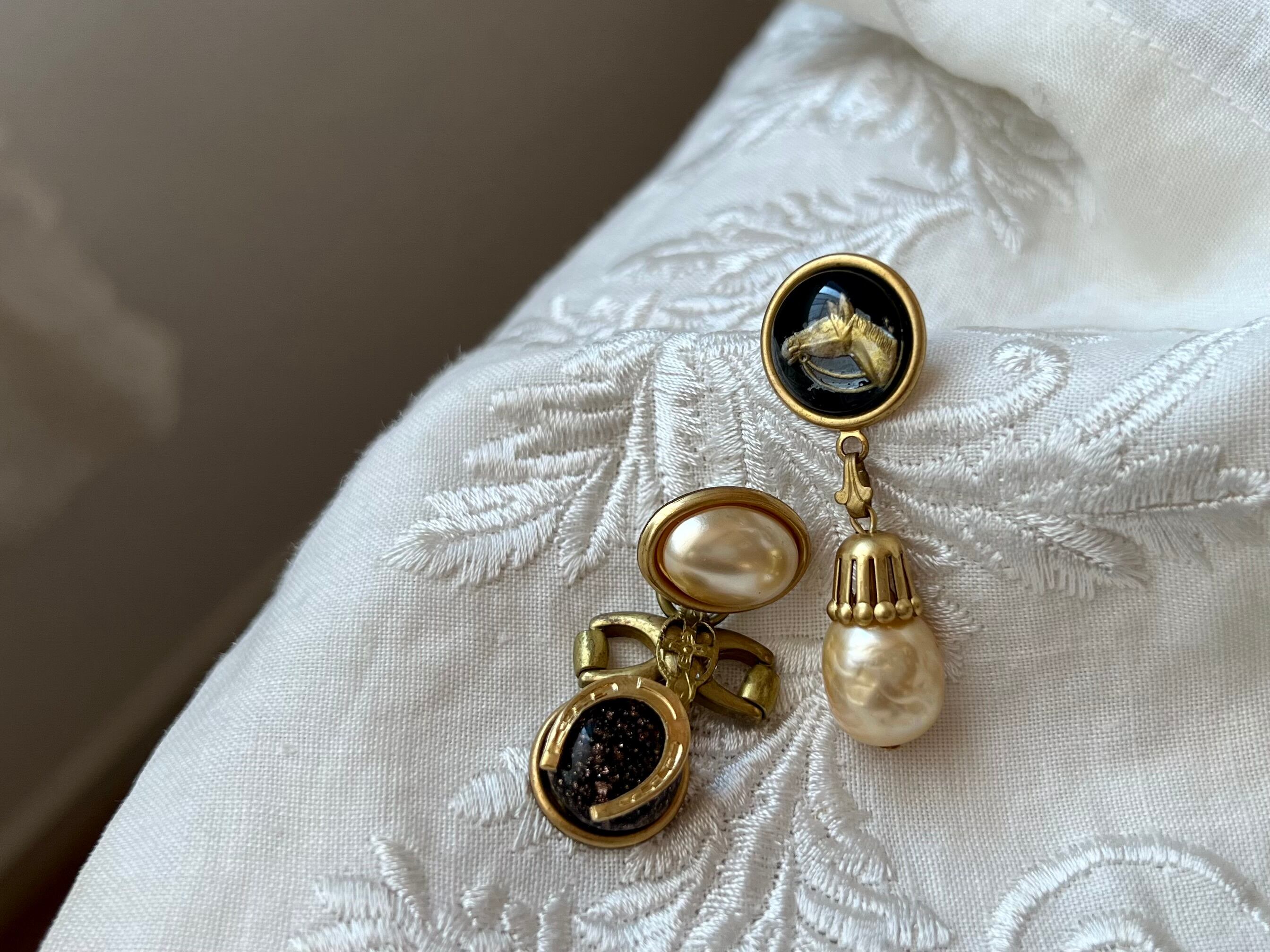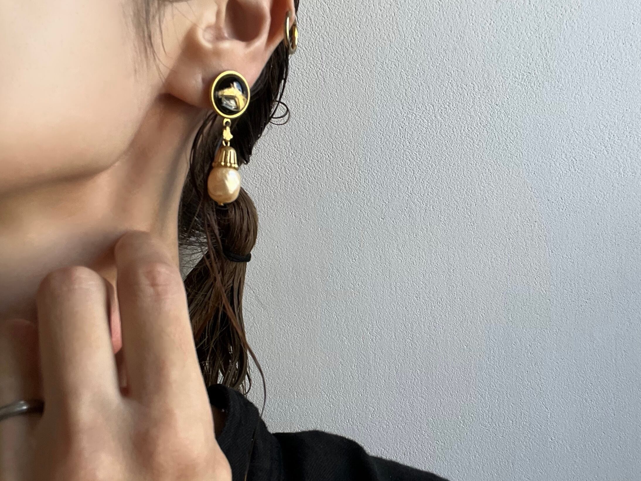 ヴィンテージパーツを使用してアシンメトリーなピアスを作りました。