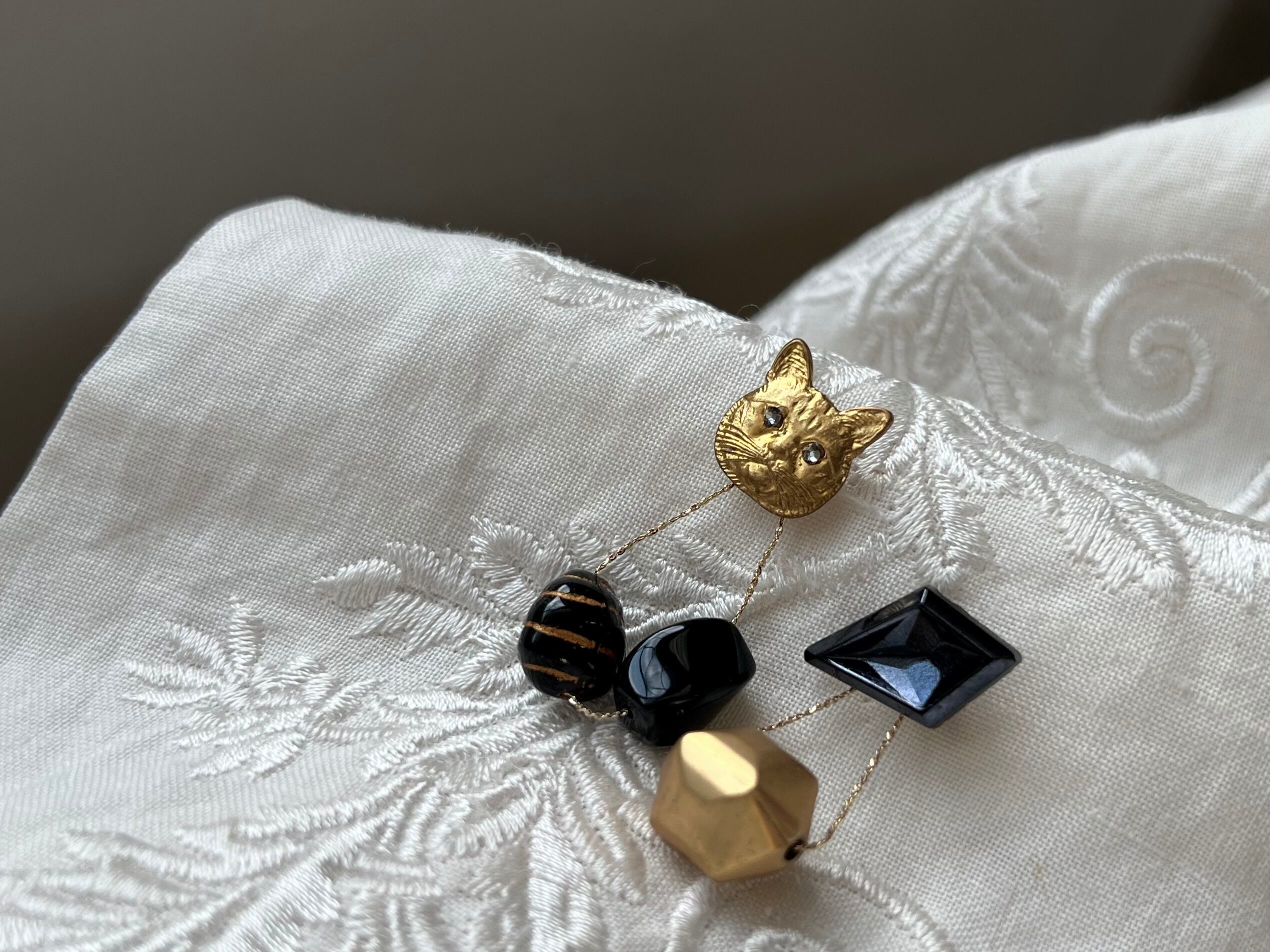 ヴィンテージパーツを使用してアシンメトリーなピアスを作りました。