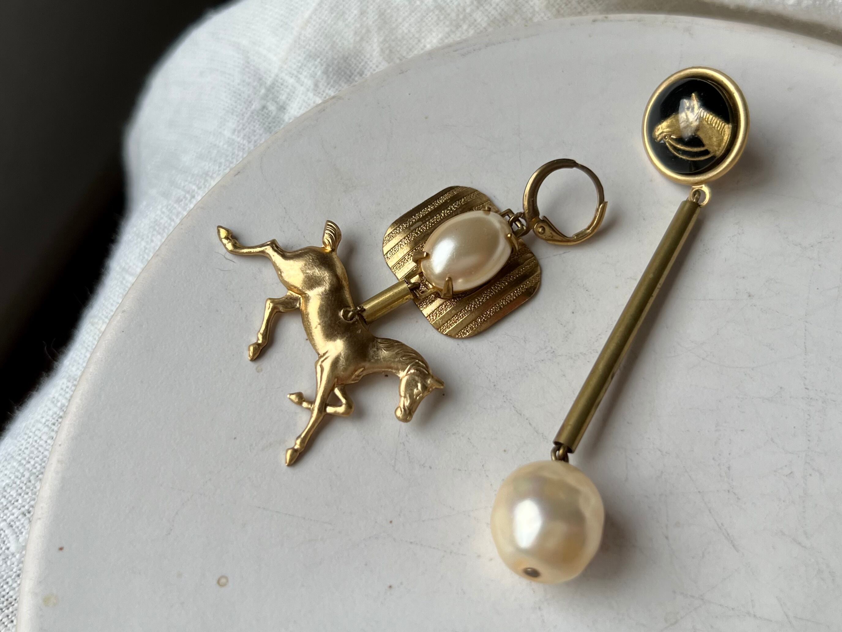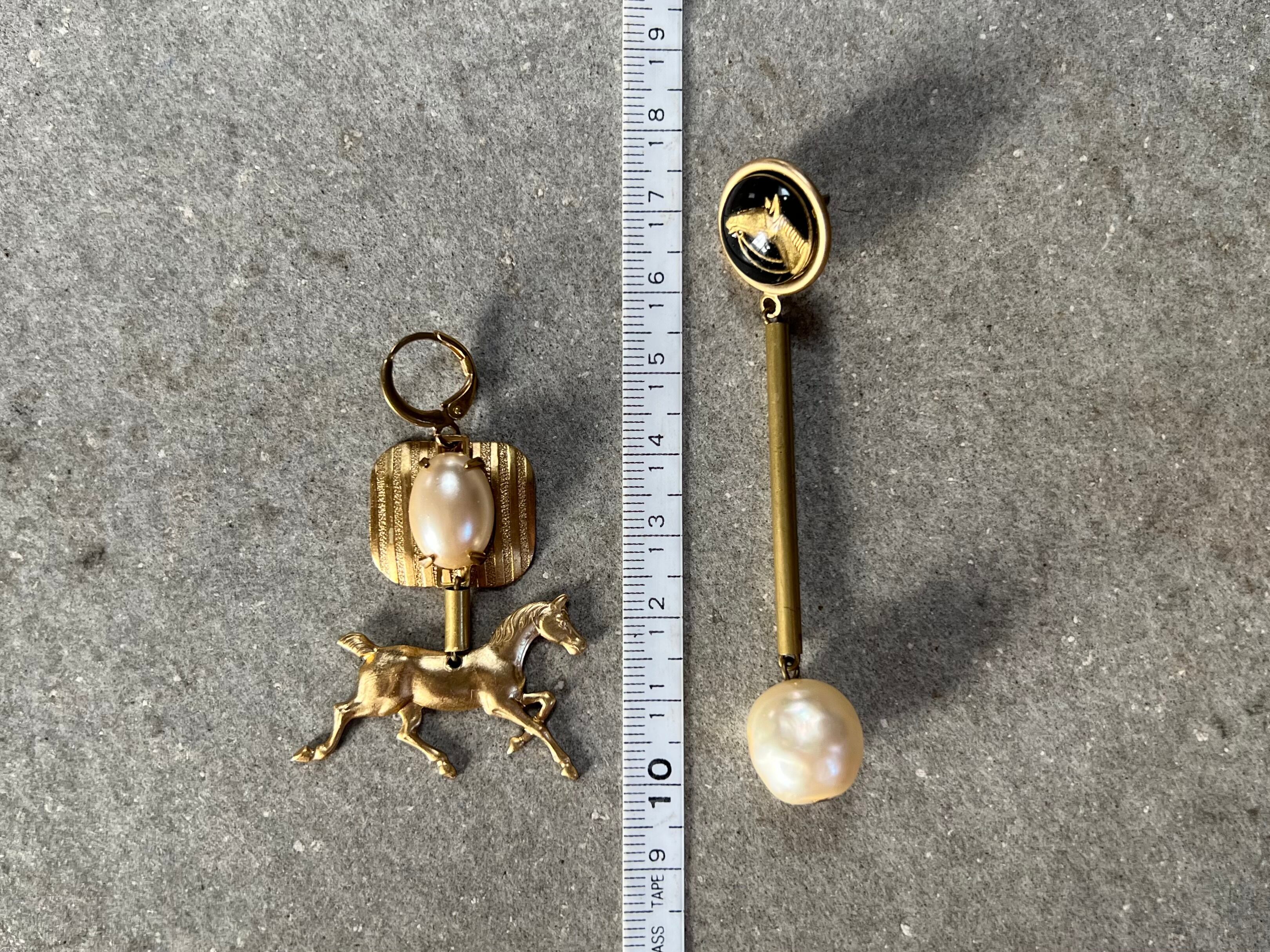 ヴィンテージパーツを使用してアシンメトリーなピアスを作りました。