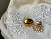 ゴールドのオーバルカボションがクールな雰囲気ですが、ミリアムハスケルの真鍮パーツやパールと組み合わせる事で、ロマンチックな要素も取り入れています。