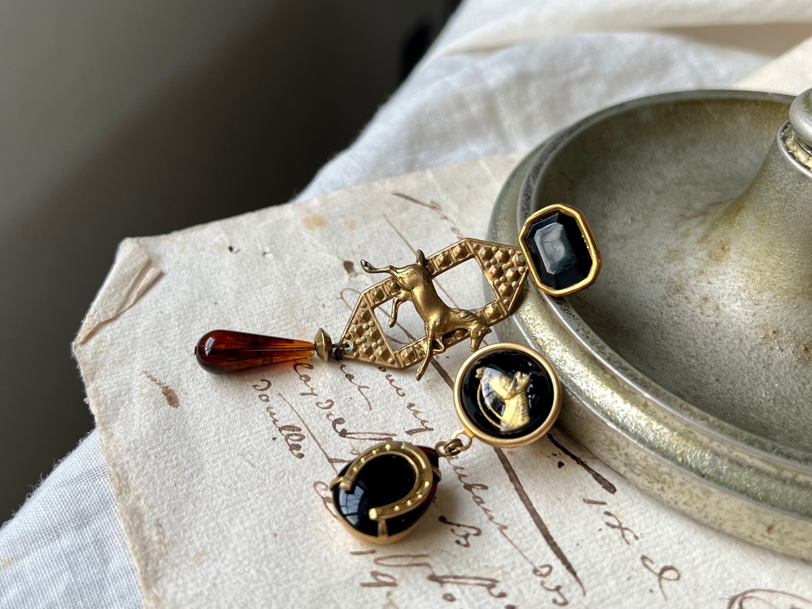 ヴィンテージパーツを使用して、アシンメトリーなピアスを作りました。