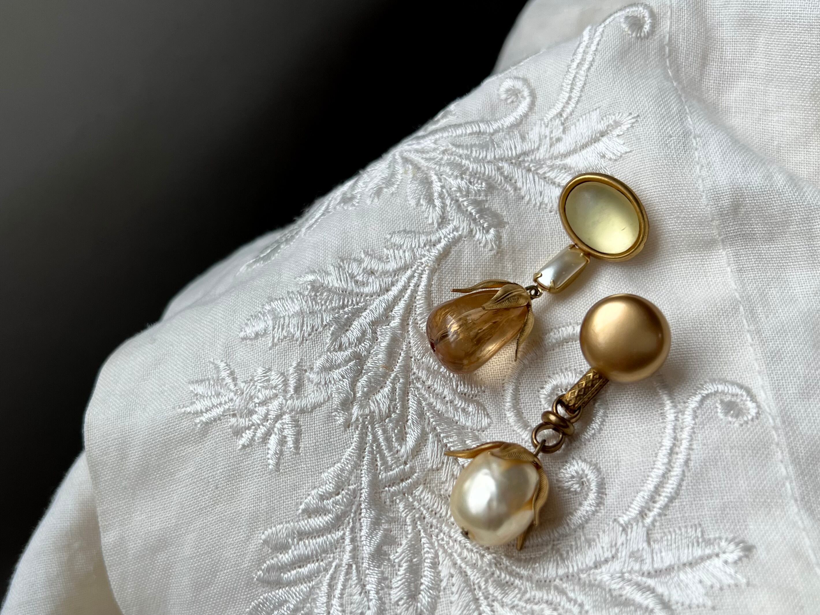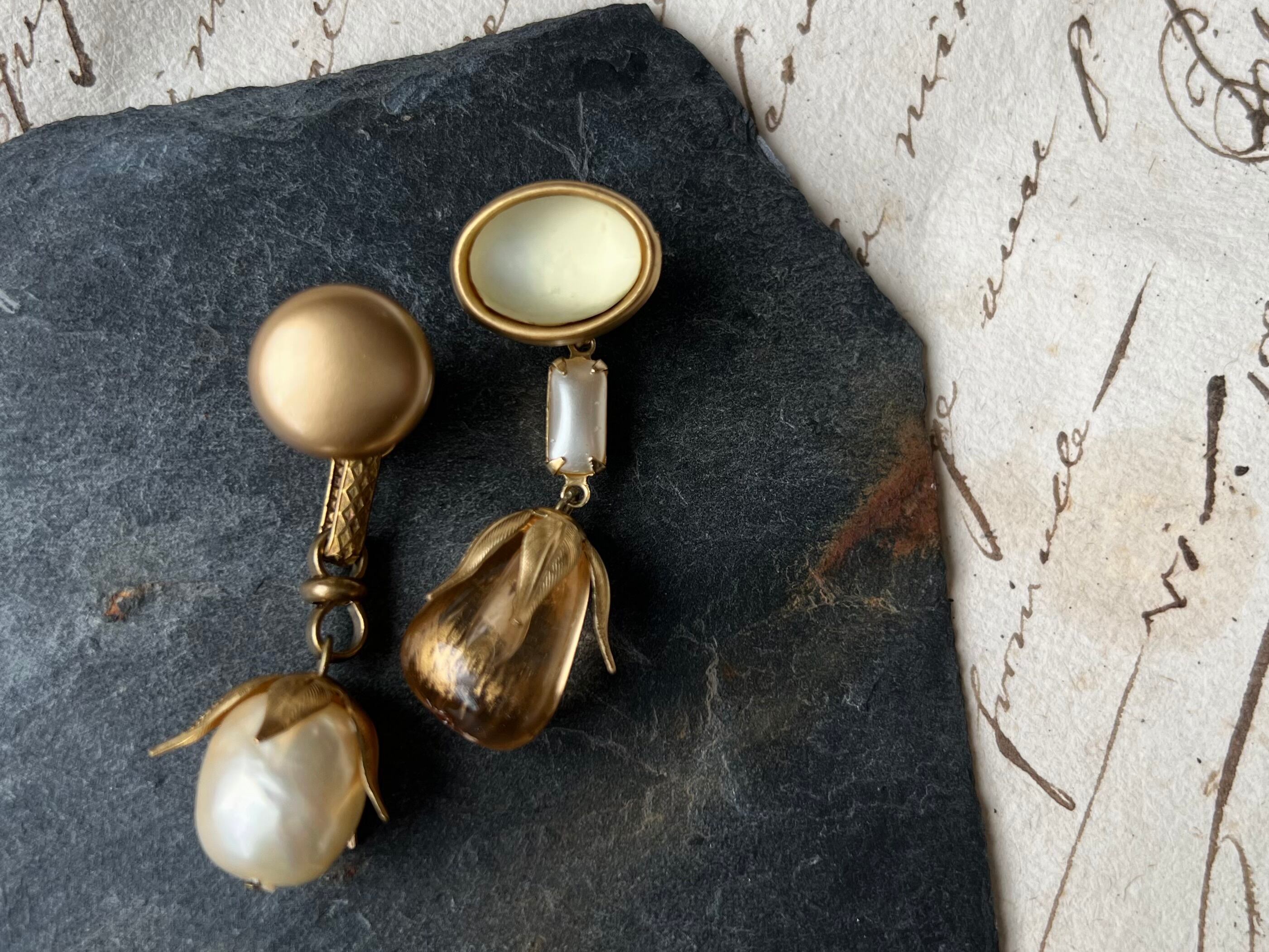 ヴィンテージパーツを使用してアシンメトリーなピアスを作りました。