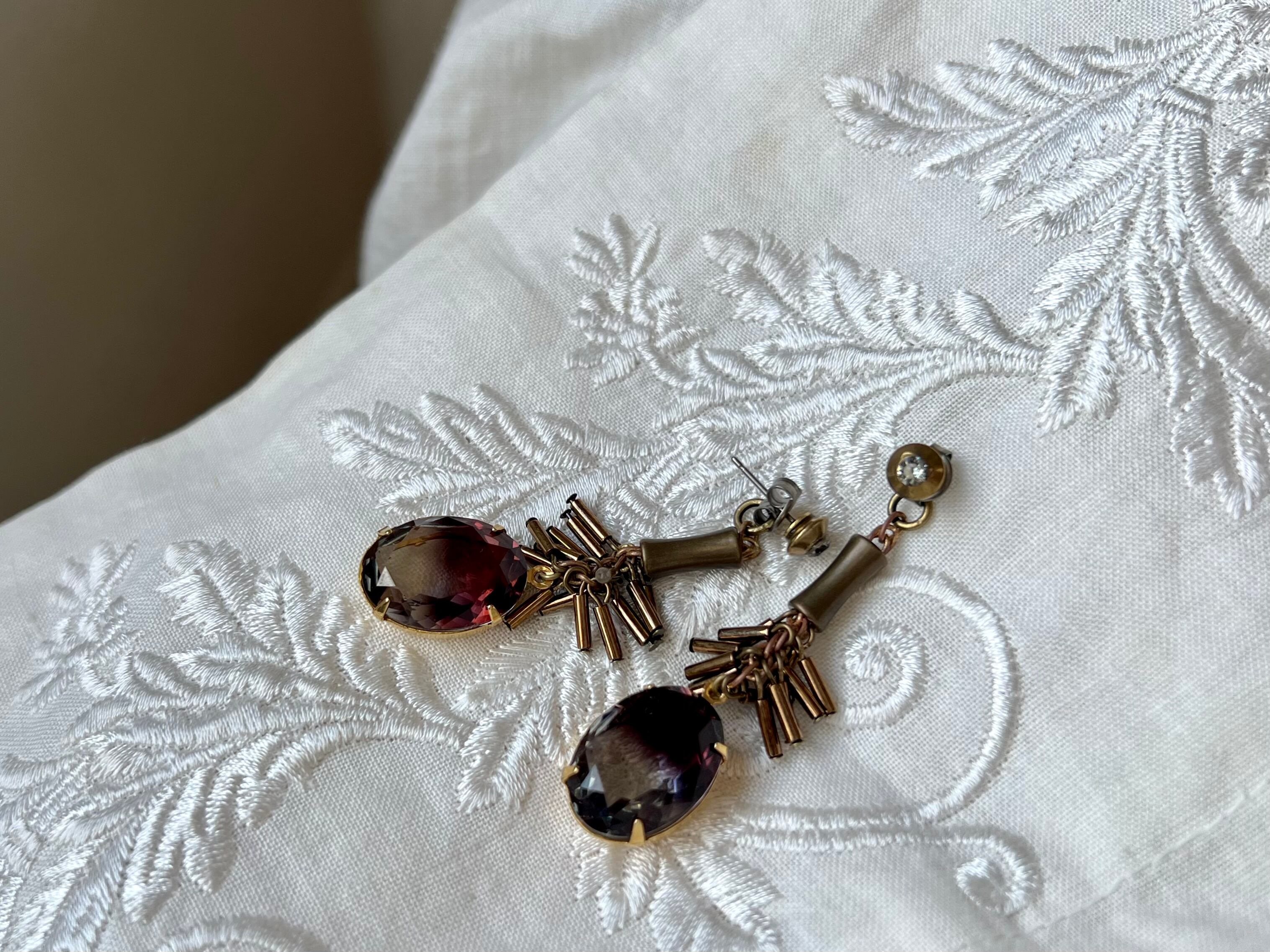 ヴィンテージパーツを使用してアシンメトリーなピアスを作りました。