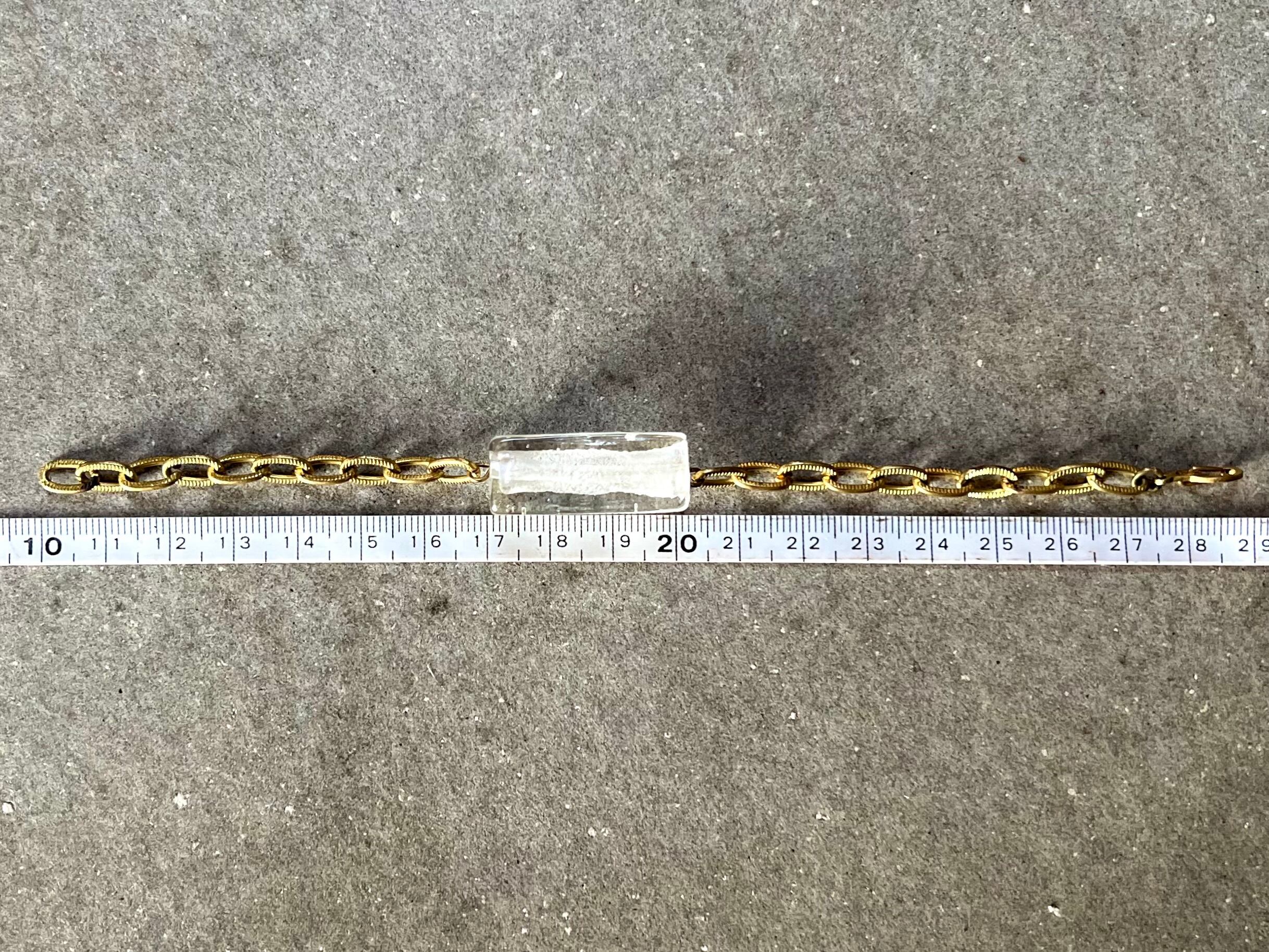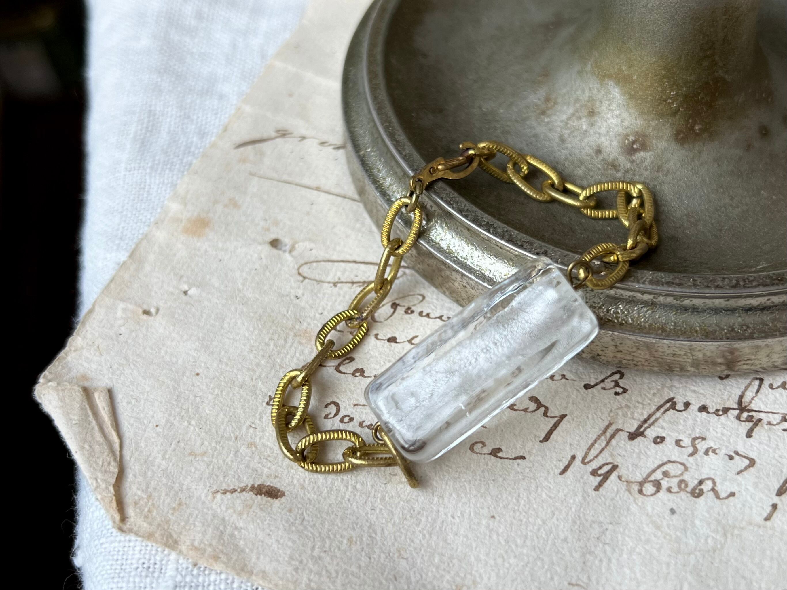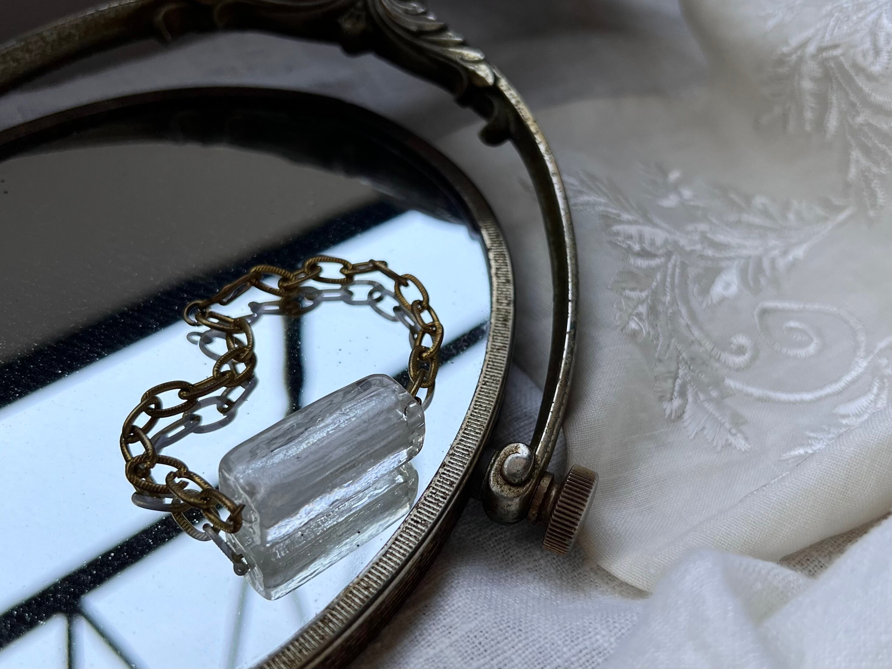 存在感のある氷のようなヴィンテージガラスに少し粗めのチェーンを合わせて、シックで大人っぽい雰囲気に仕上げました。