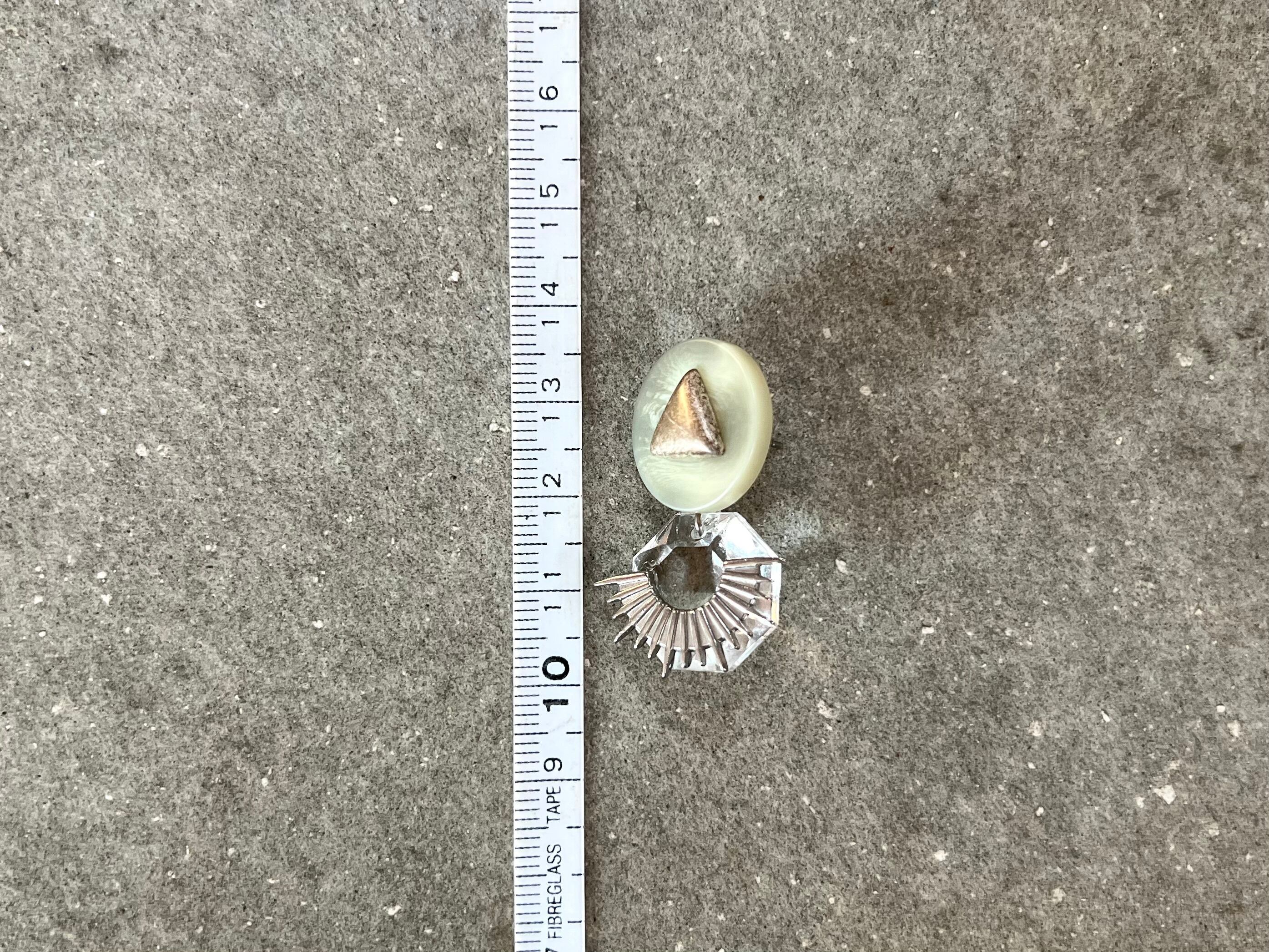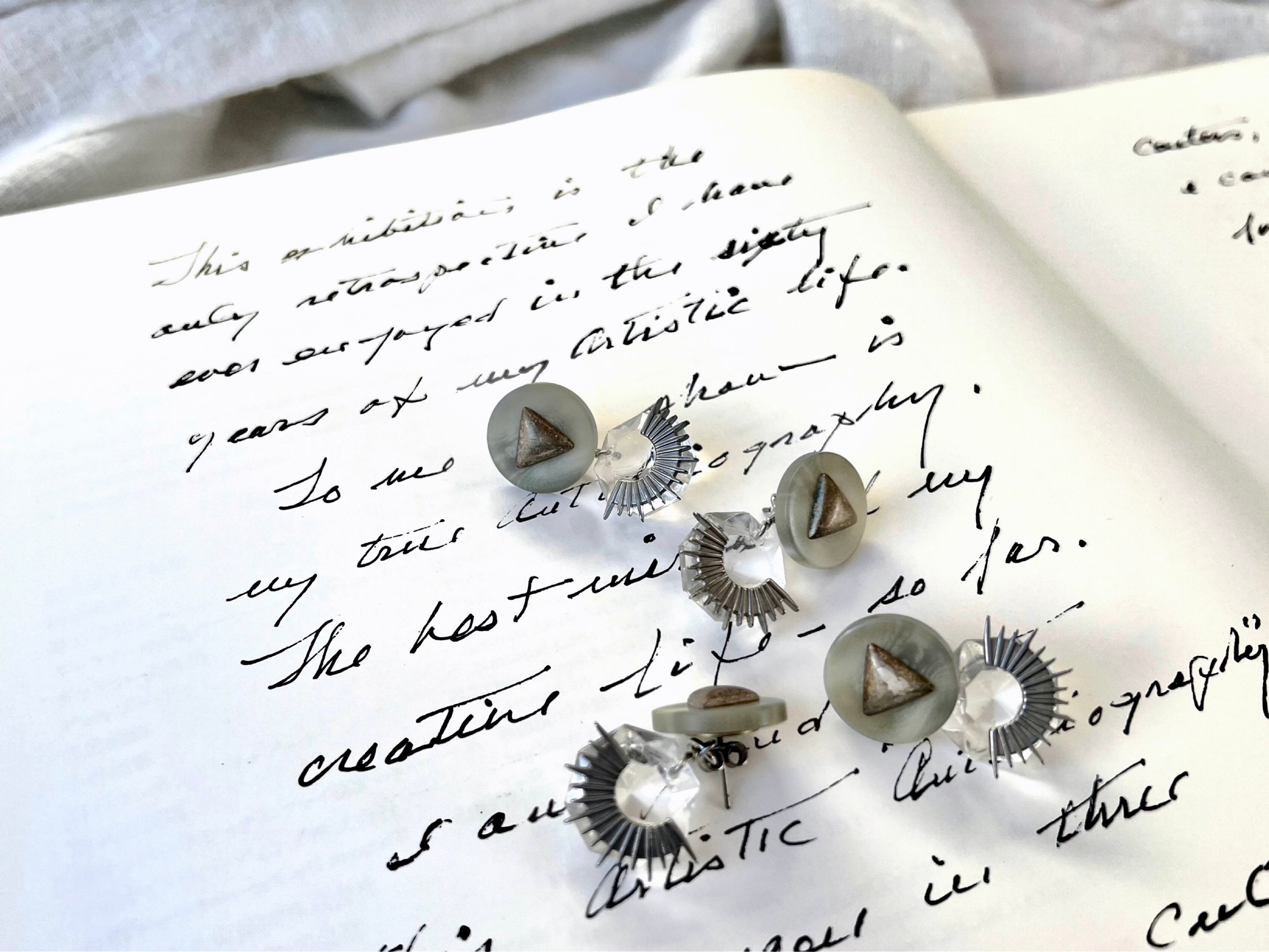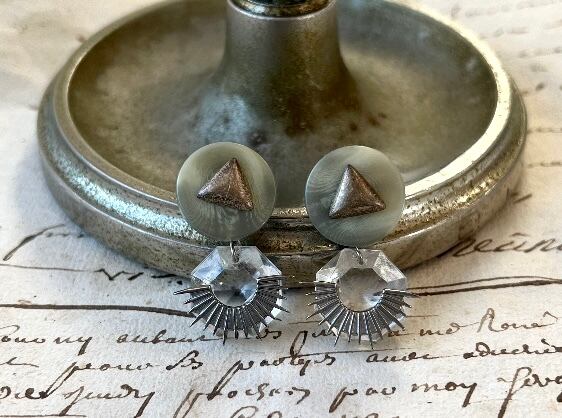 シックなヴィンテージボタンに、メタルパーツを添えたシャンデリアガラスを合わせて、少し辛口に仕上げました。