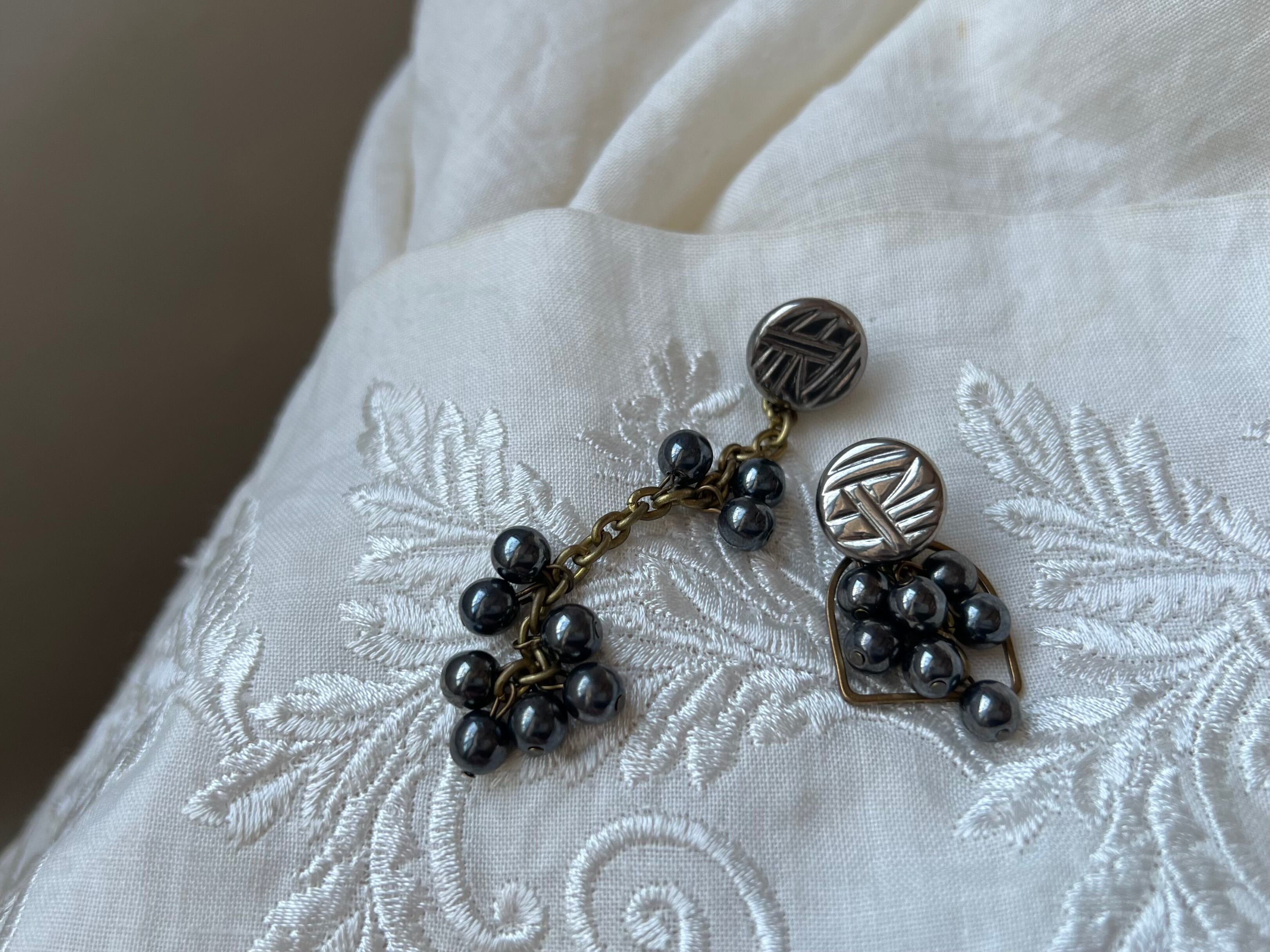 ヴィンテージパーツを使用してアシンメトリーなピアスを作りました。