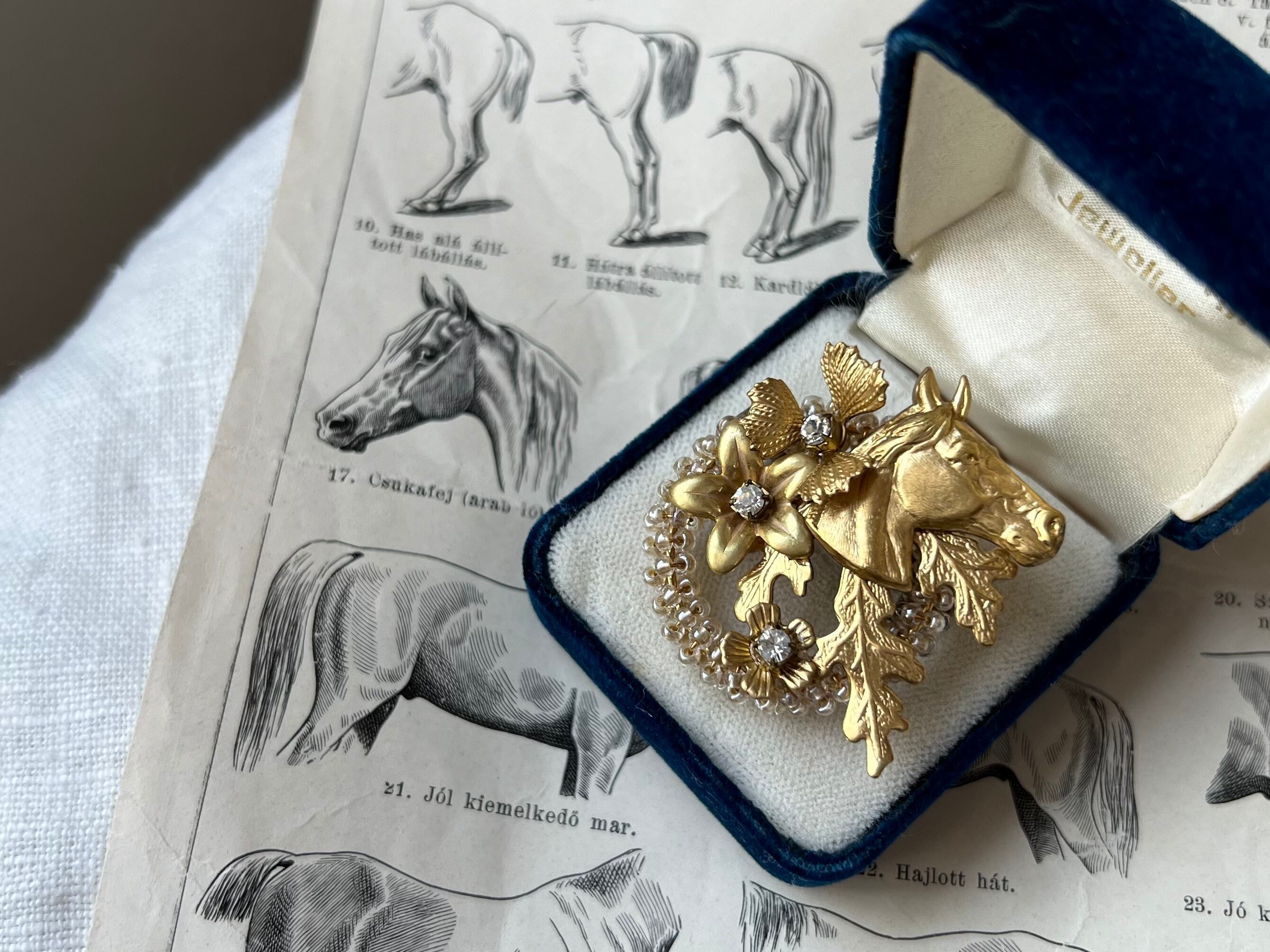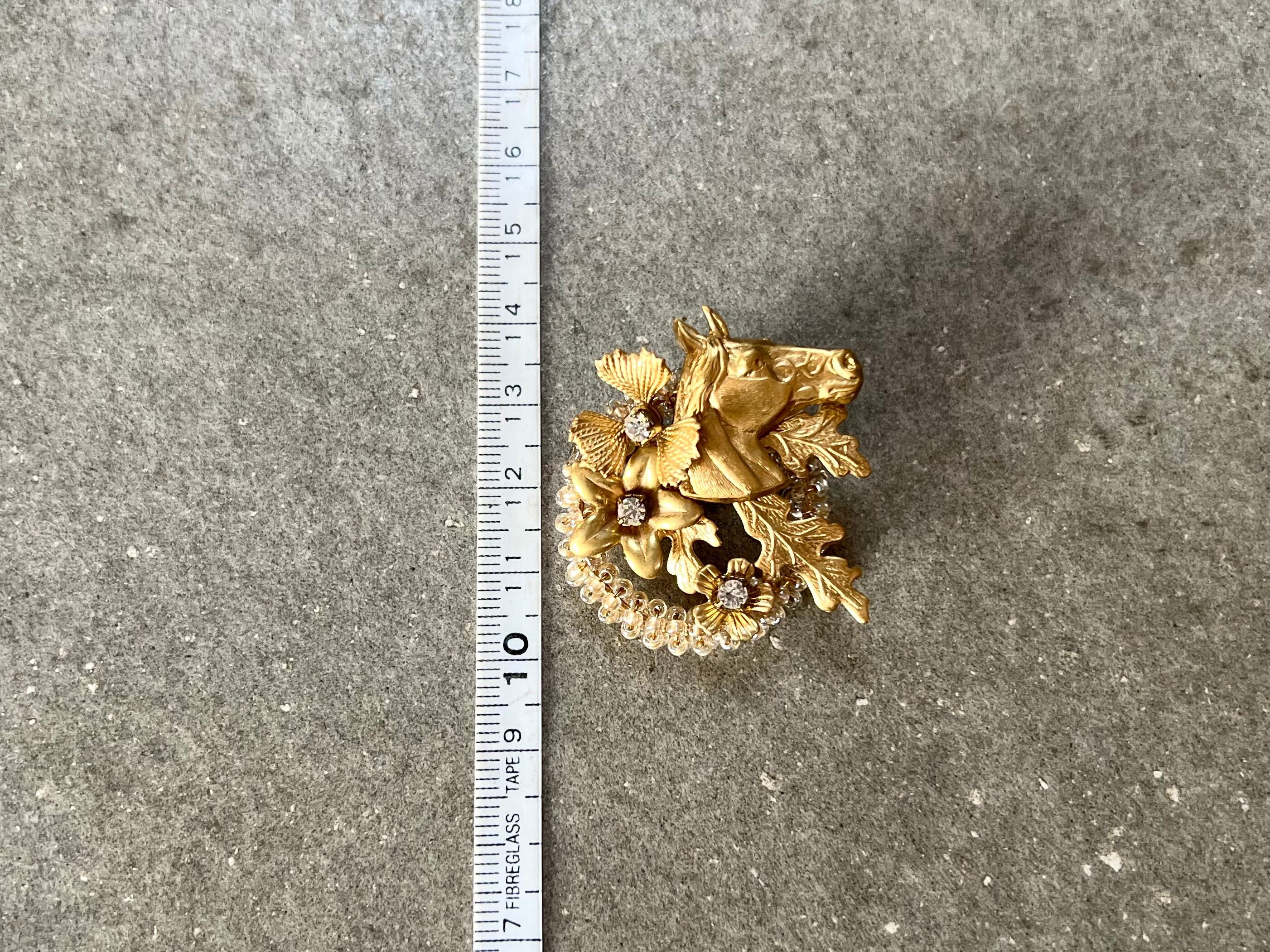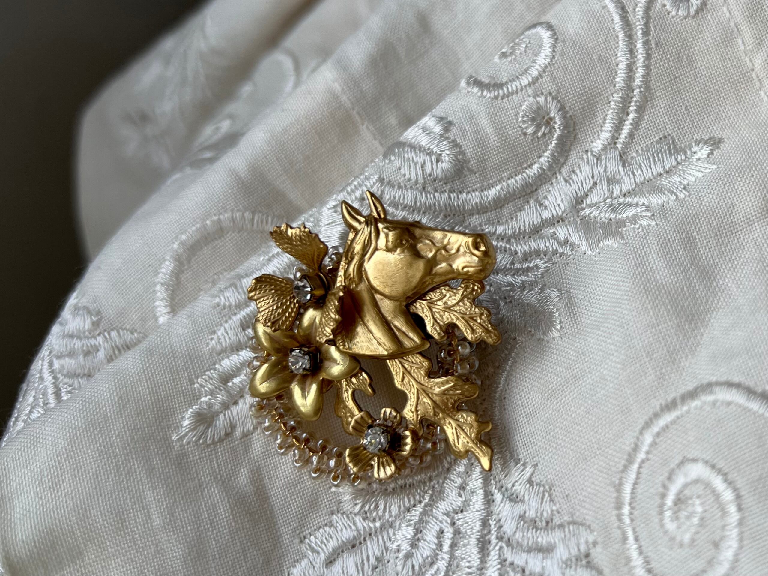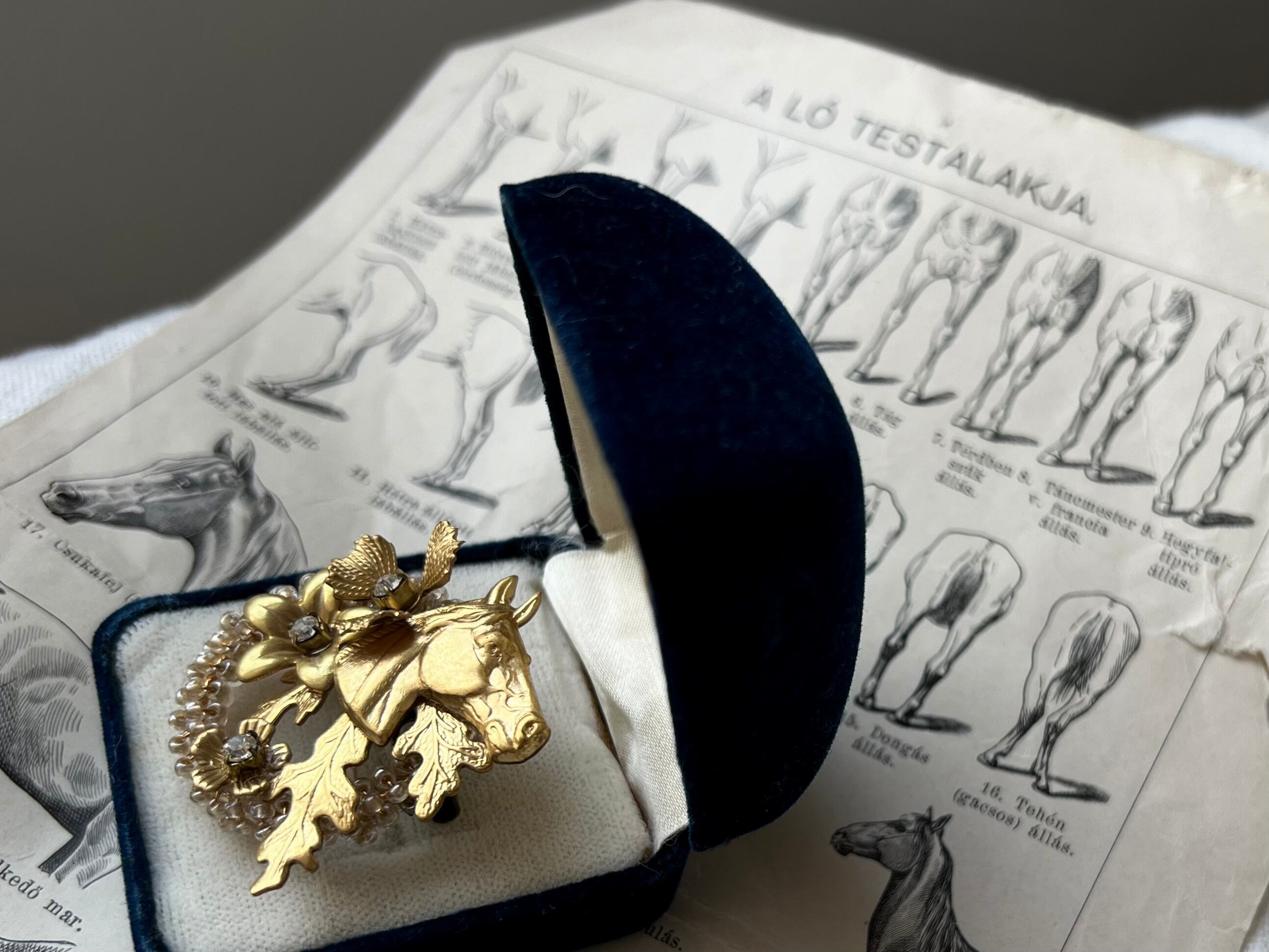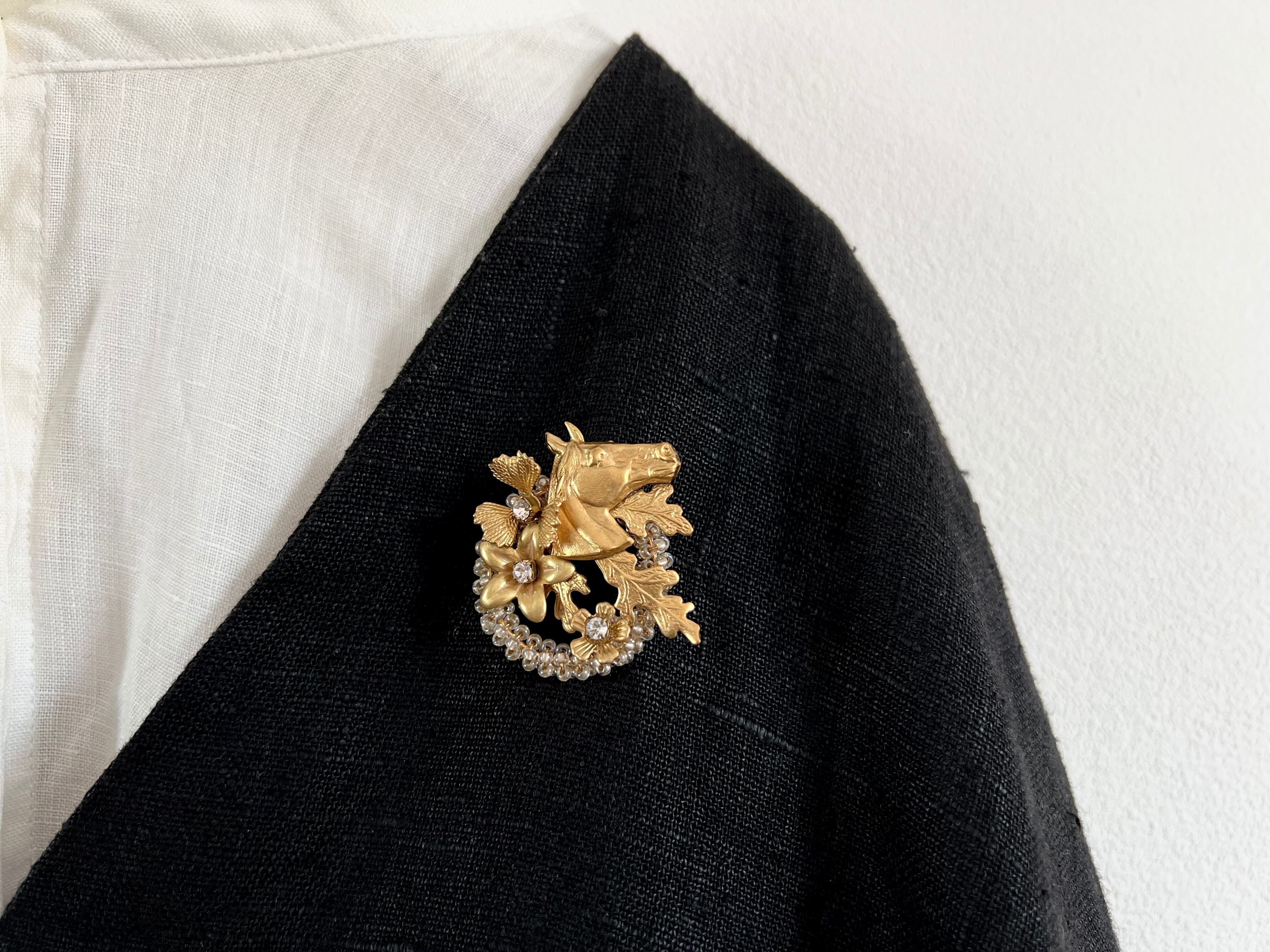 フープにガラスビーズで飾った土台にミリアムハスケルのボタニカルパーツやホースチャーム、スワロフスキーを散らして、みずみずしく華やかに仕上げました。