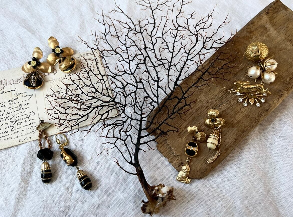 ヴィンテージパーツを使用してアシンメトリーなピアスを作りました。