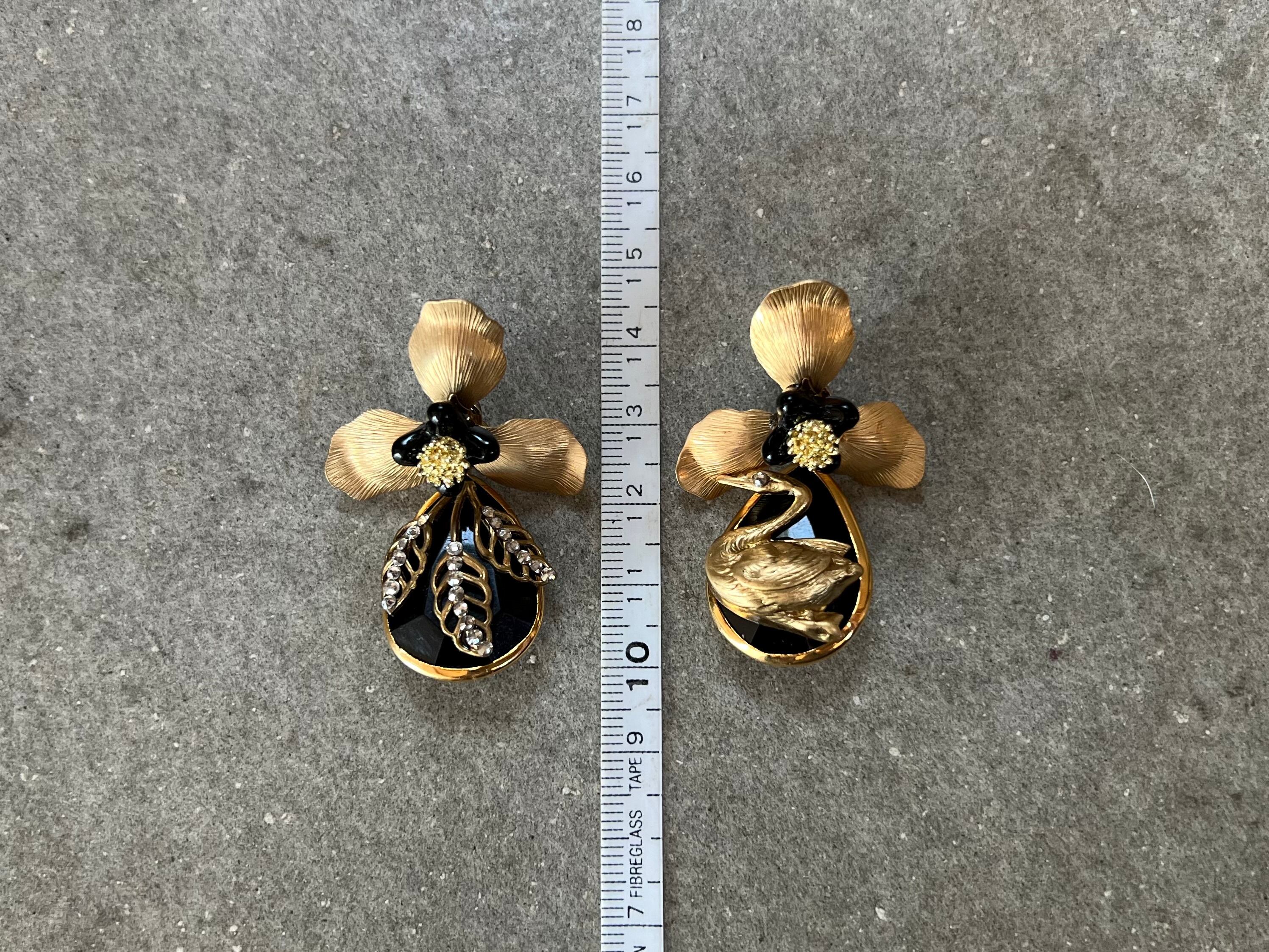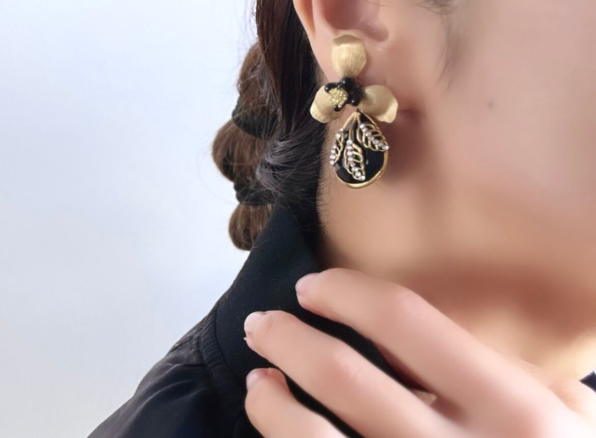 大ぶりのボタニカルパーツをカボションに、ミリアムハスケルのブラックガラスのお花を置いて、大粒のドロップにはスワロフスキーを散らした水鳥やリーフを添えました。