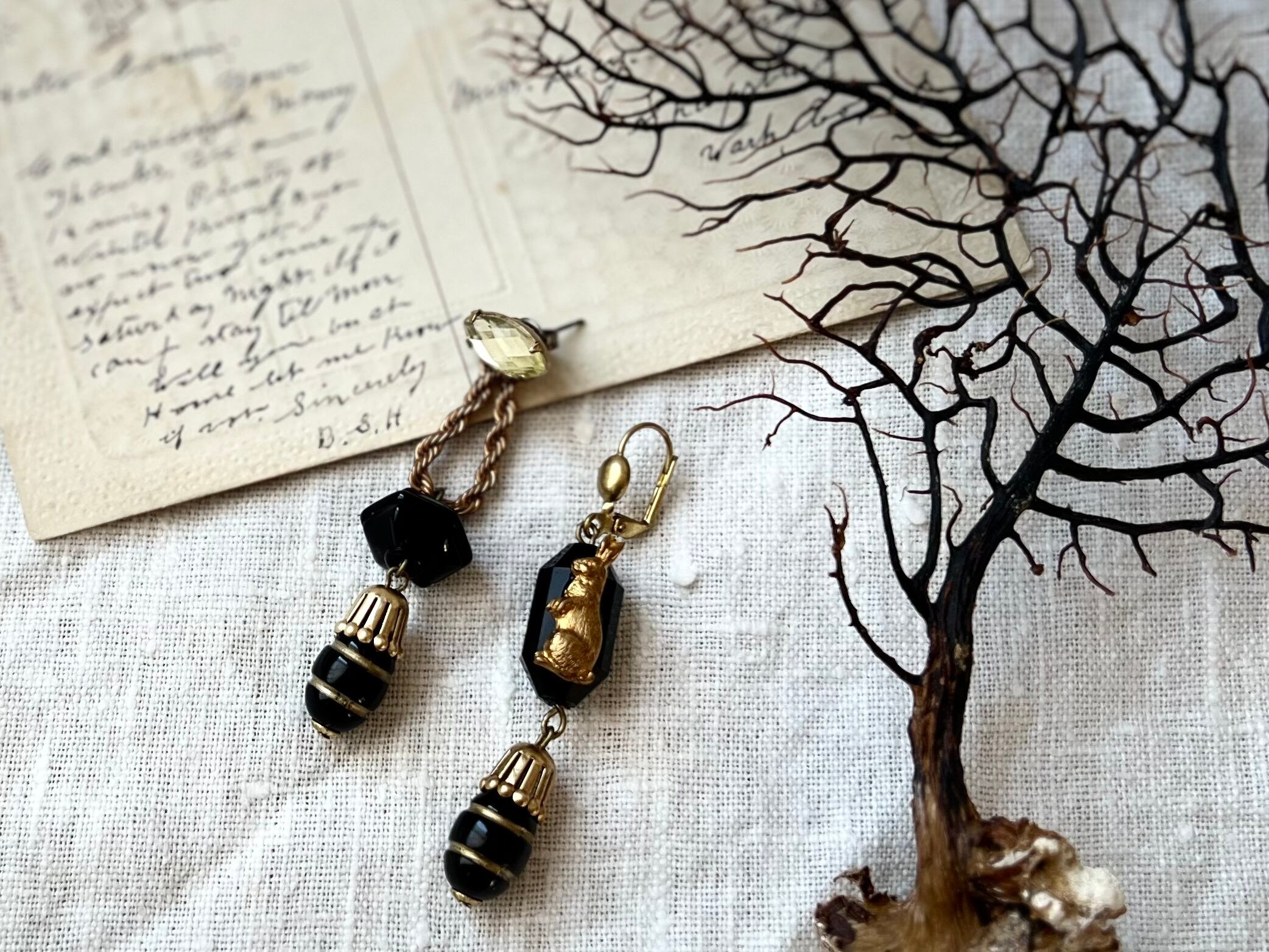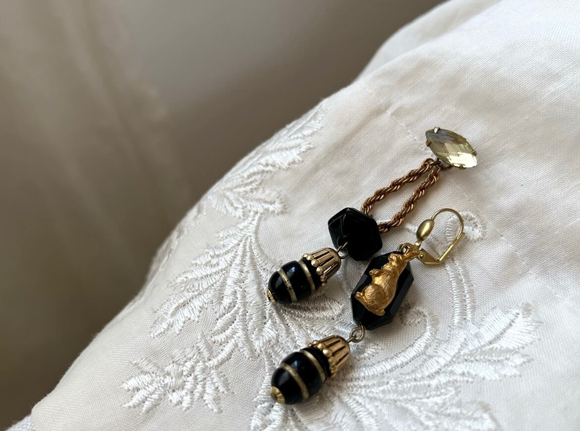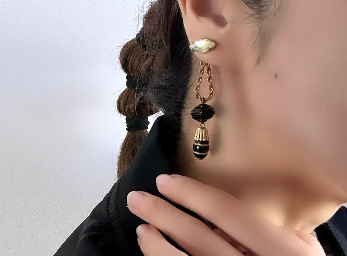 ヴィンテージパーツを使用してアシンメトリーなピアスを作りました。