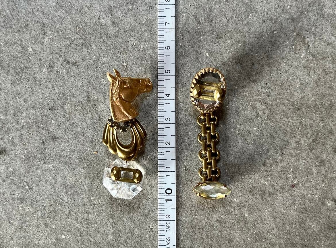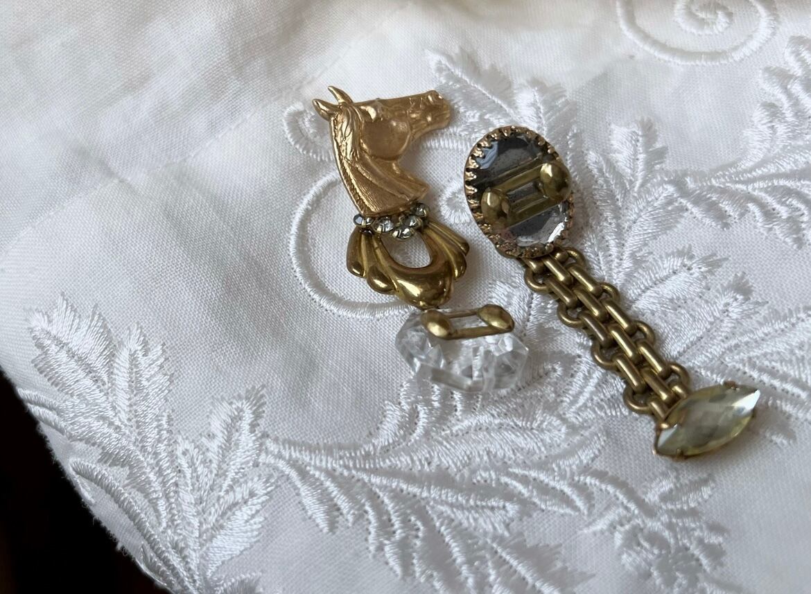 ヴィンテージパーツを使用してアシンメトリーなピアスを作りました。