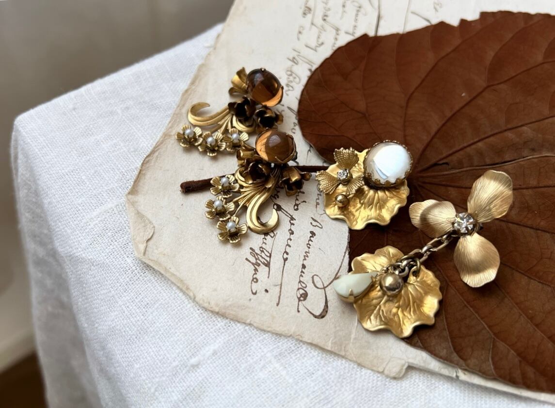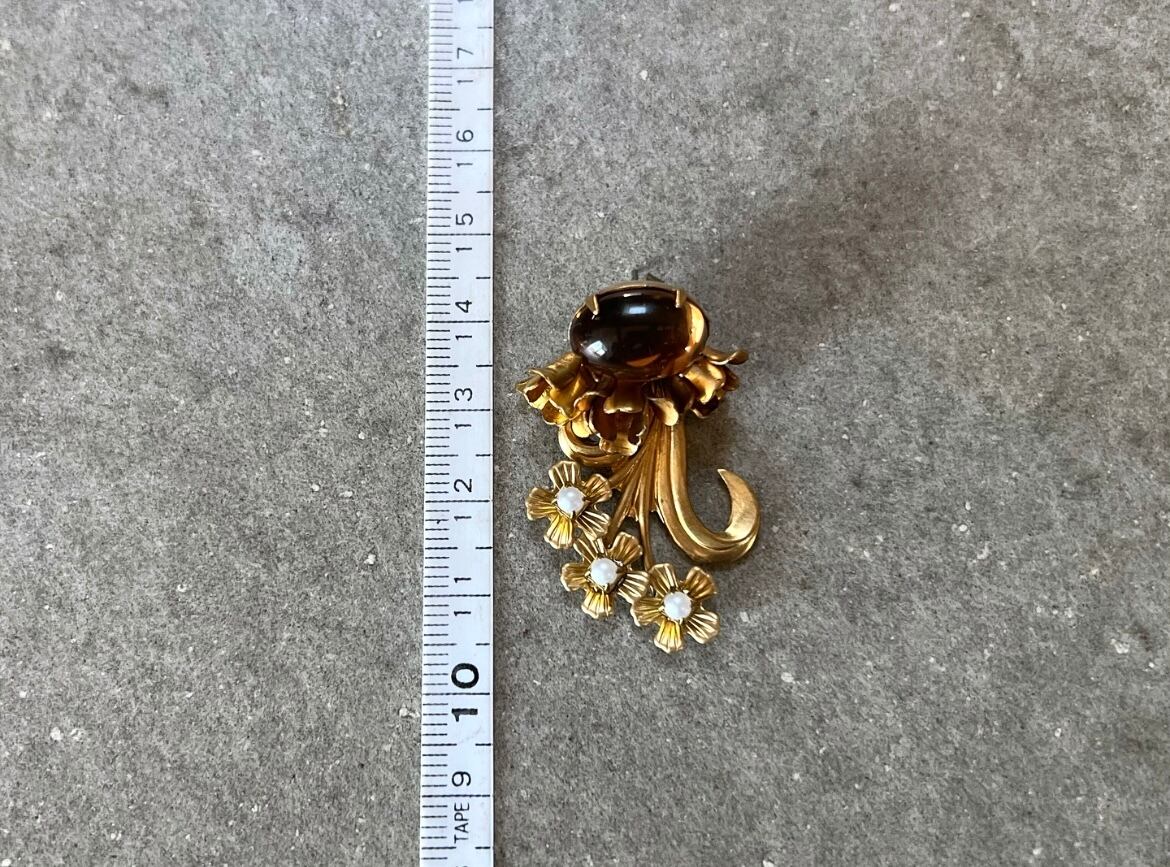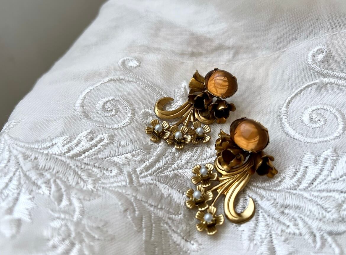 落ち着きのある美しいアンバーカラーのガラスドームをカボションに、可憐な小花を散らしてヴィンテージスワロフスキーのパールを添えました。
