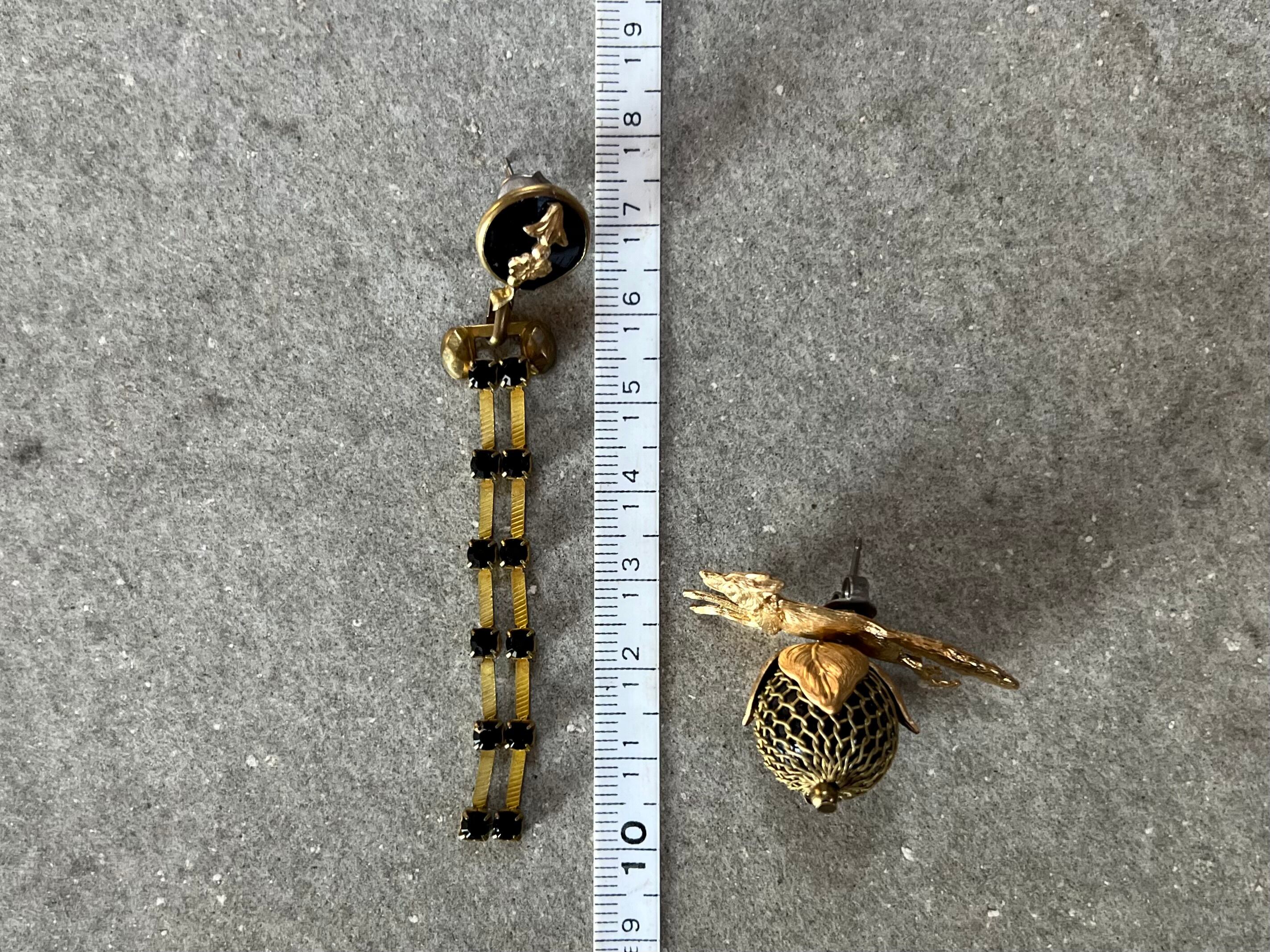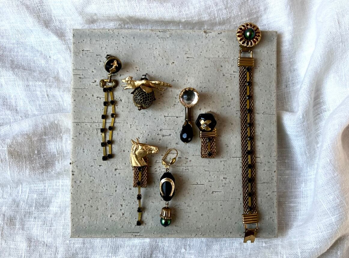 ヴィンテージパーツを使用してアシンメトリーなピアスを作りました。