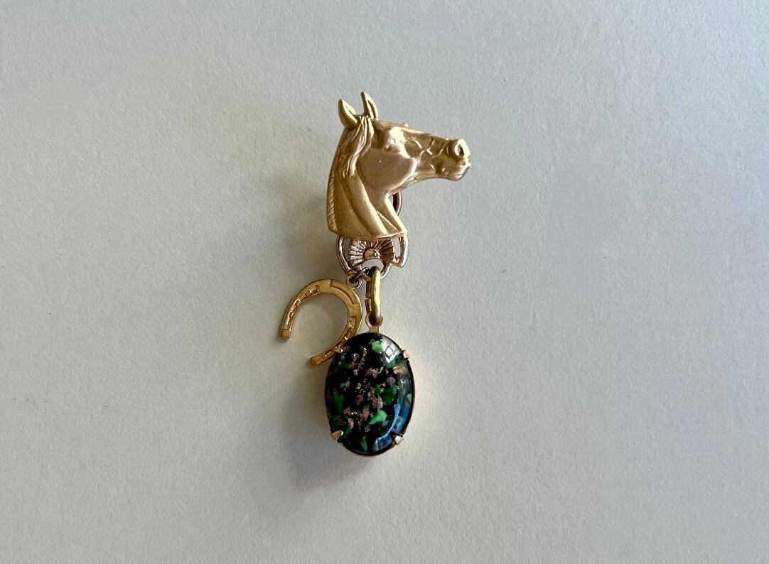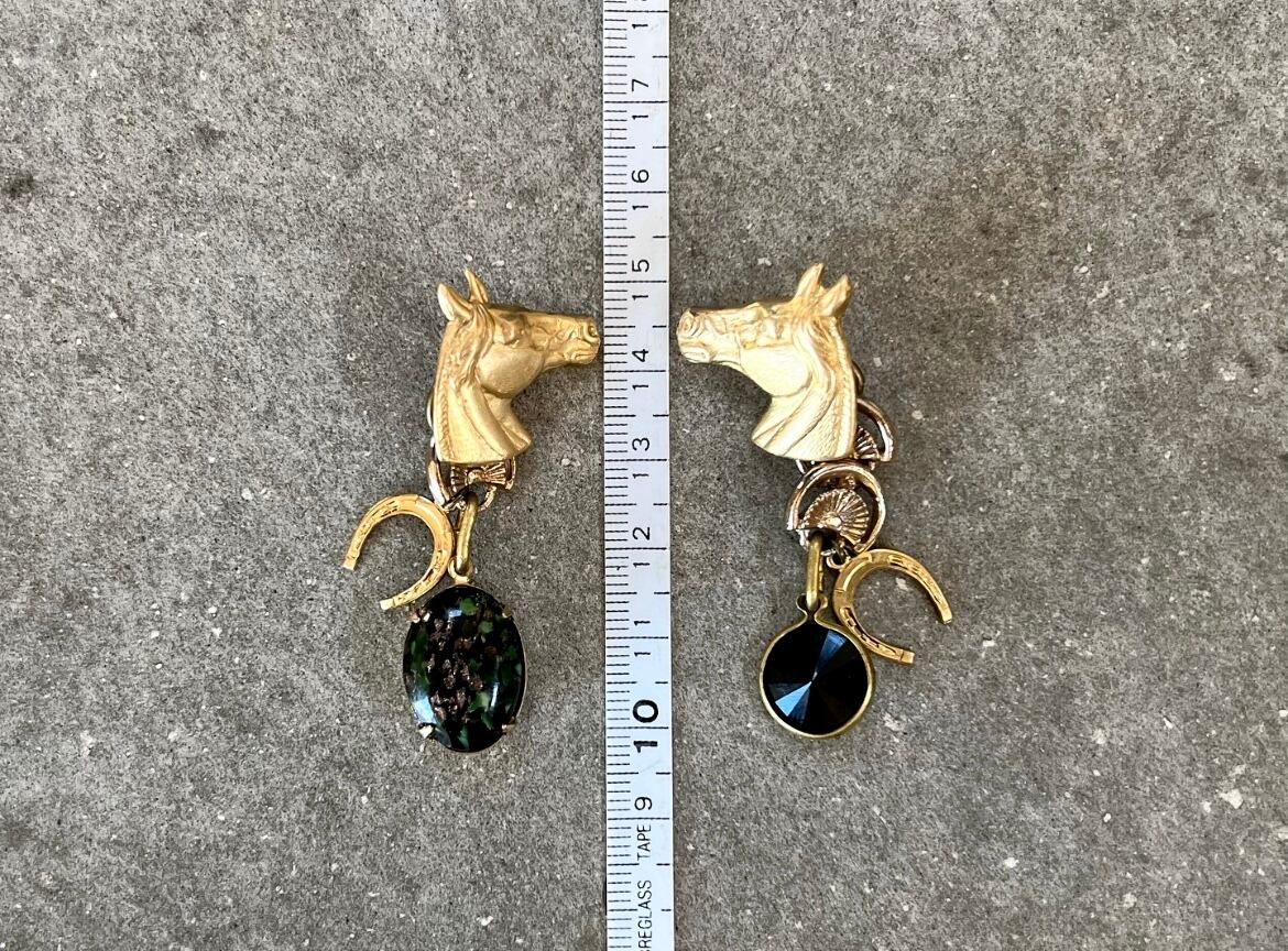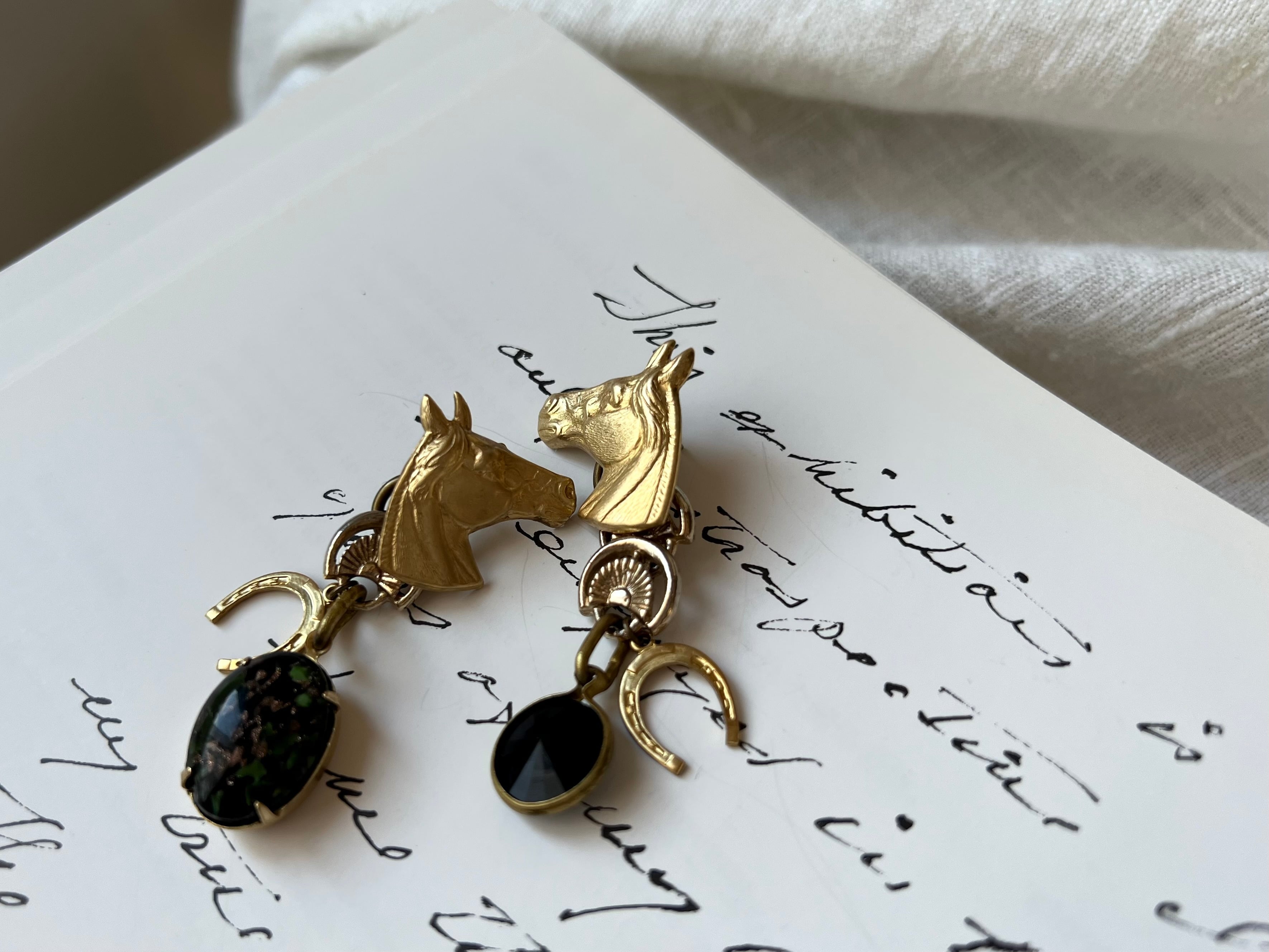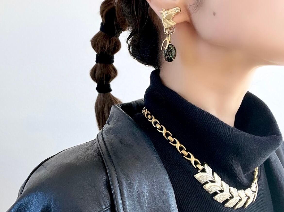 ホースチャームをカボションに、個性的なチェーンと、馬蹄のチャームを添えています。ブラックベースのパーツを左右それぞれに合わせて、遊び心がありながらもシックで大人っぽくなるよう、まとめました。