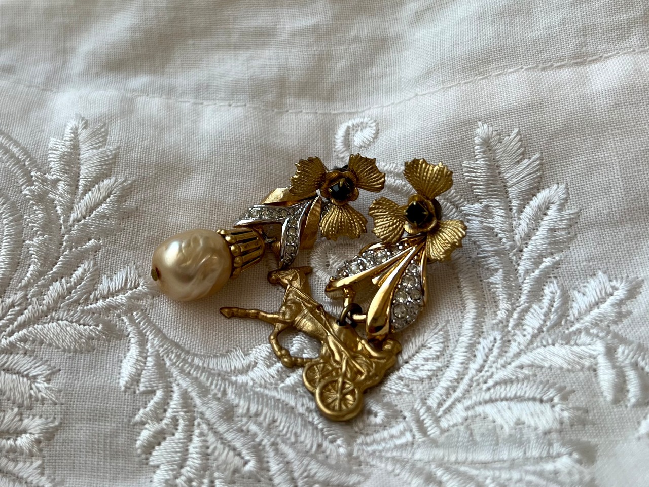 ヴィンテージパーツを使用してアシンメトリーなピアスを作りました。
