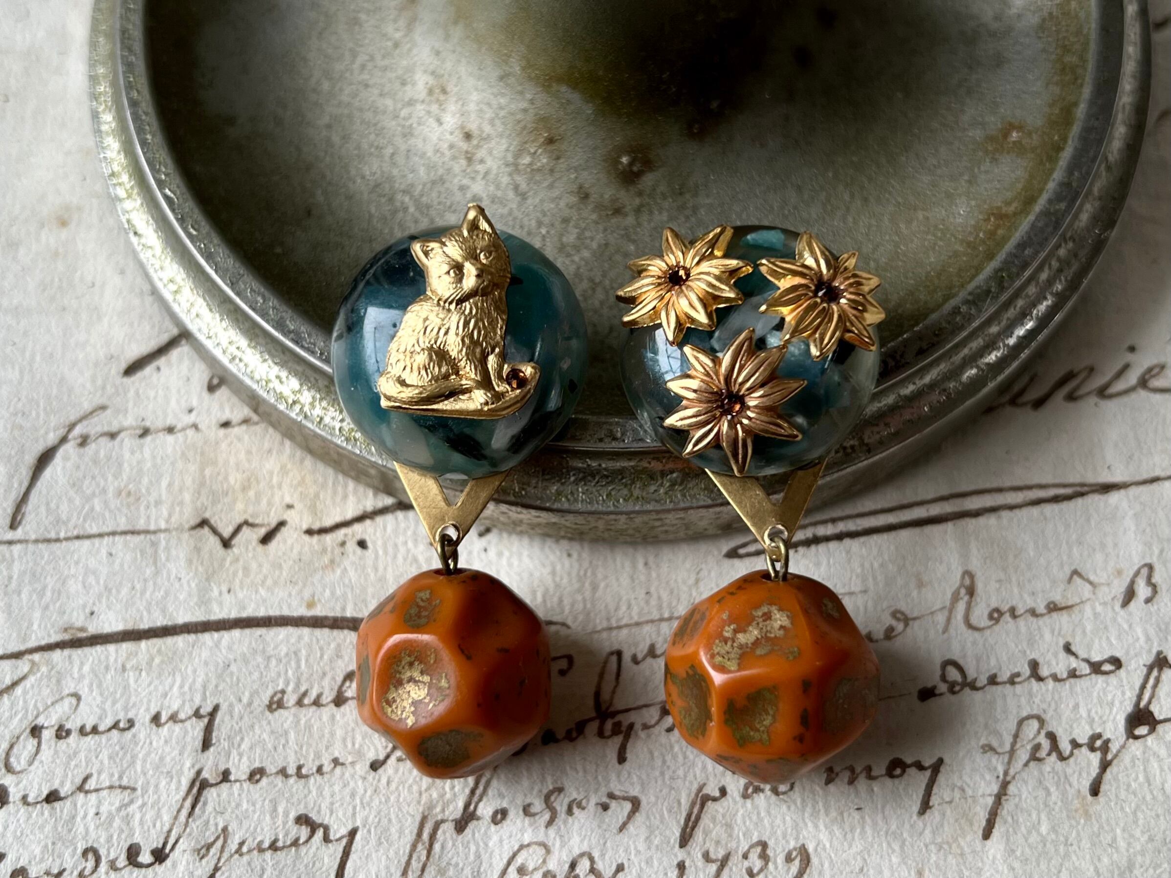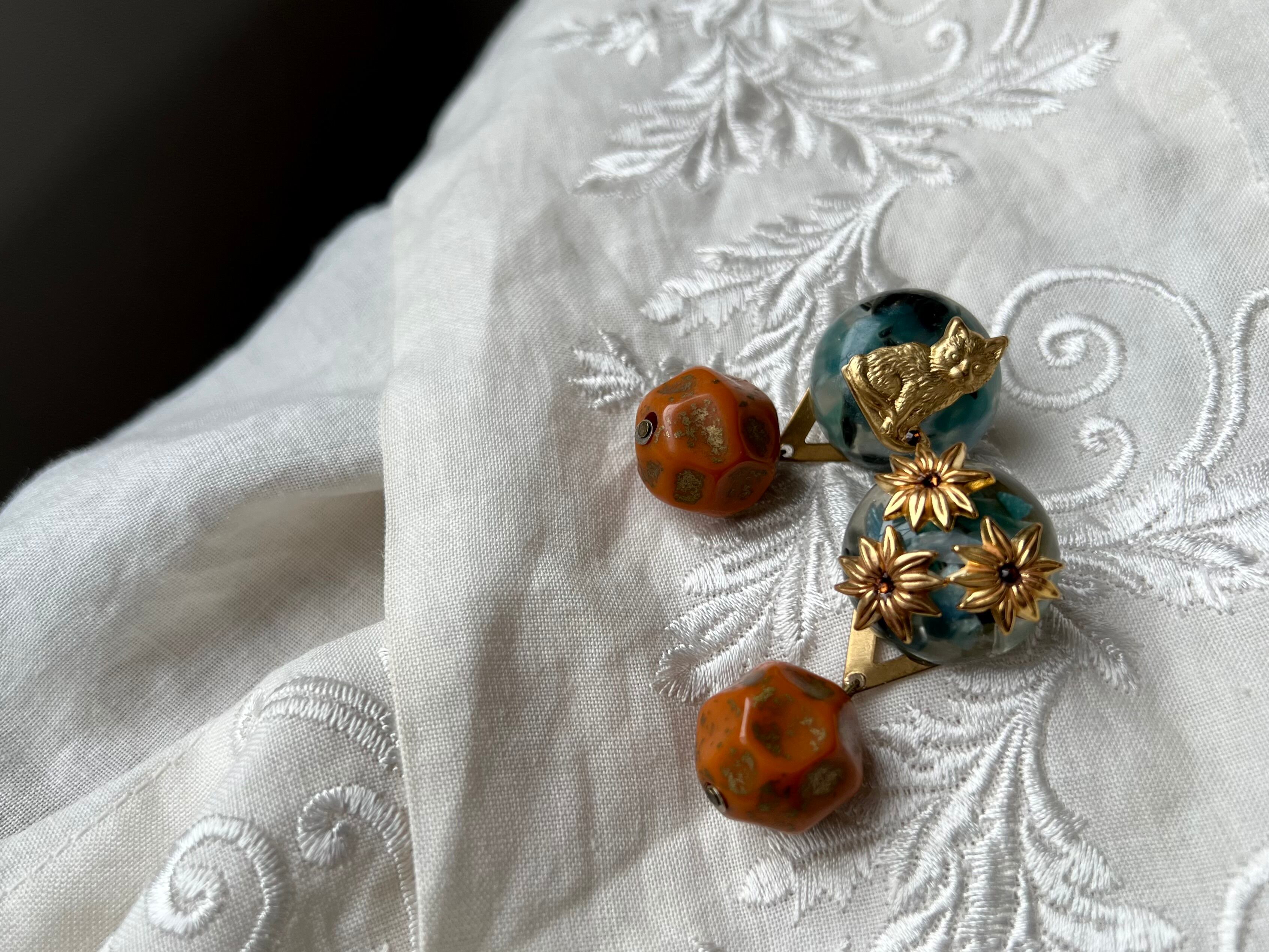 少し透明感のあるブルーグリーンのマーブルドームをカボションに、それぞれお花やネコのチャームを合わせました。