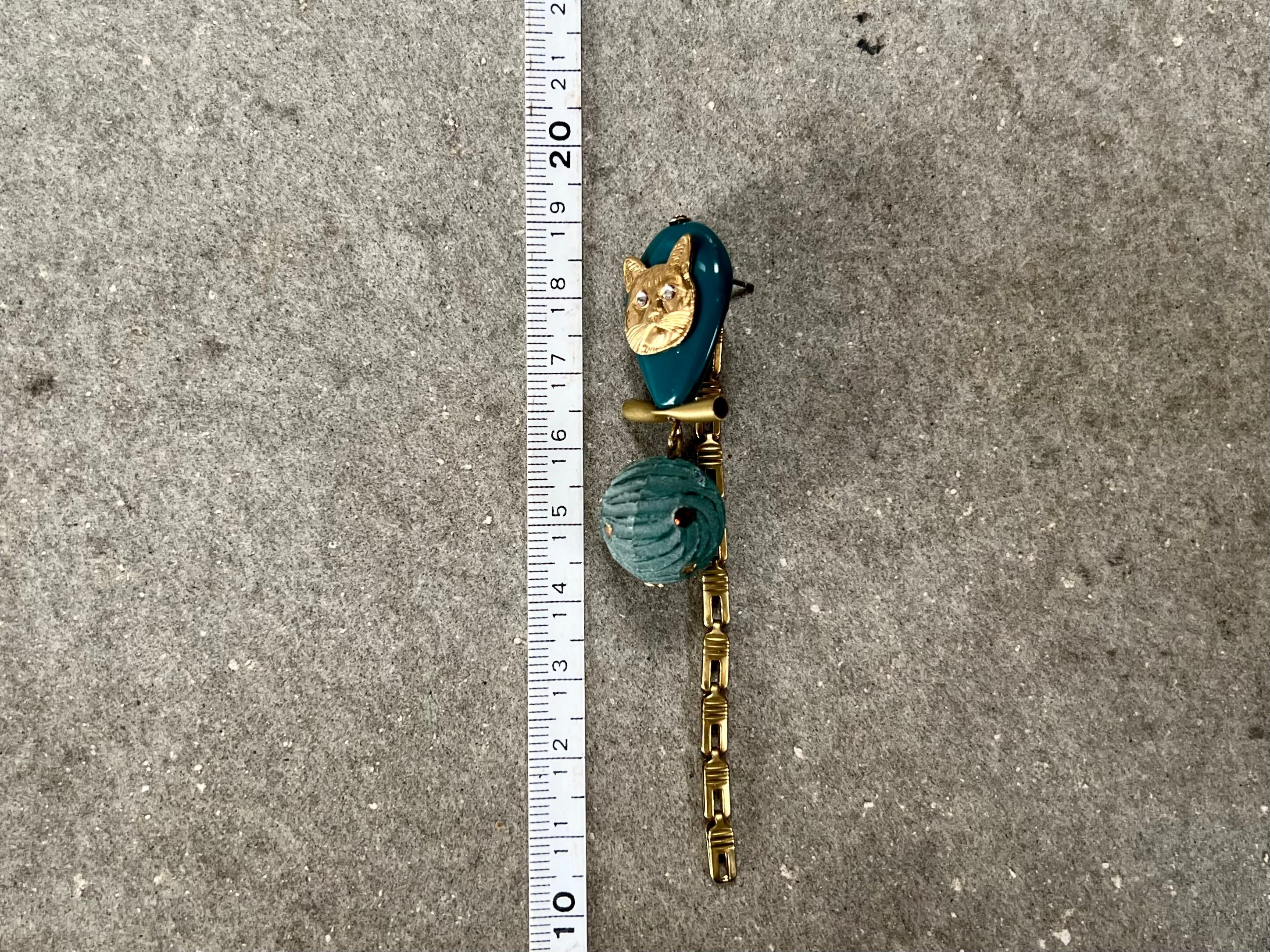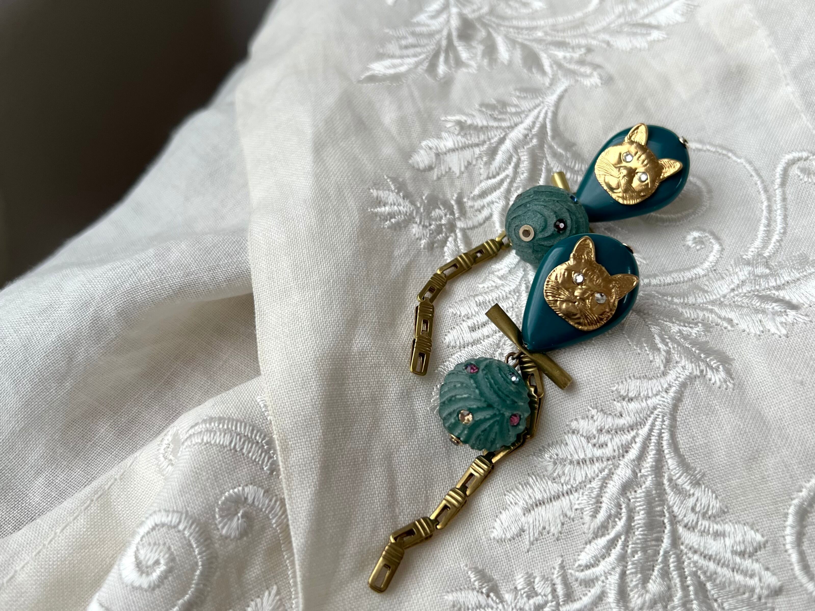 ブルーグリーンのドロップビーズをカボションに、ネコのチャームを置いて、目にはスワロフスキーを付けました。
