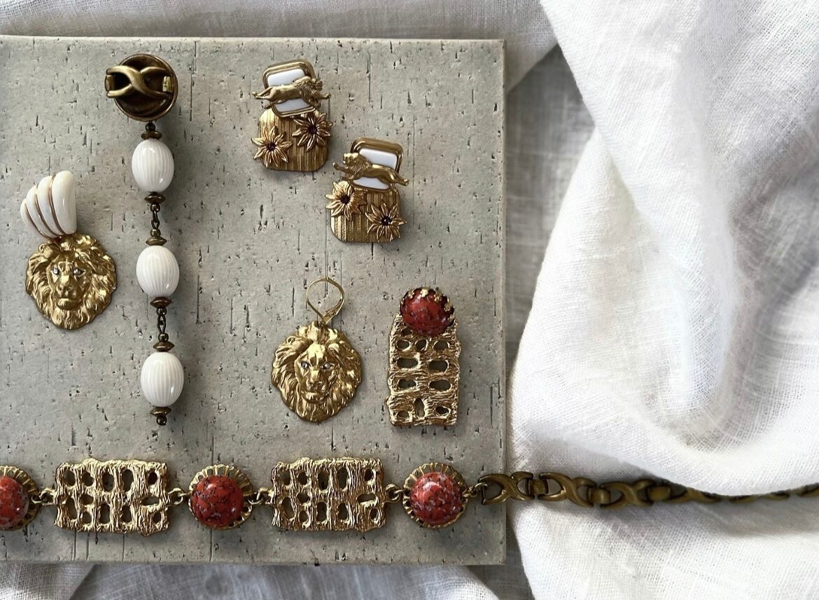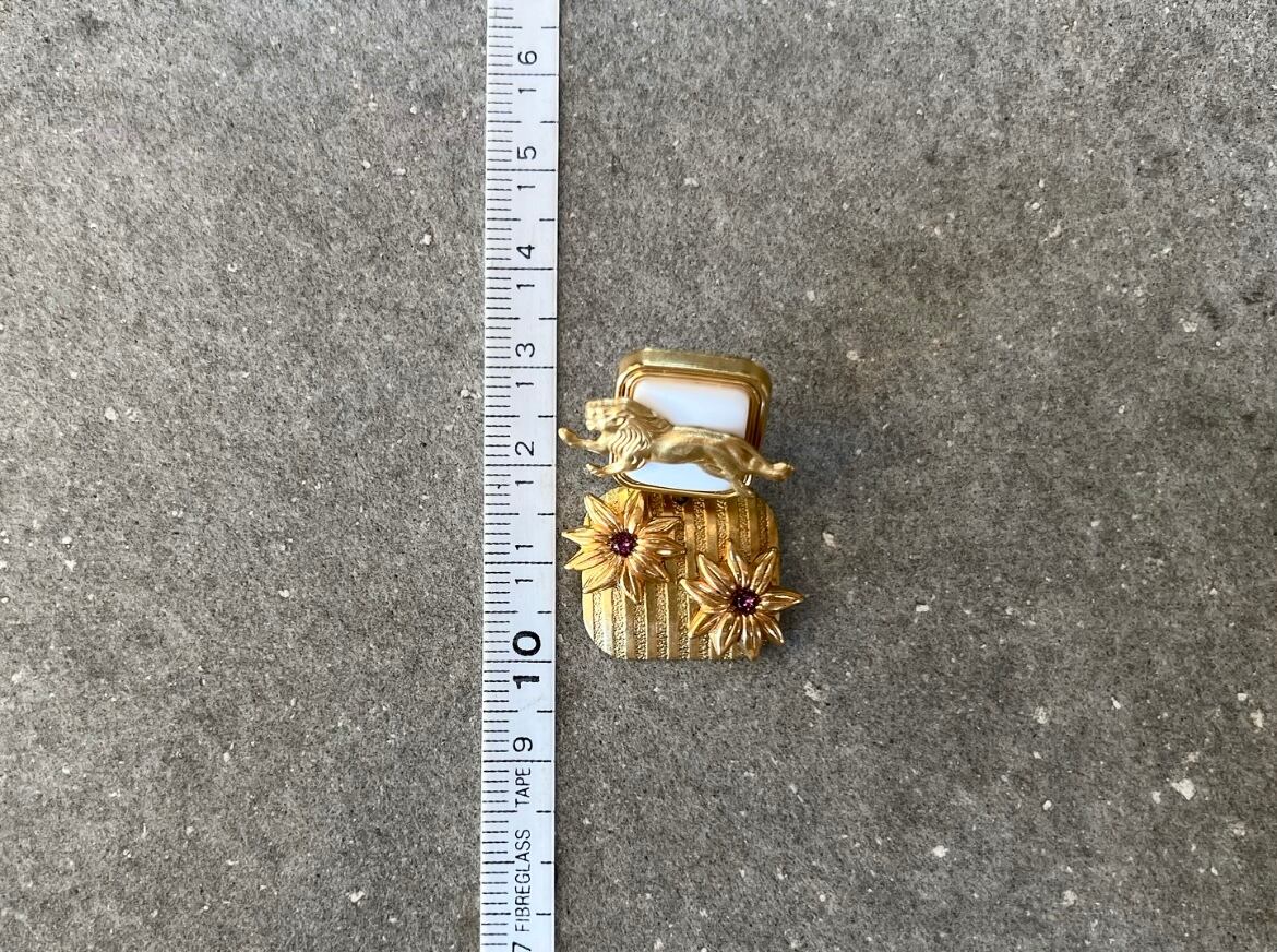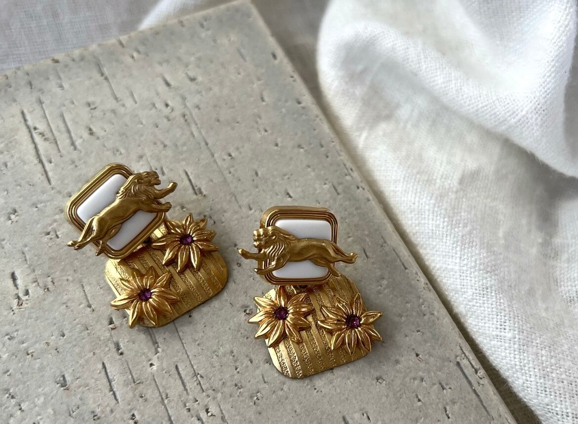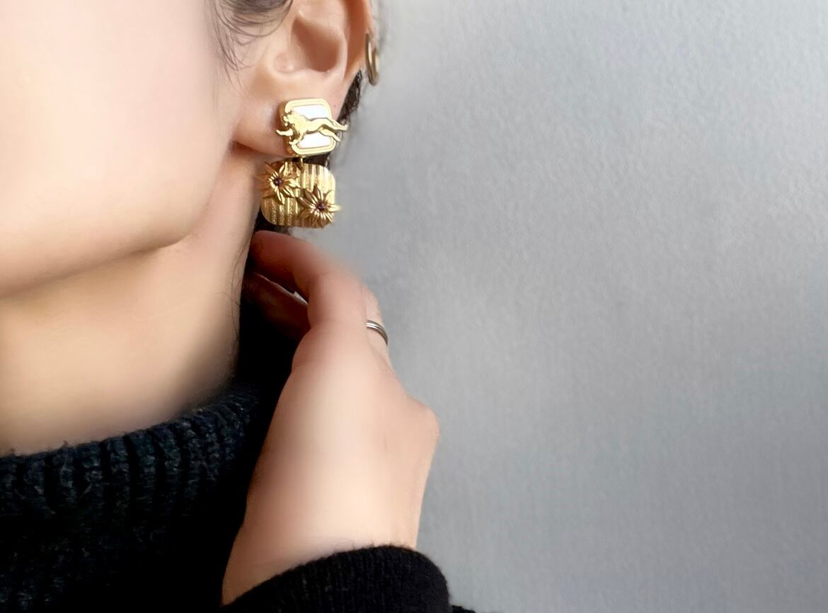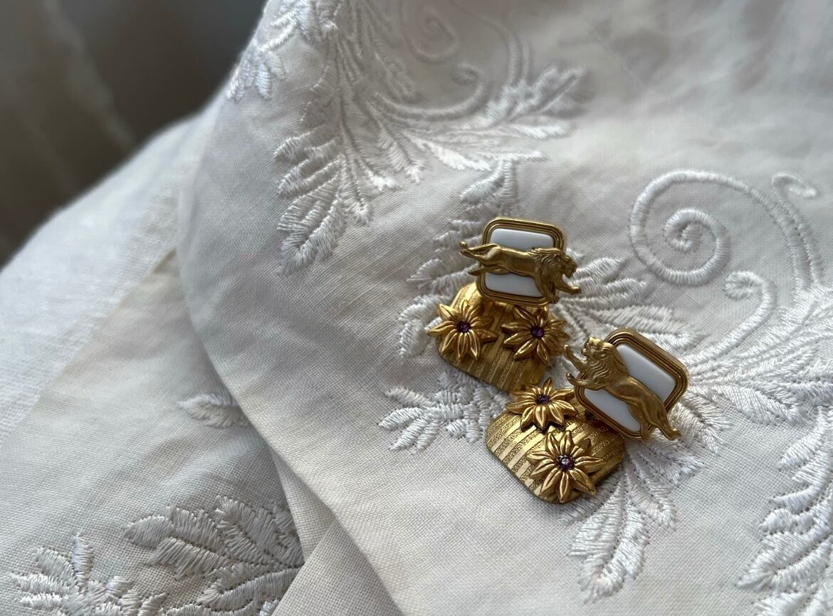 スクエアのヴィンテージボタンに小さなライオンチャームを乗せたお茶目なカボションに、お花を散らした真鍮パーツを合わせました。