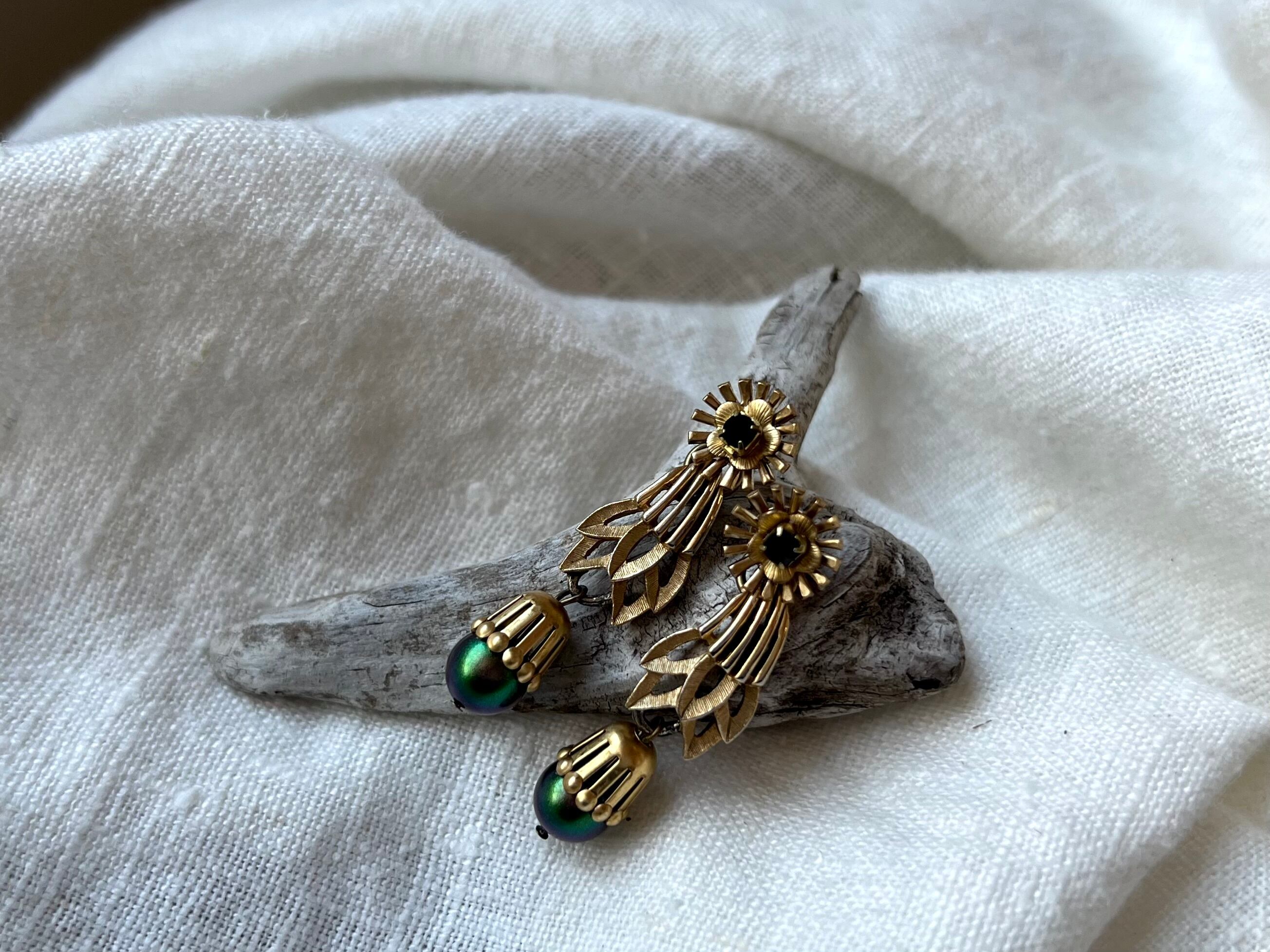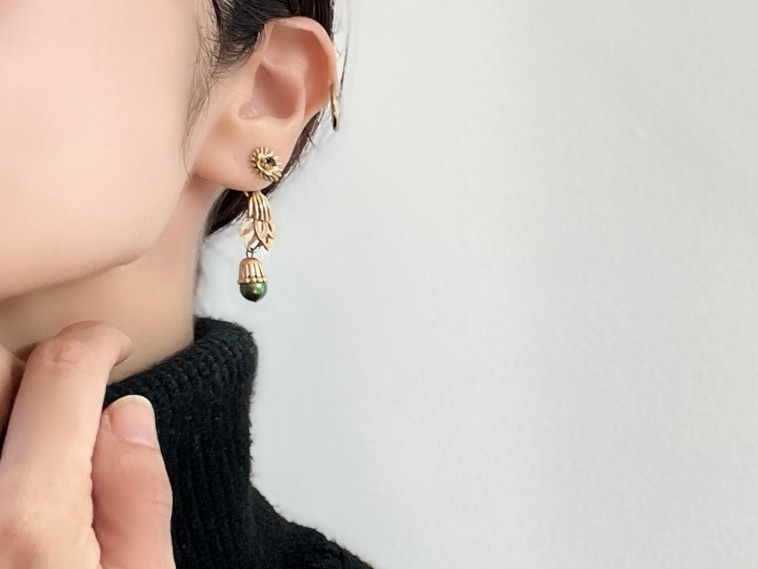 老舗コスチュームジュエリーブランドであるtrifariのパーツに偏光グリーンのスワロフスキーパールを合わせた個性的なデザインとなっています。