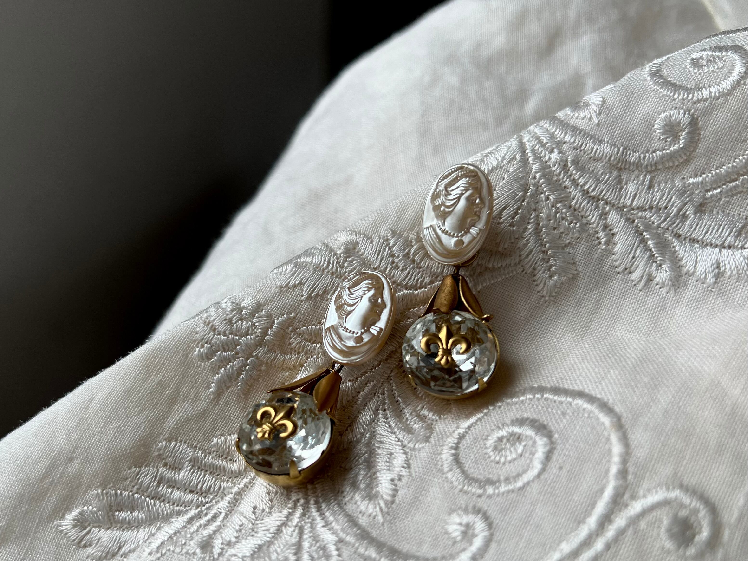 カメオモチーフのガラスボタンをカボションにボタニカルパーツとクリアガラスを合わせました。ガラスには百合のチャームを置いて、カメオの高貴な雰囲気を引き立てました。