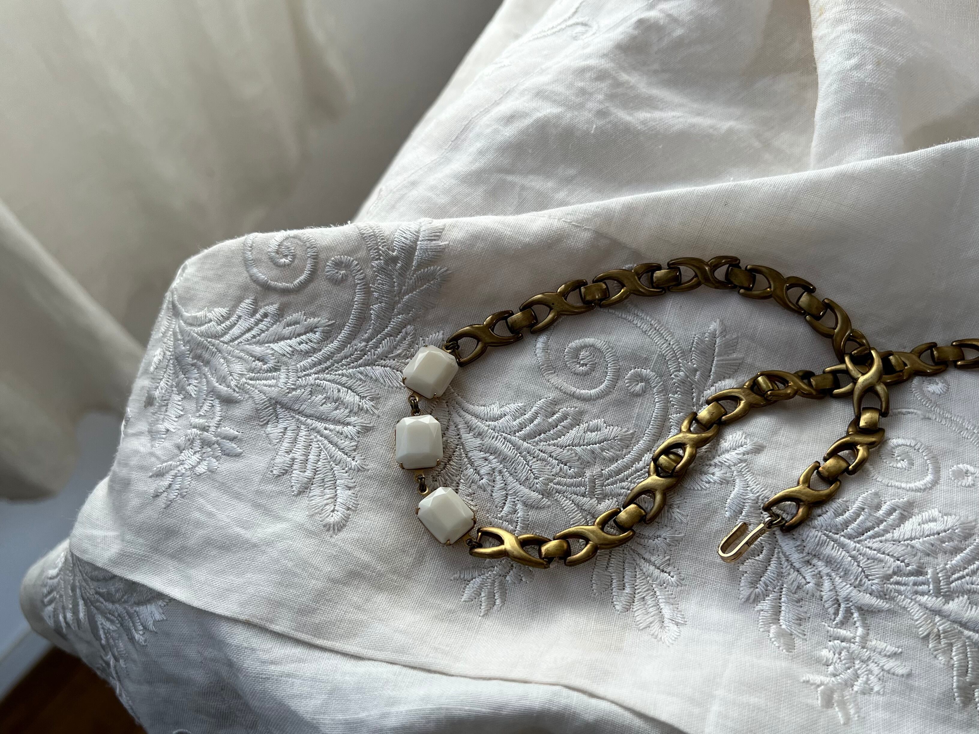 個性的なチェーンにミルク色のオクタゴンガラスを添え、シンプルに仕上げました。