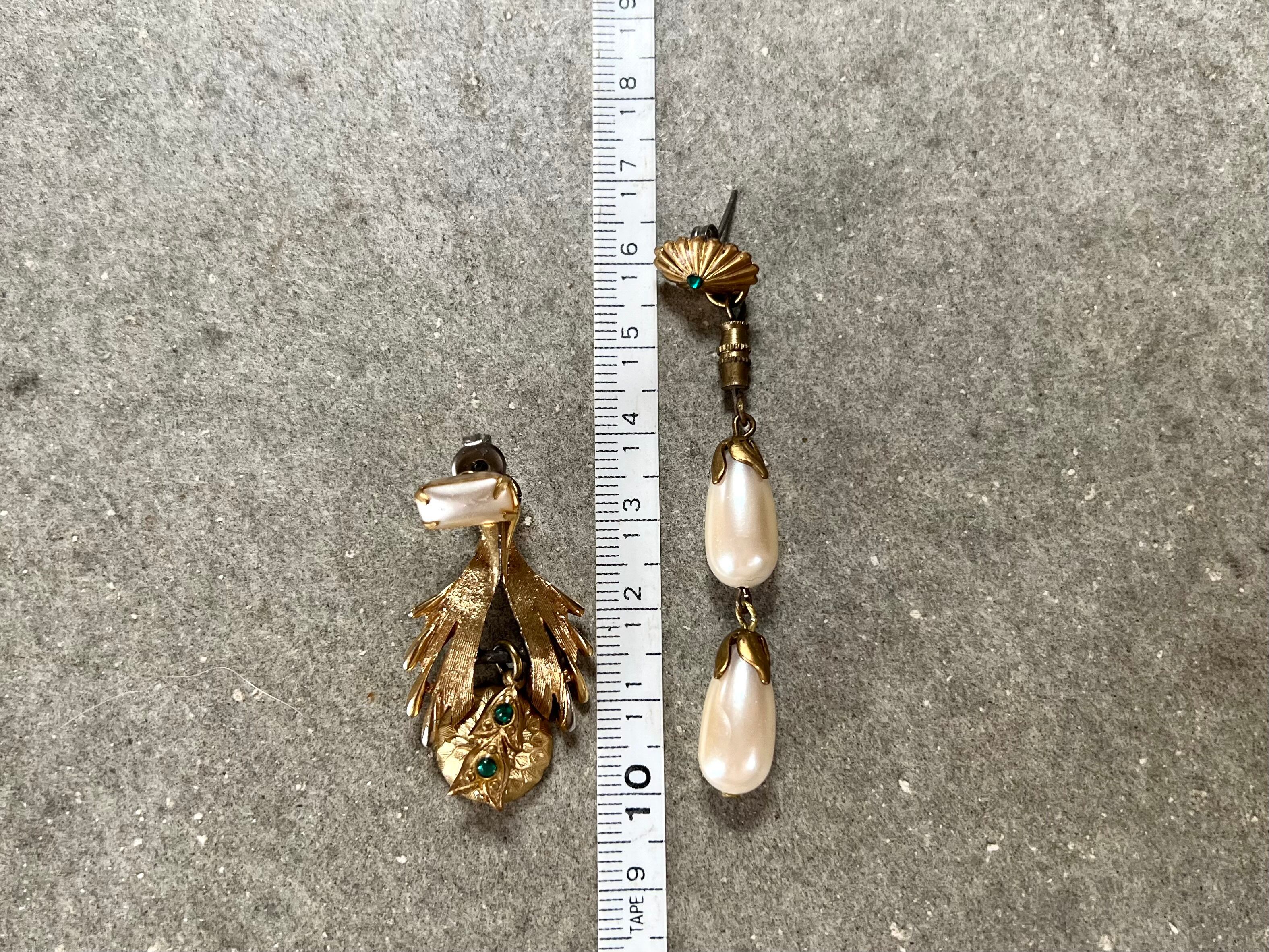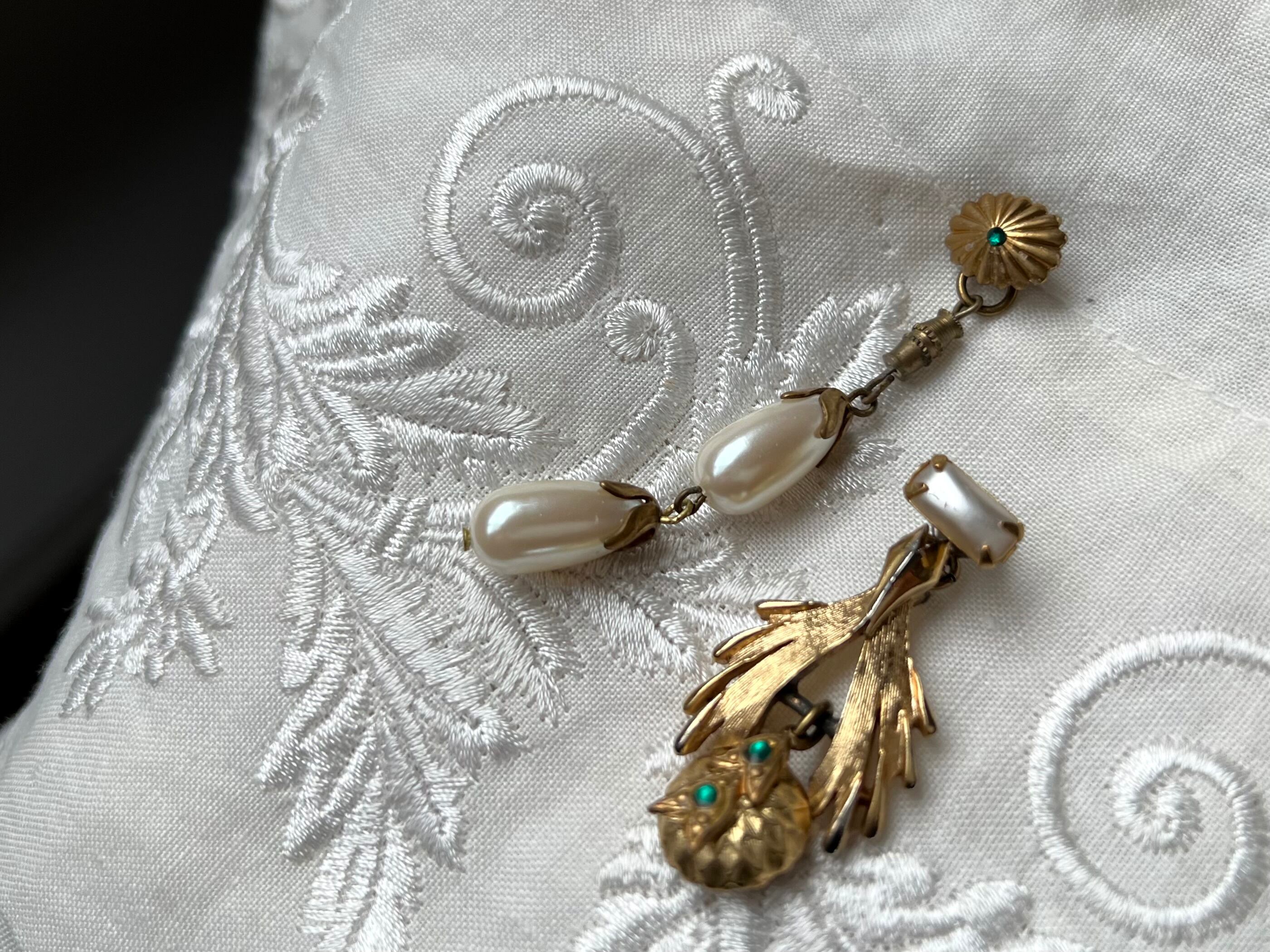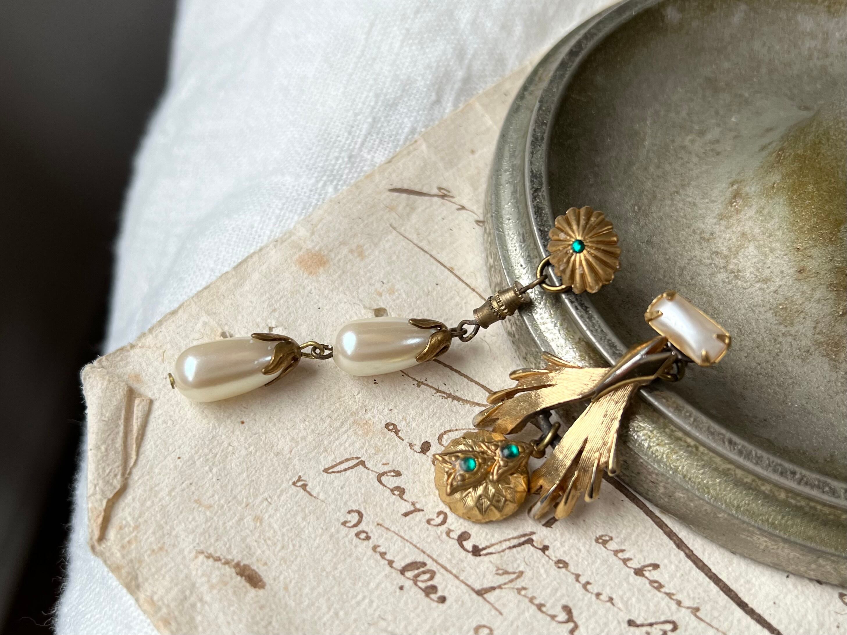 ヴィンテージパーツを使用してアシンメトリーなピアスを作りました。