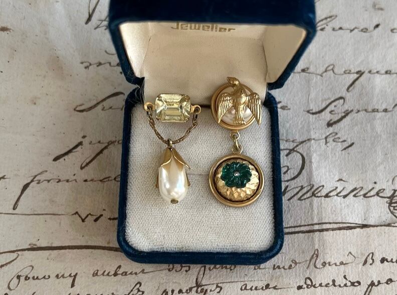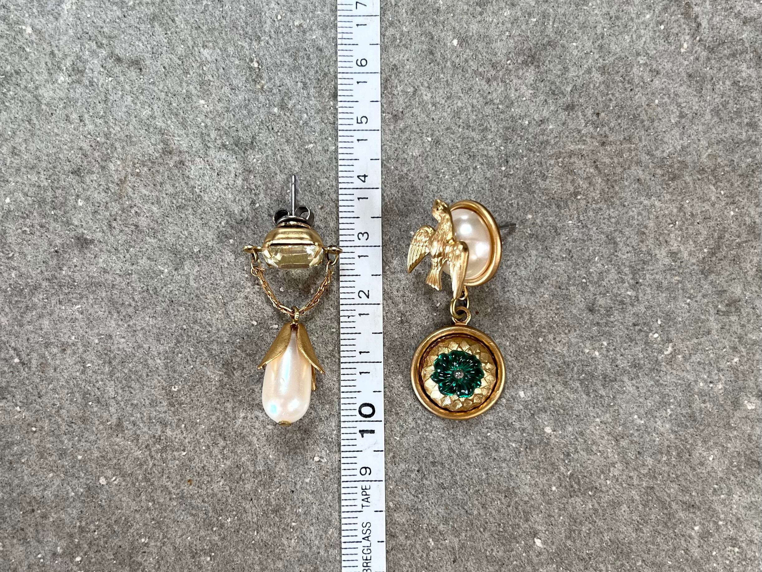ヴィンテージパーツを使用してアシンメトリーなピアスを作りました。