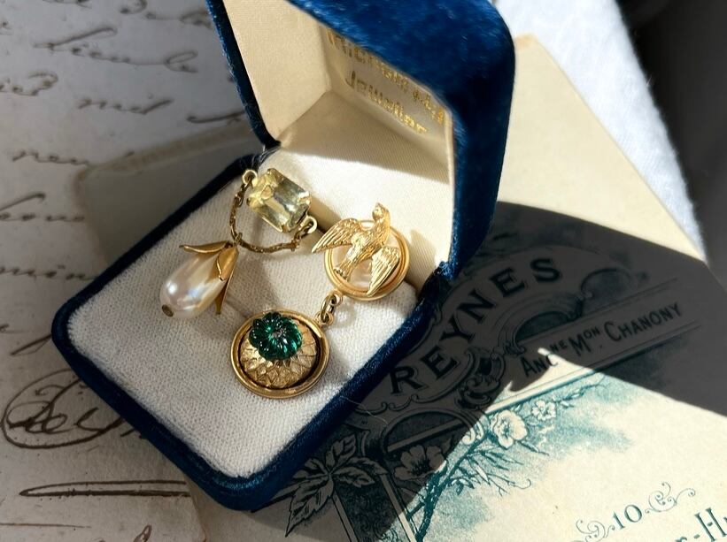 パールベースにシトリンやエメラルドのガラスを配置し、ミリアムハスケルのドープをアクセントに置いています。