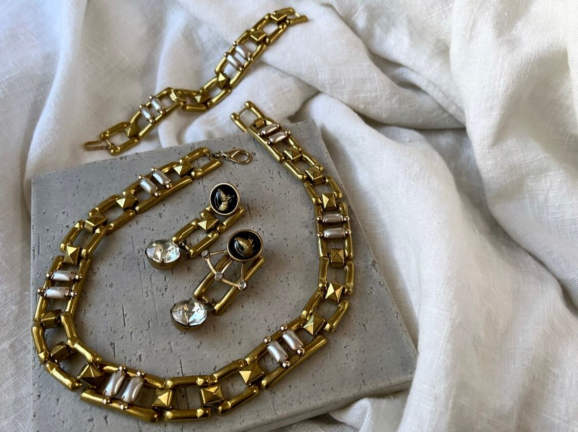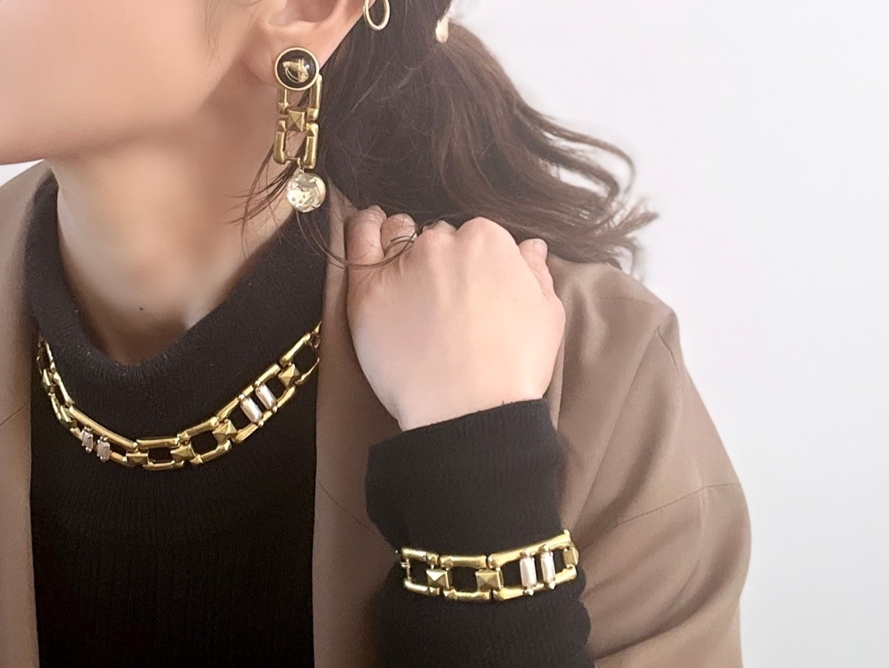 個性的なチェーンにミリアムハスケルのパールを並べて、大胆かつ繊細な雰囲気に仕上げています。
