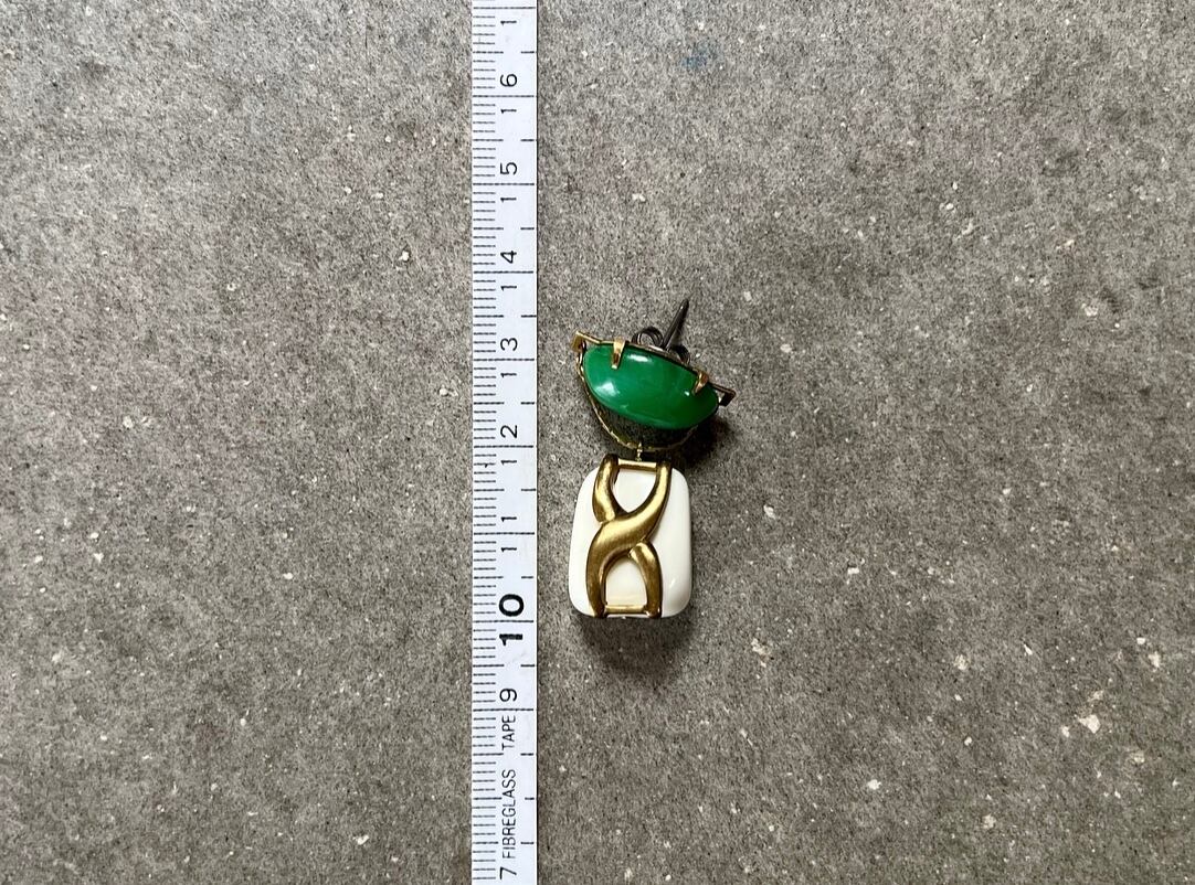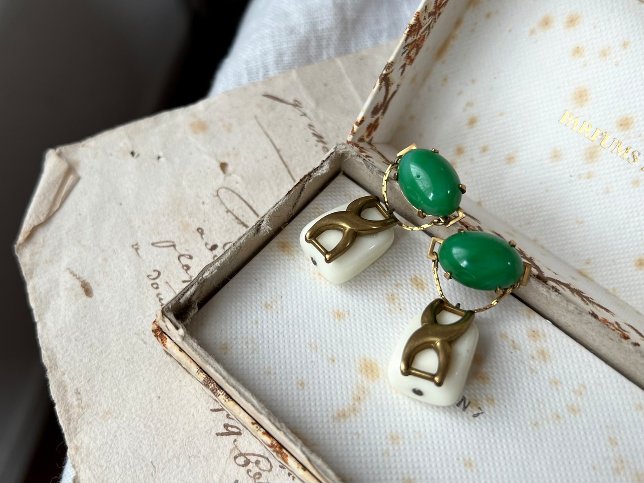 明るいグリーンのカボションとミルキーカラーのビーズを合わせており、今の季節にピッタリの色味に仕上げています。