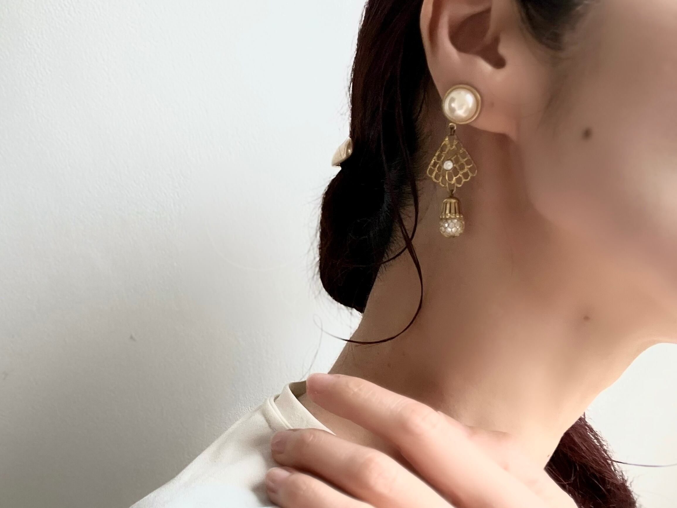 ヴィンテージパーツを使用してアシンメトリーなピアスを作りました。