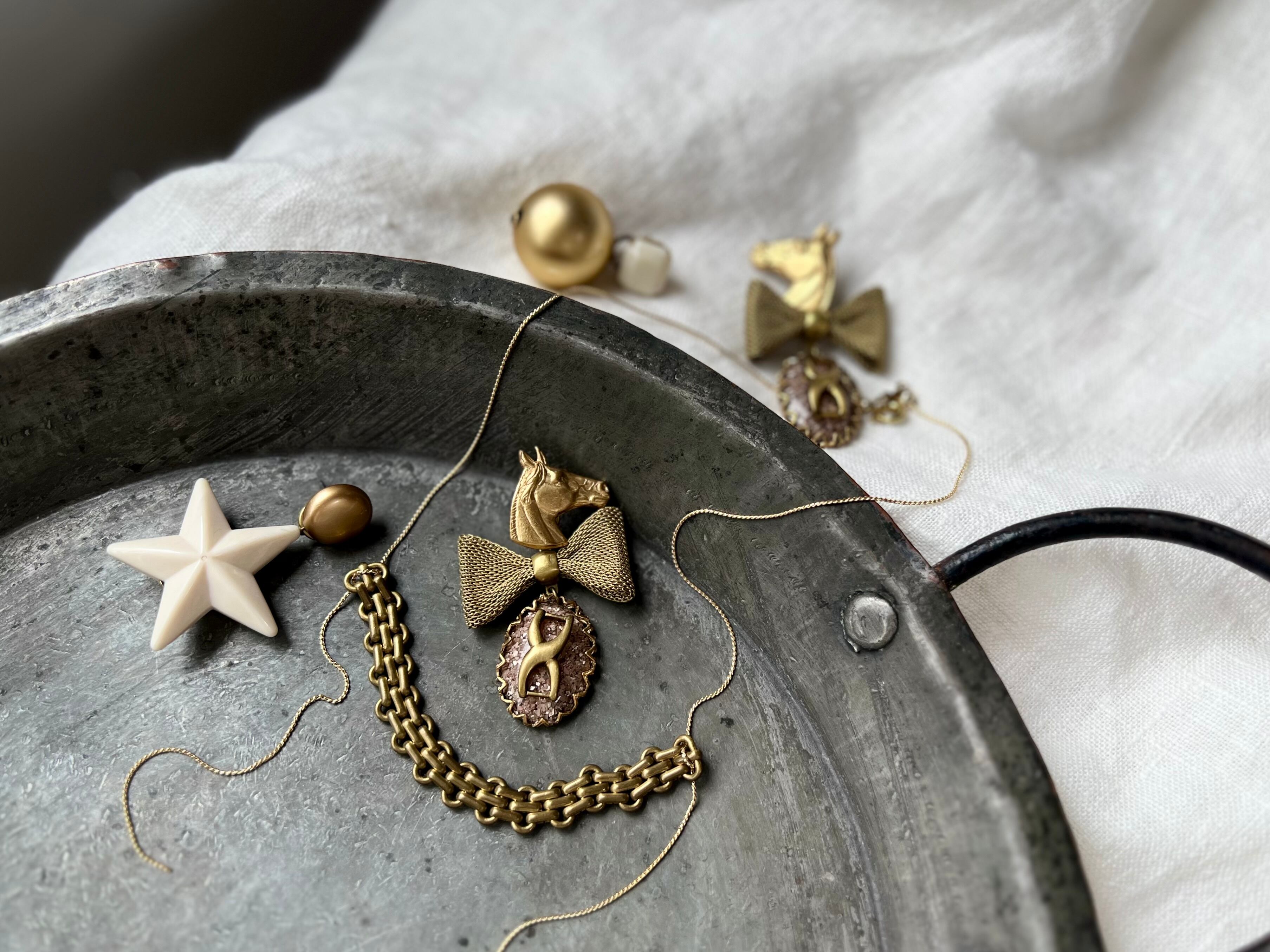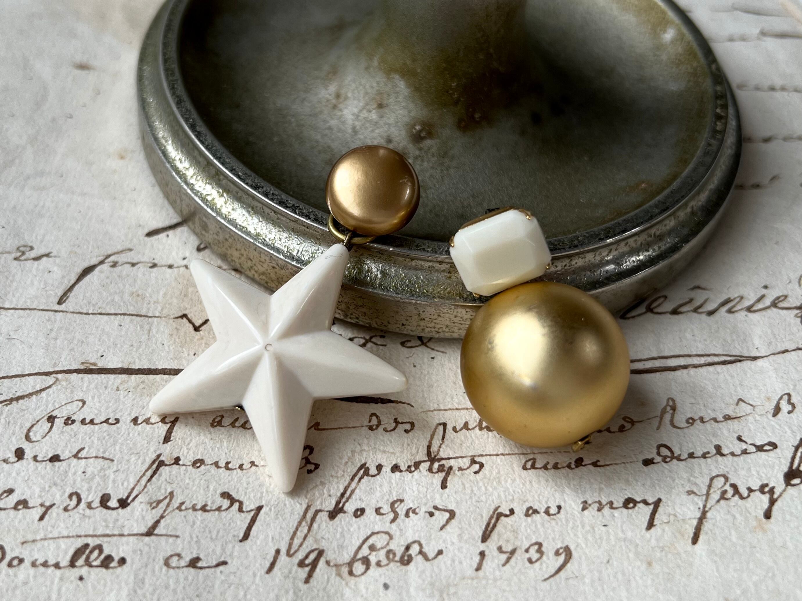 ヴィンテージパーツを使用してアシンメトリーなピアスを作りました。