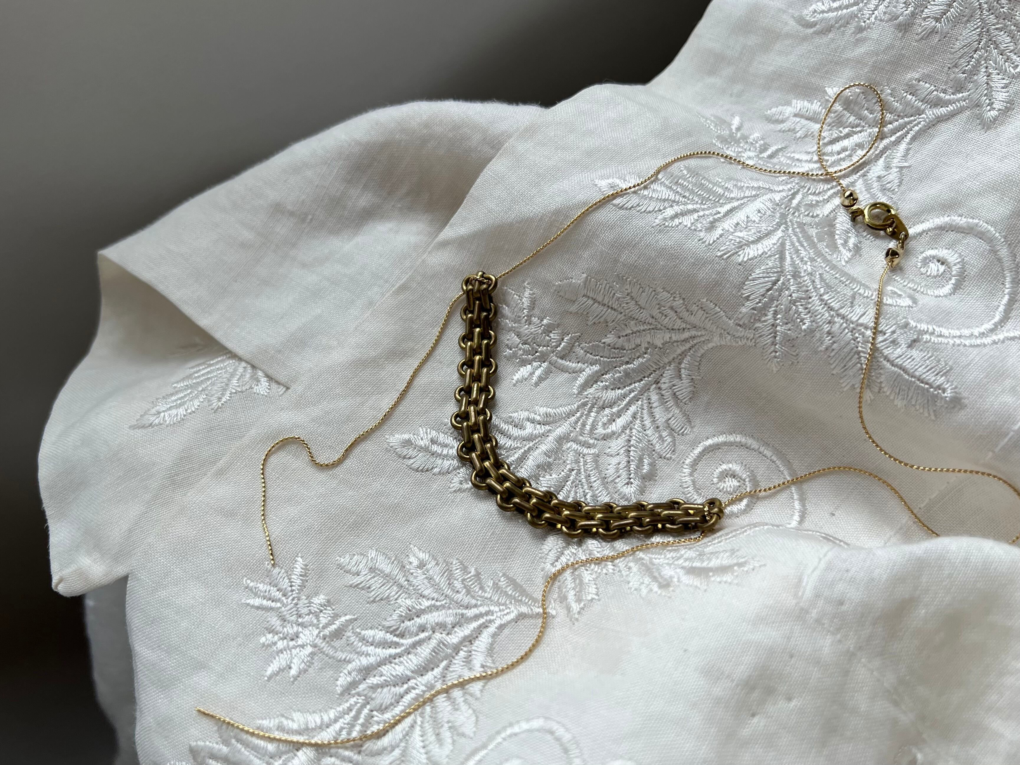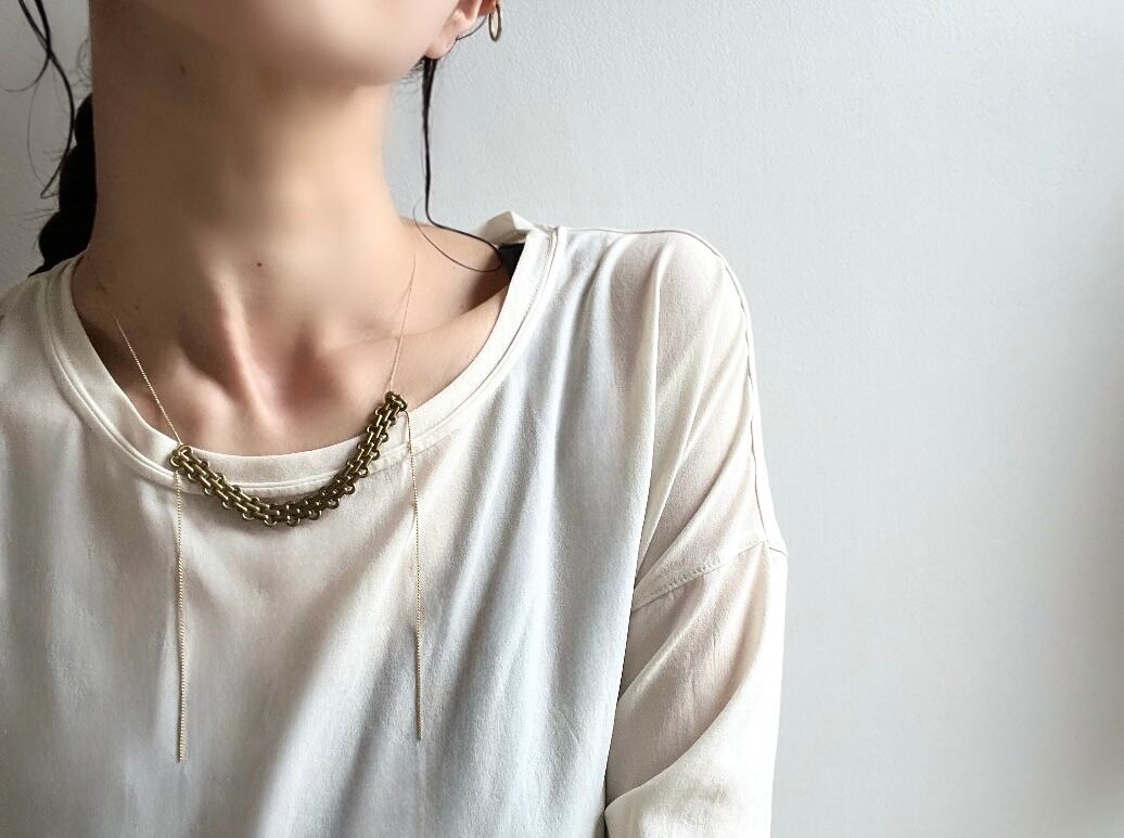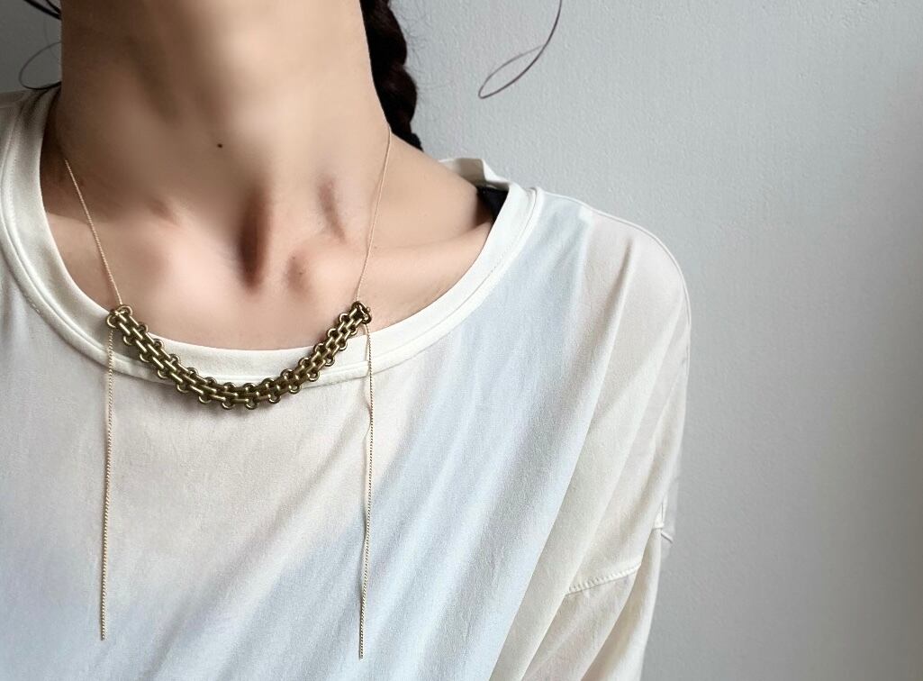 少しごつめの味わい深いヴィンテージチェーンをアクセントに、細いチェーンを組んで女性らしい雰囲気にまとめました。