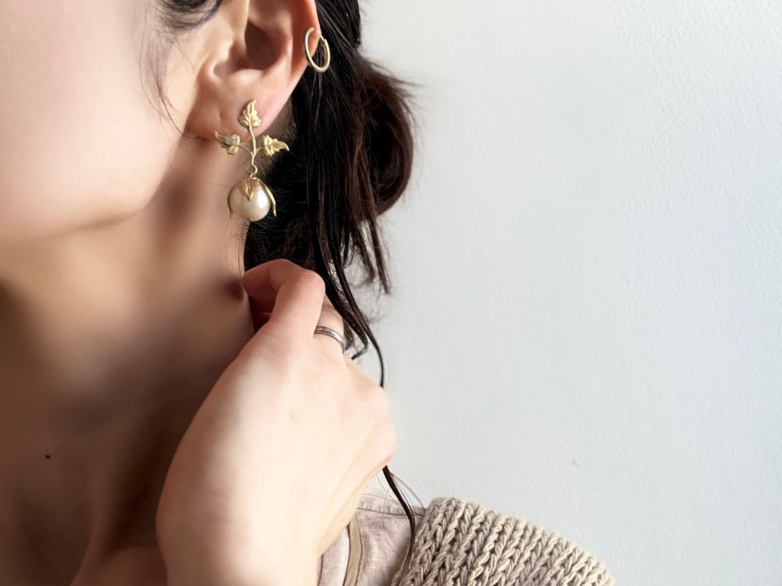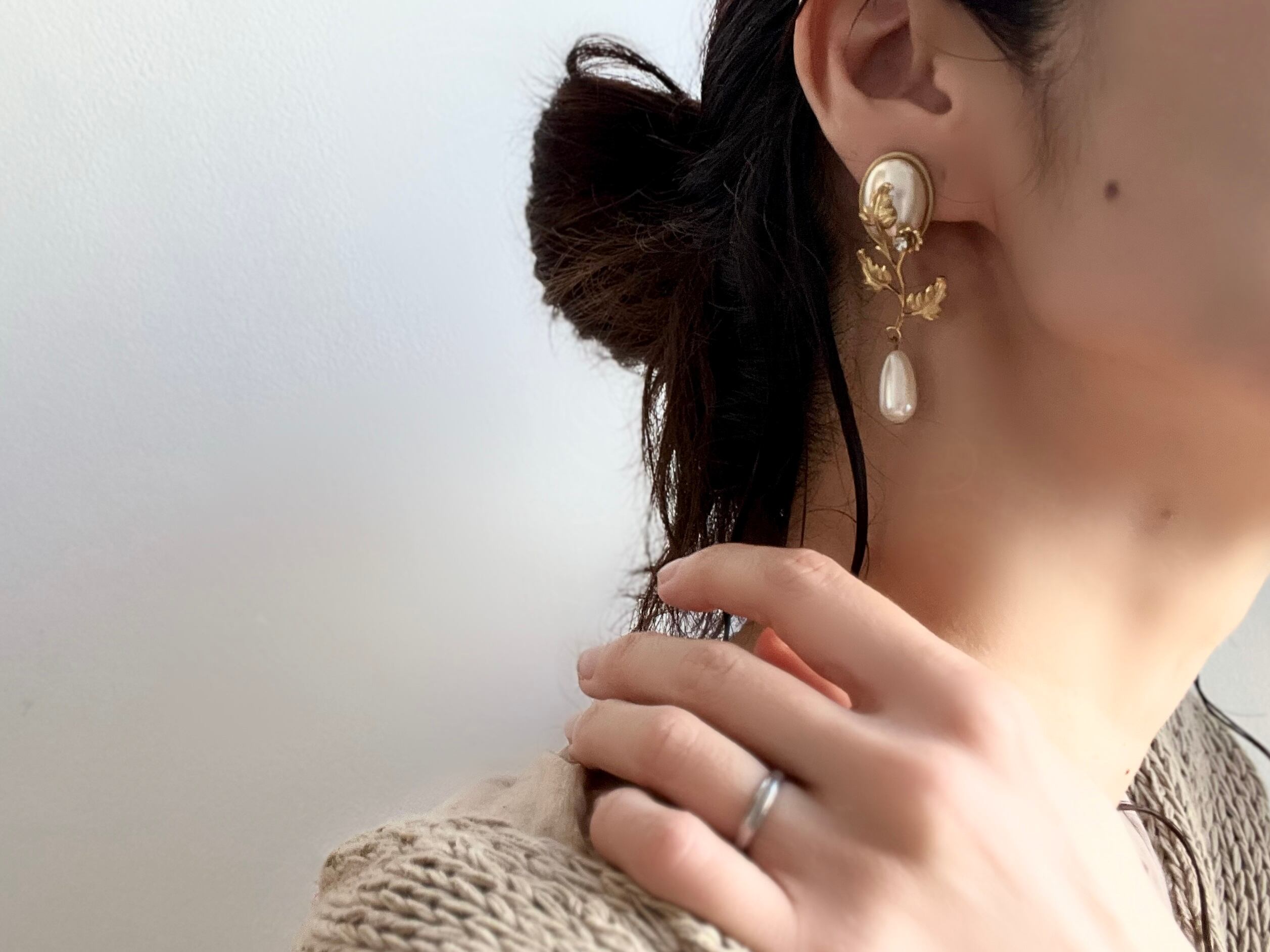 全体的なまとまりはありますが、ひとつひとつ違うデザインのパールとボタニカルパーツを組み合わせて、スワロフスキーのアクセントをつけています。
