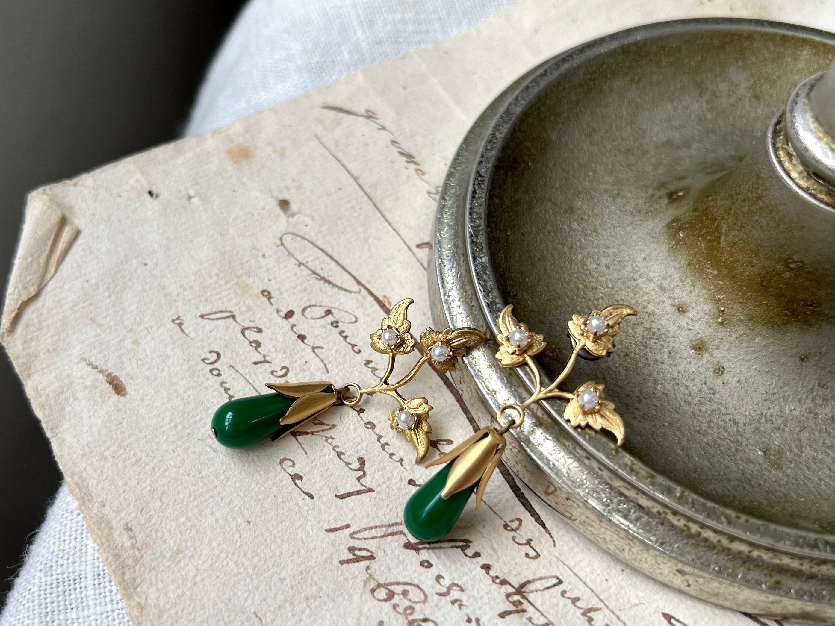 パールを散らしたボタニカルパーツをカボションに、グリーンのドロップビーズを添えました。