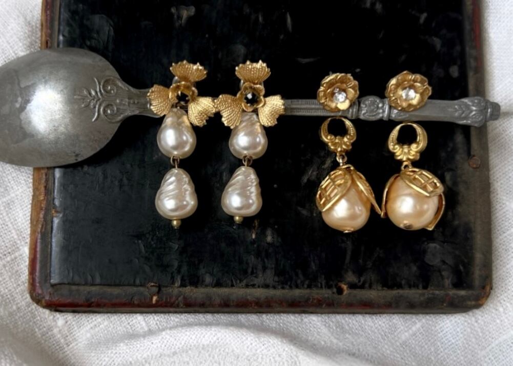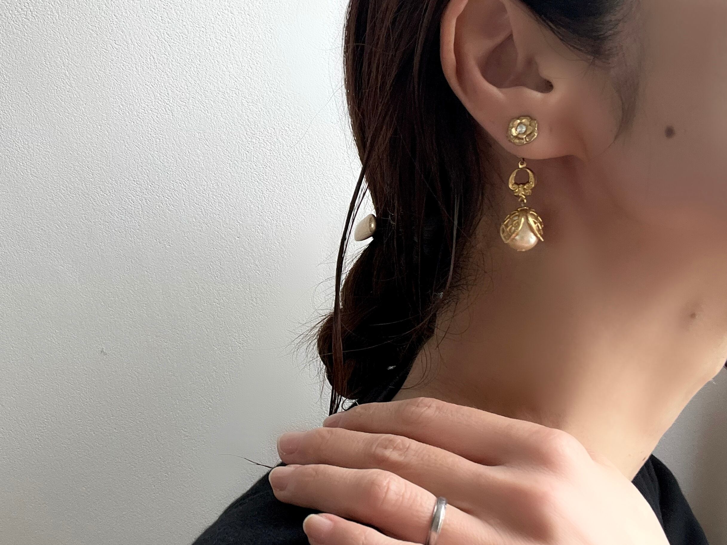小花を重ねたカボションにミリアムハスケルのボタニカルパーツで包み込んだガラスパールを合わせた、上品かつロマンチックな雰囲気のあるデザインです。