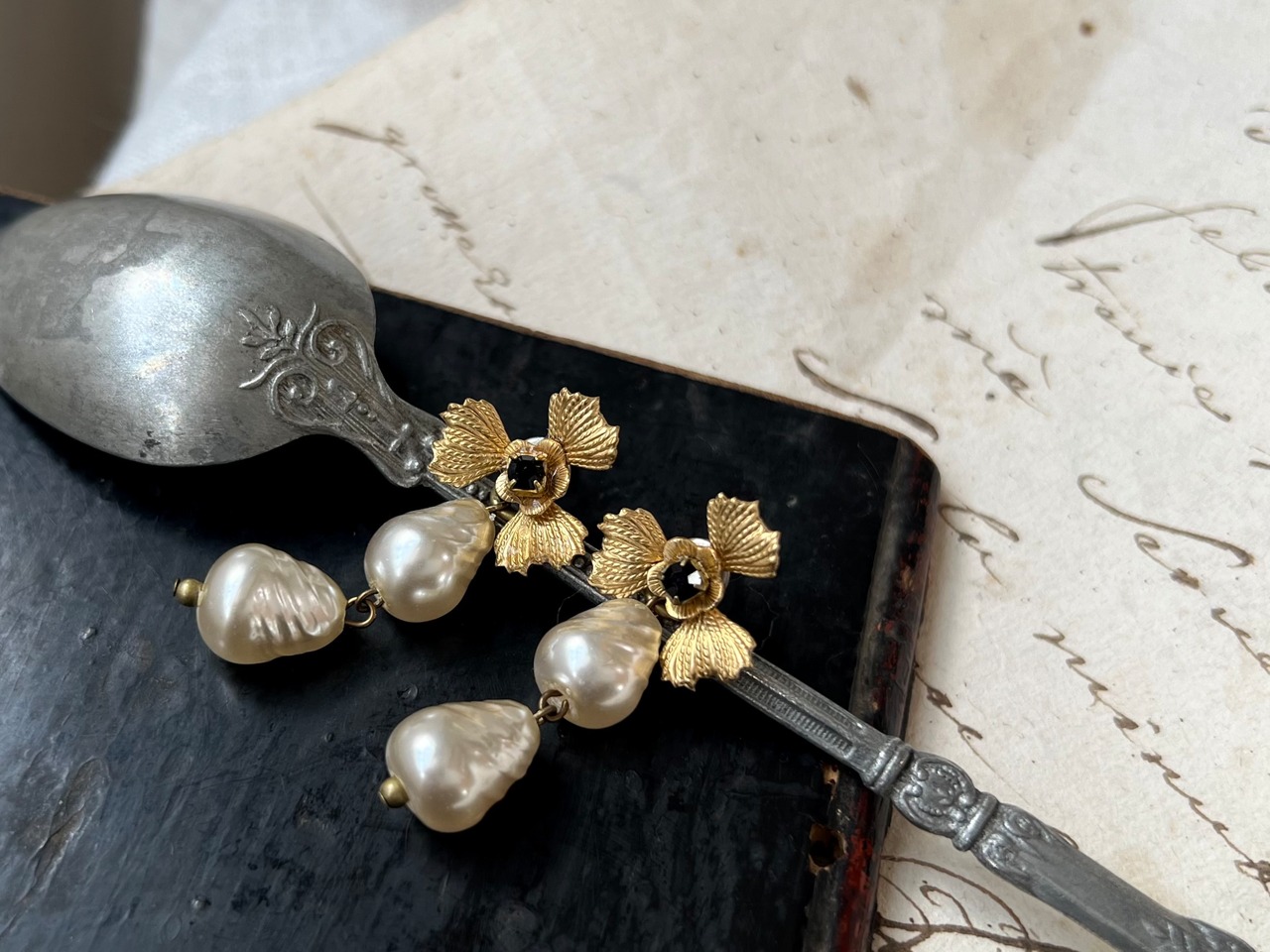 小花を重ねたカボションにドロップシェイプのガラスパールを連ねました。