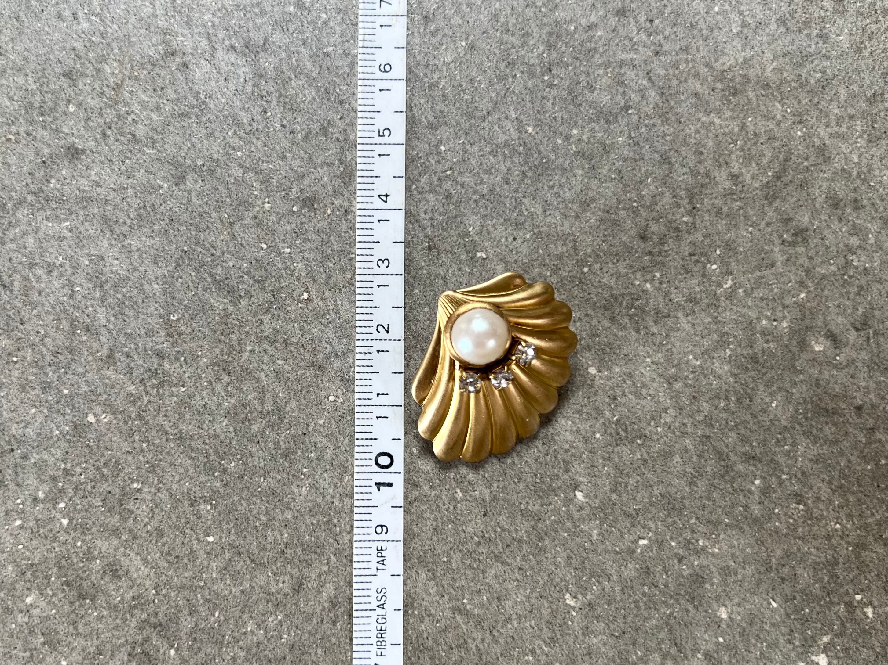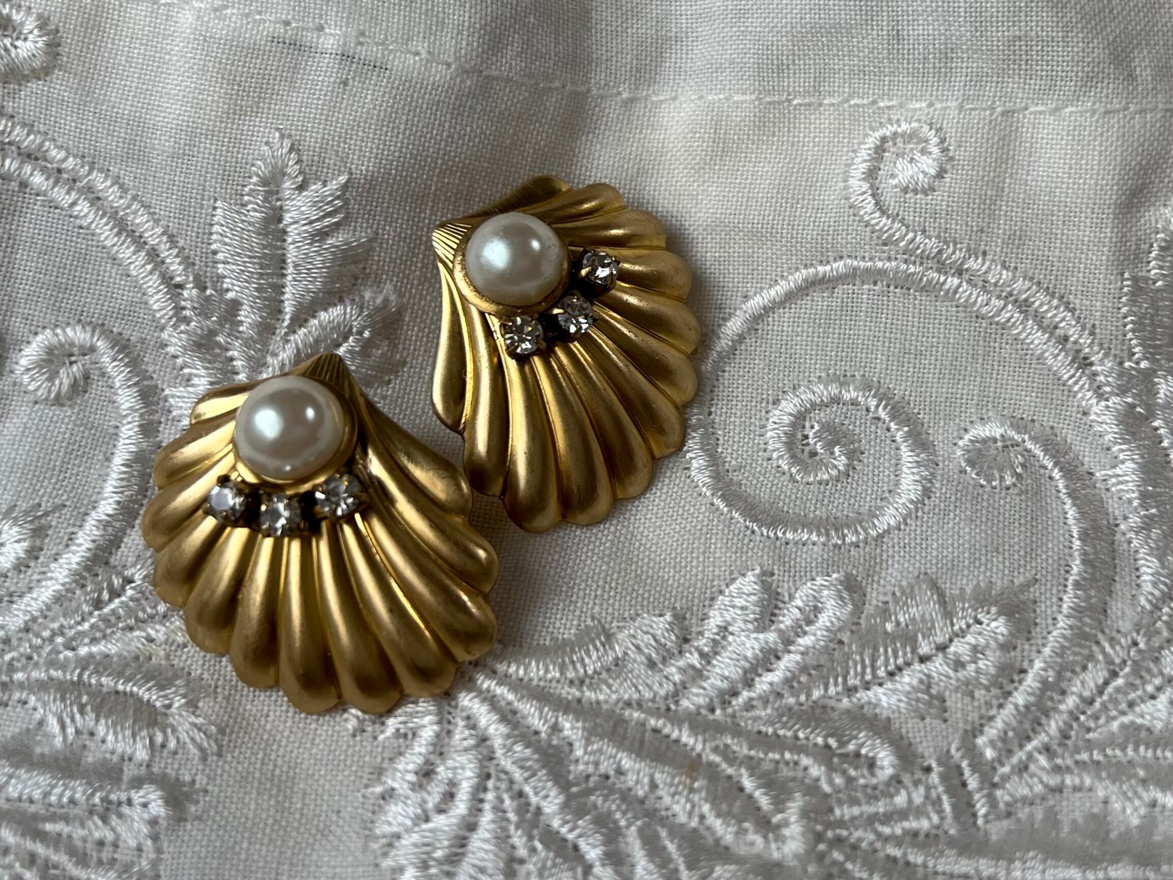 シェル型のブラスに小さなパールとスワロフスキーを並べています。