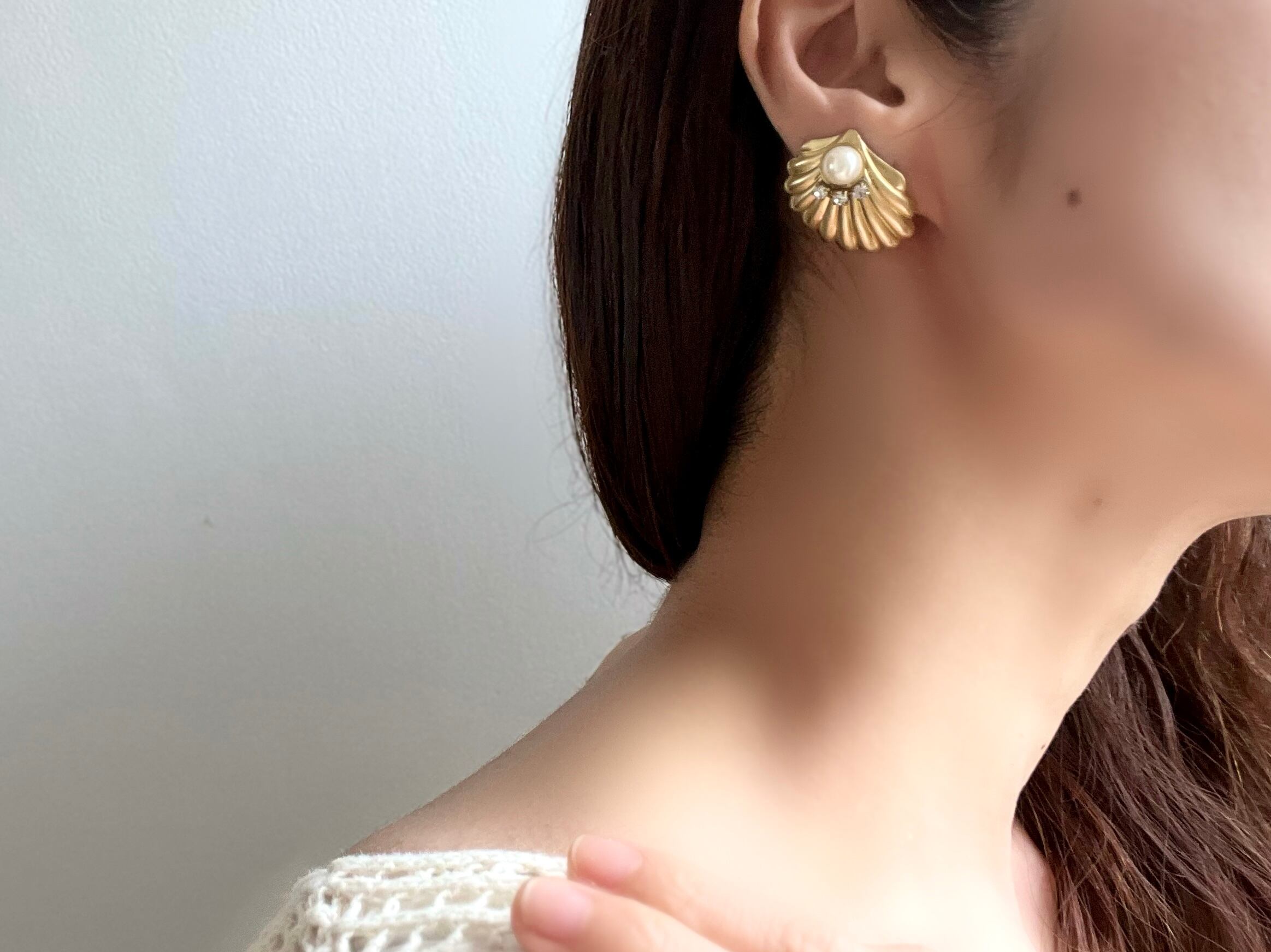 シンプルなフォルムながらもシェルの存在感とスワロフスキーの輝きが華やかな印象です。