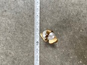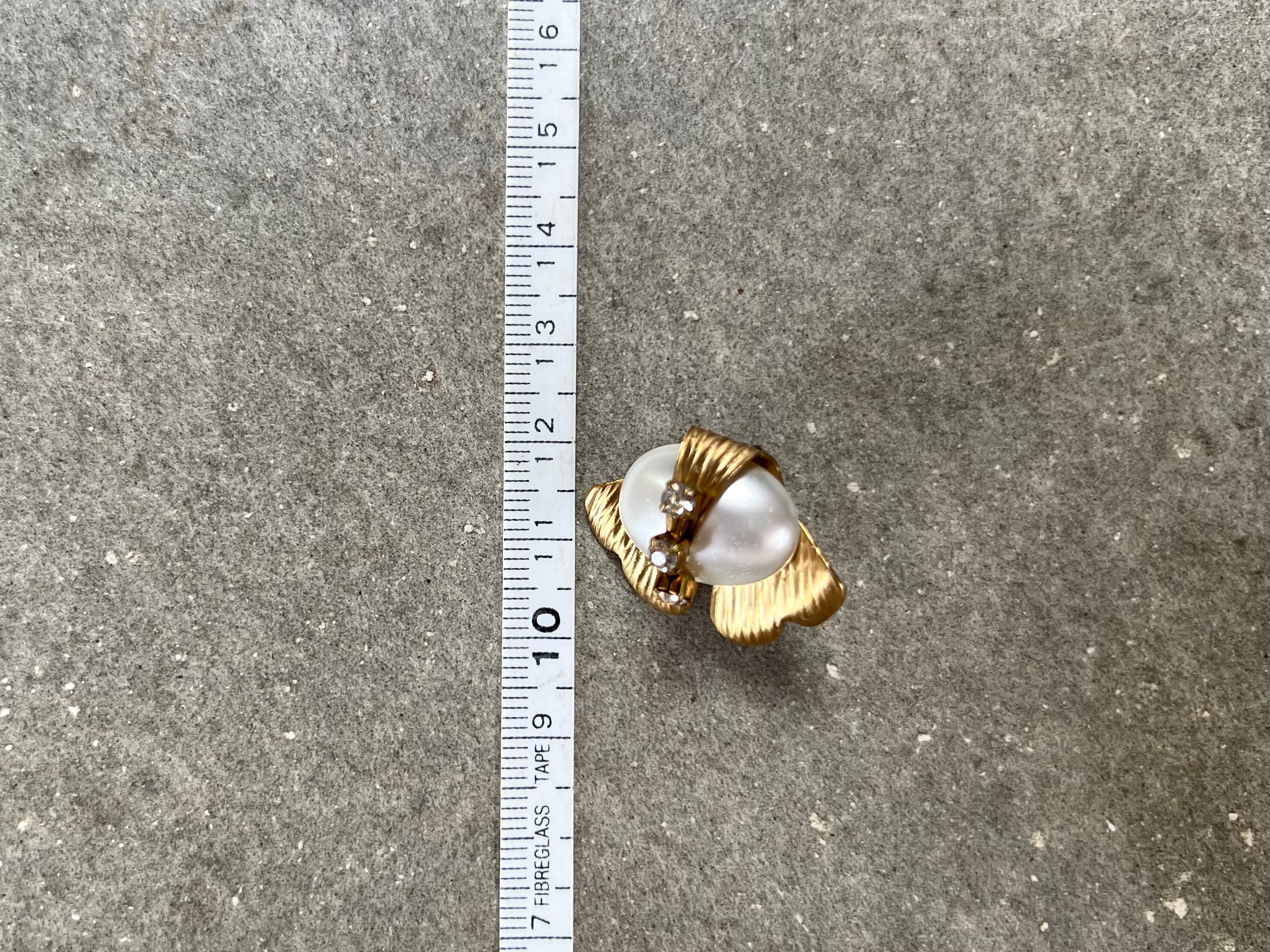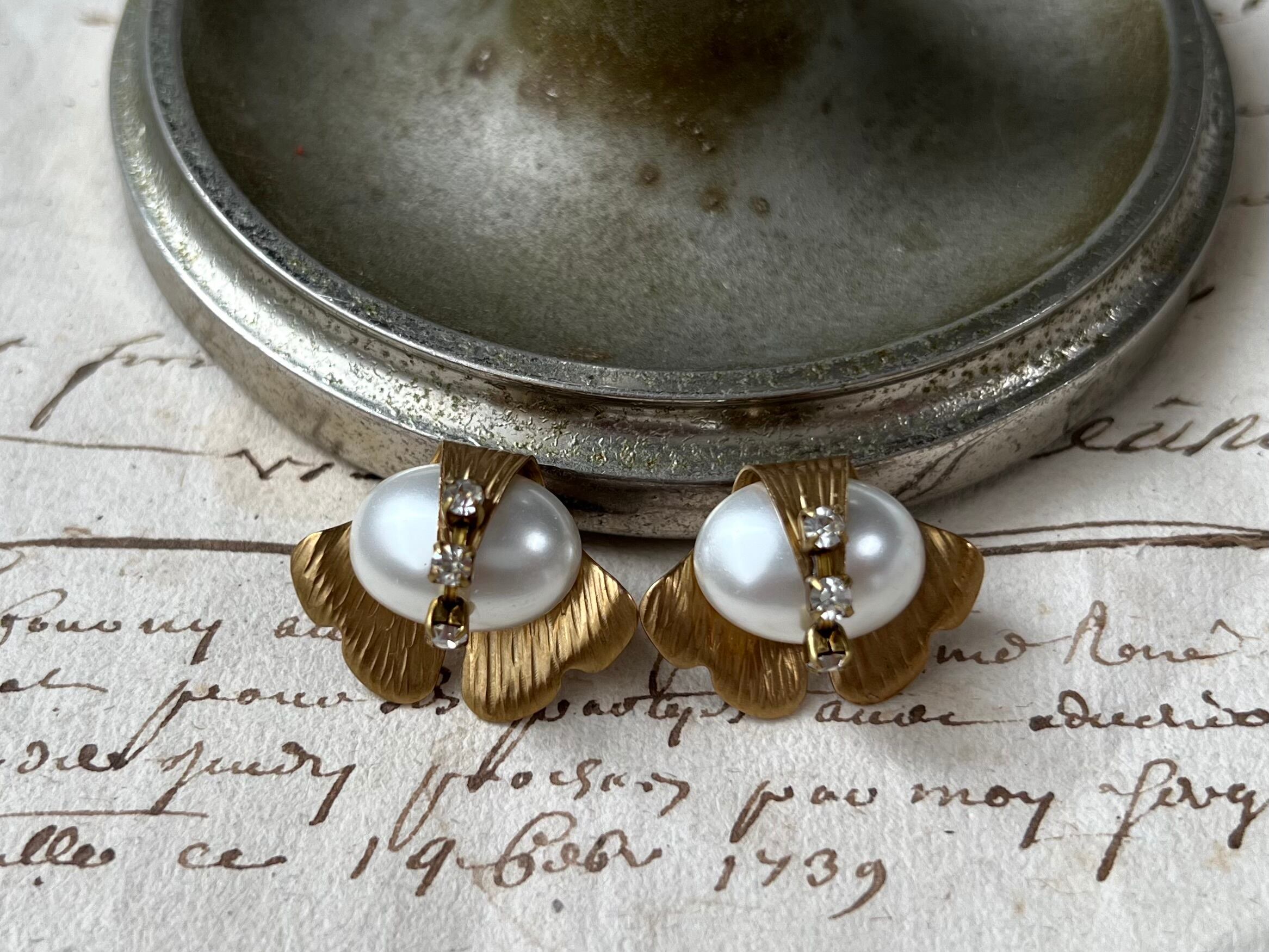 純白のガラスパールをリーフで包んでスワロフスキーを添えています。