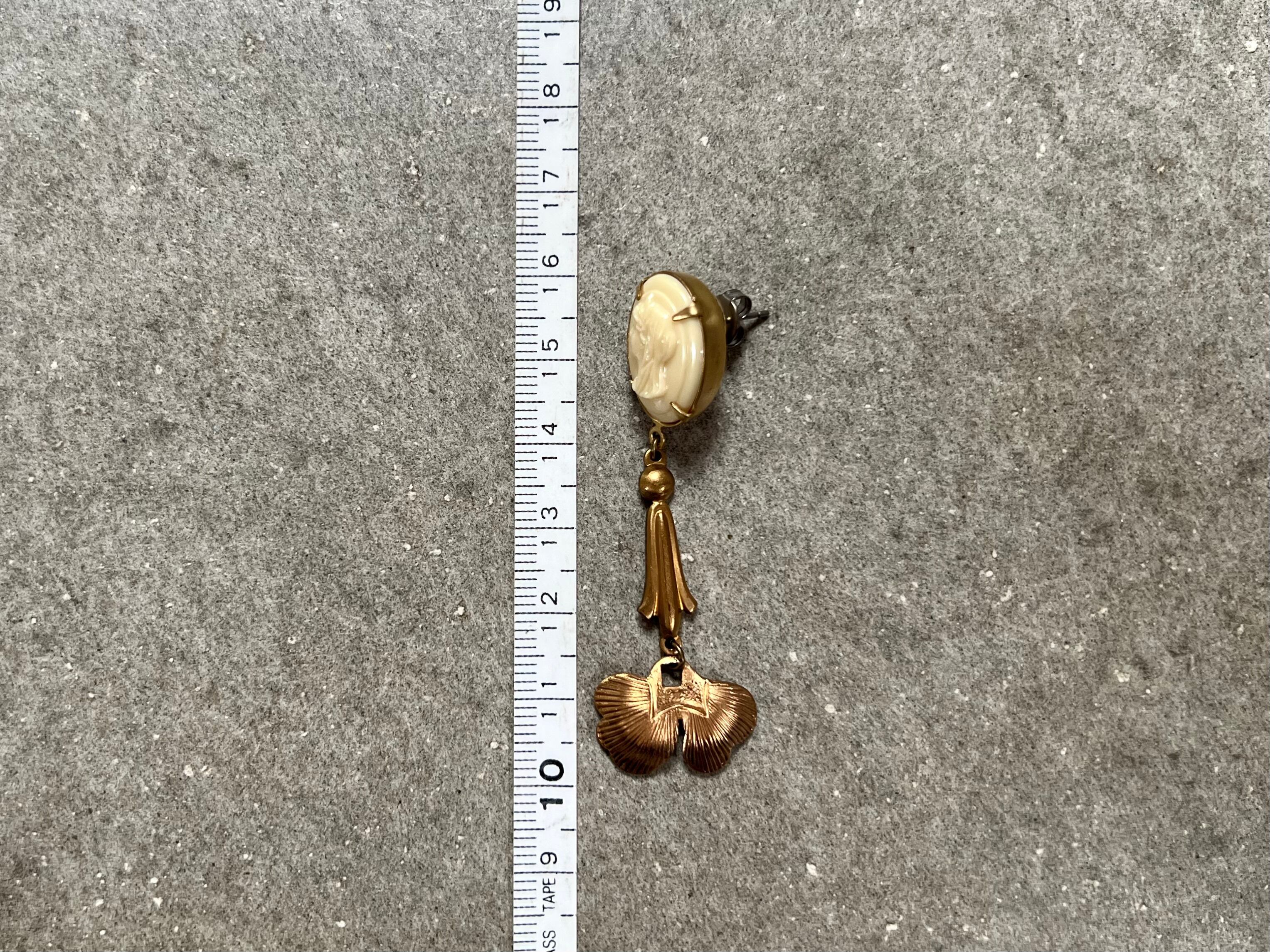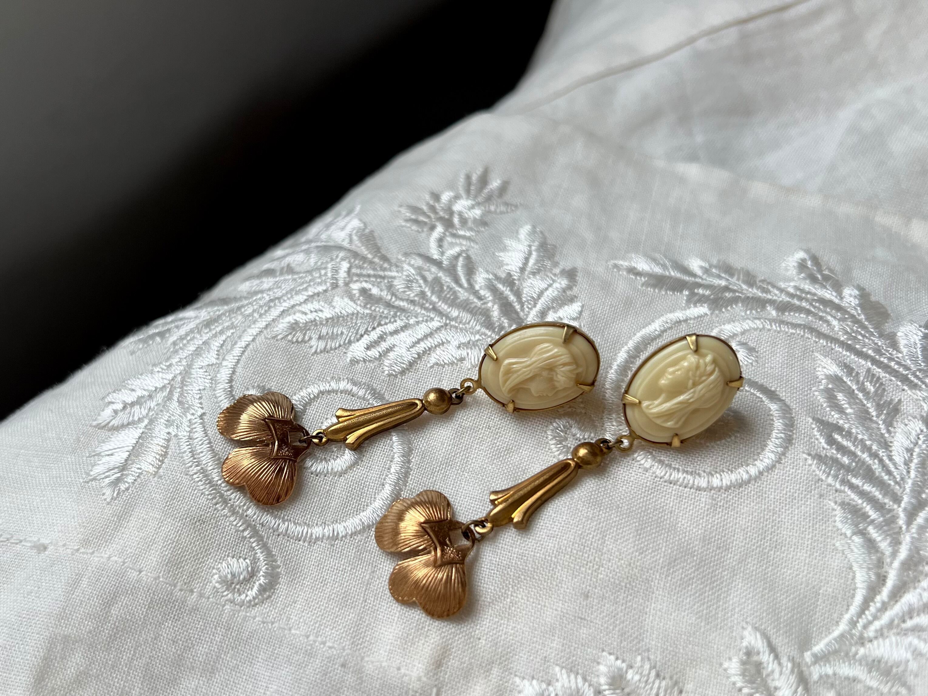 マイルドなアイボリーカラーのカメオをカボションにクラシカルかつ個性的なブラスパーツを添えています。