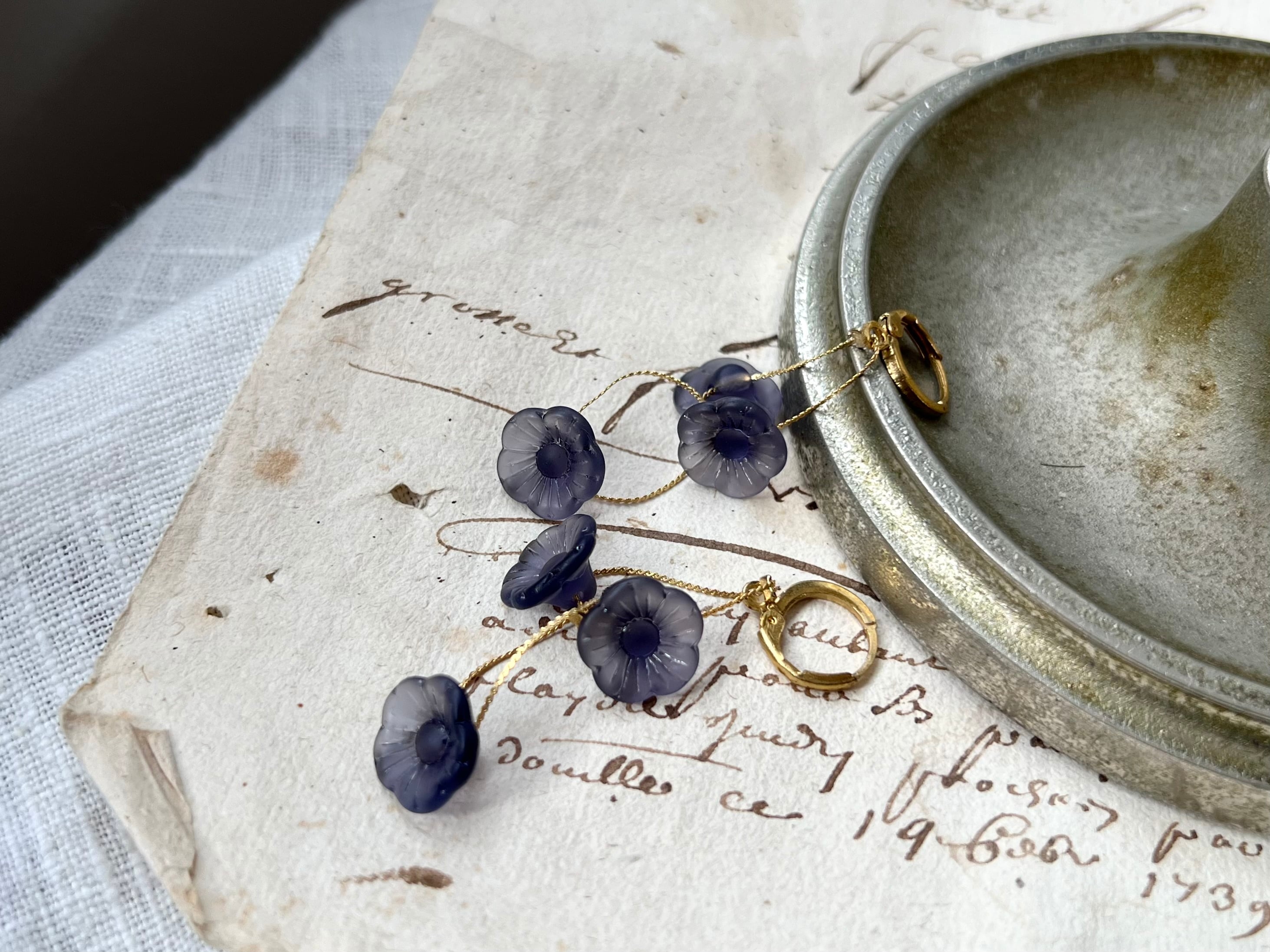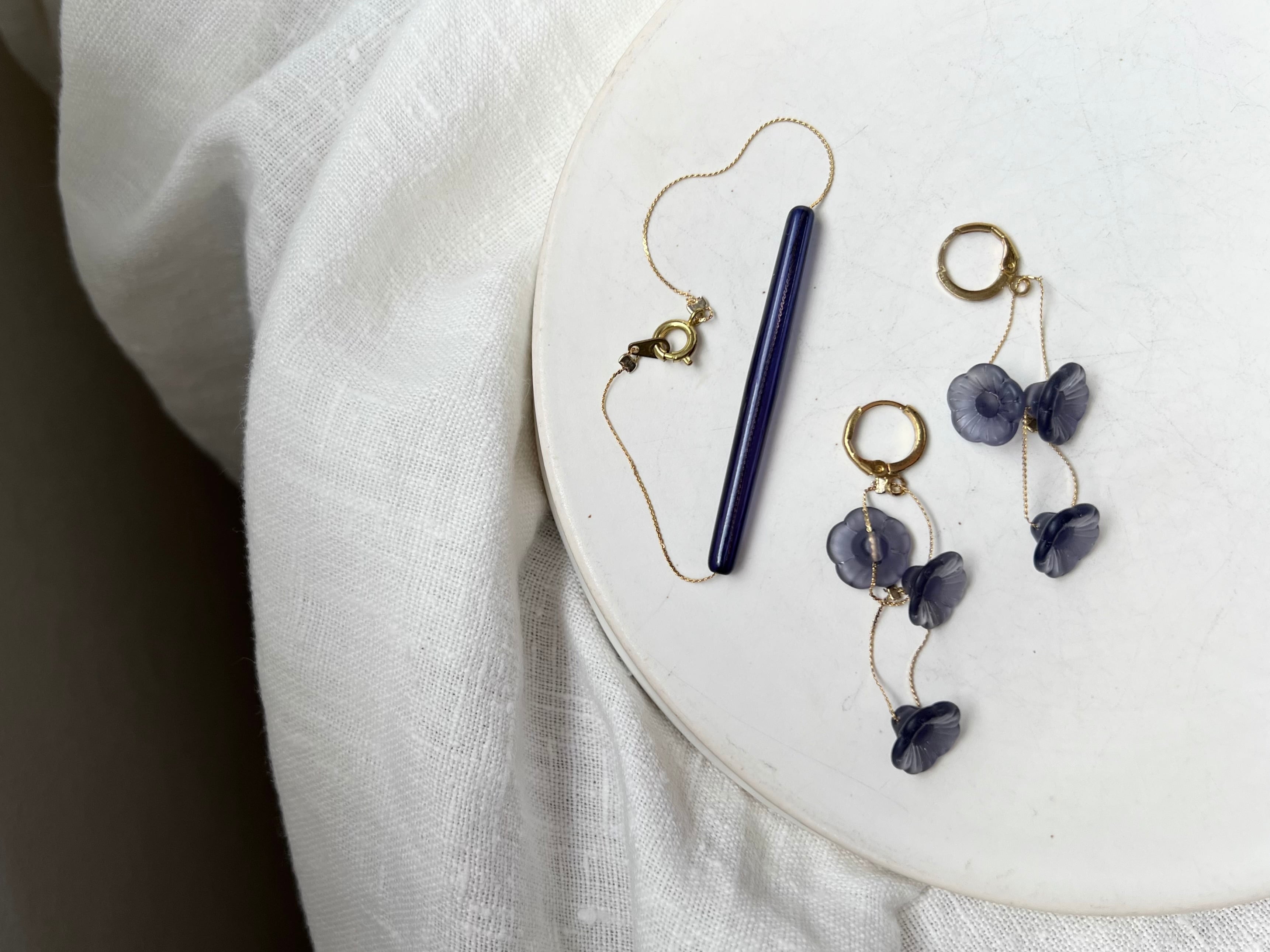 ディープブルーのフラワーガラスを繊細なチェーンで連ねています。